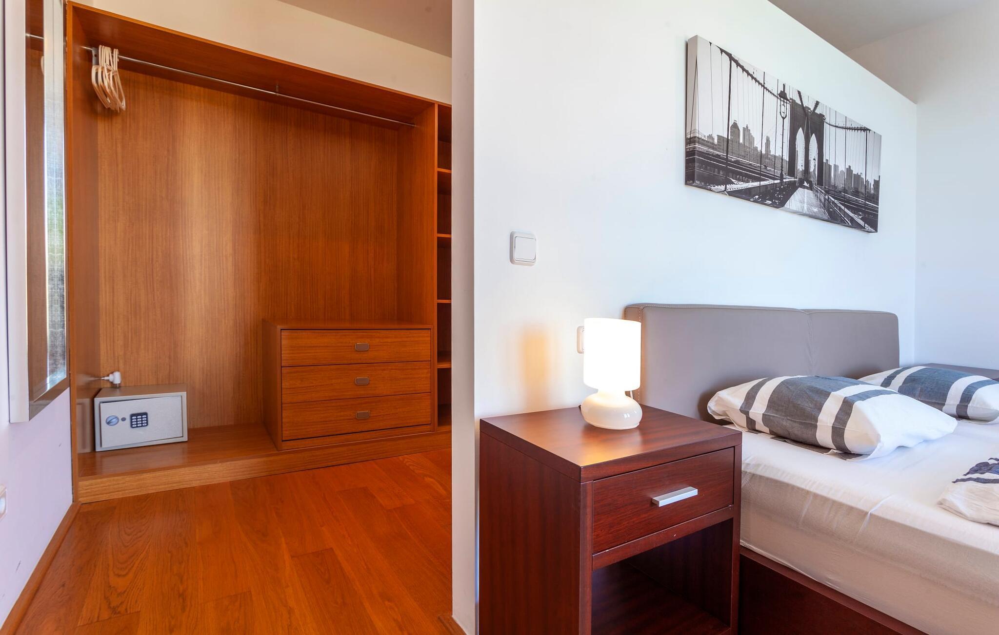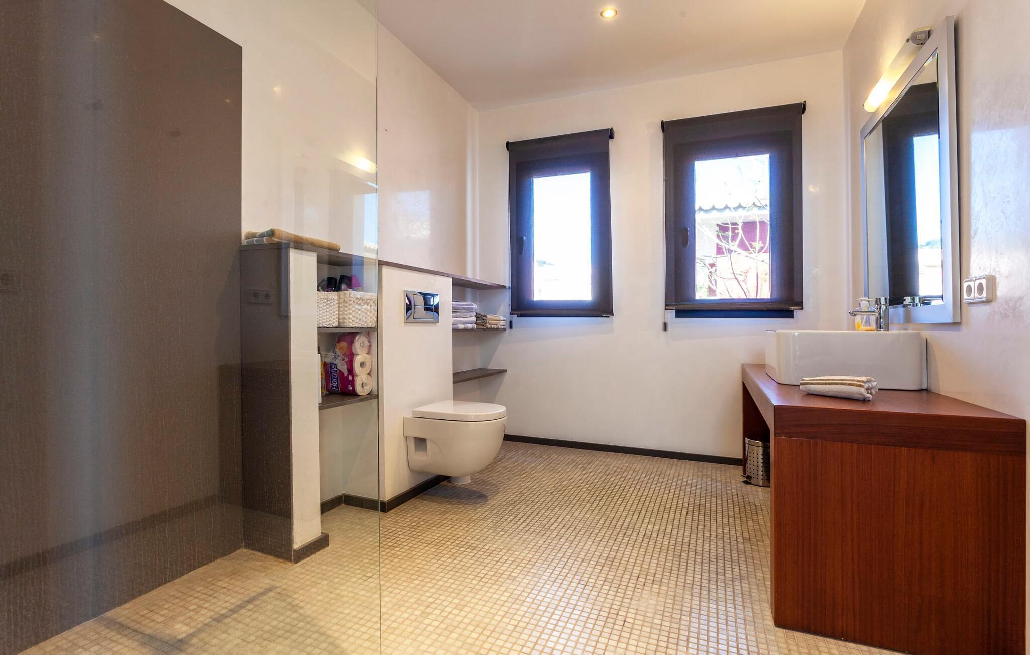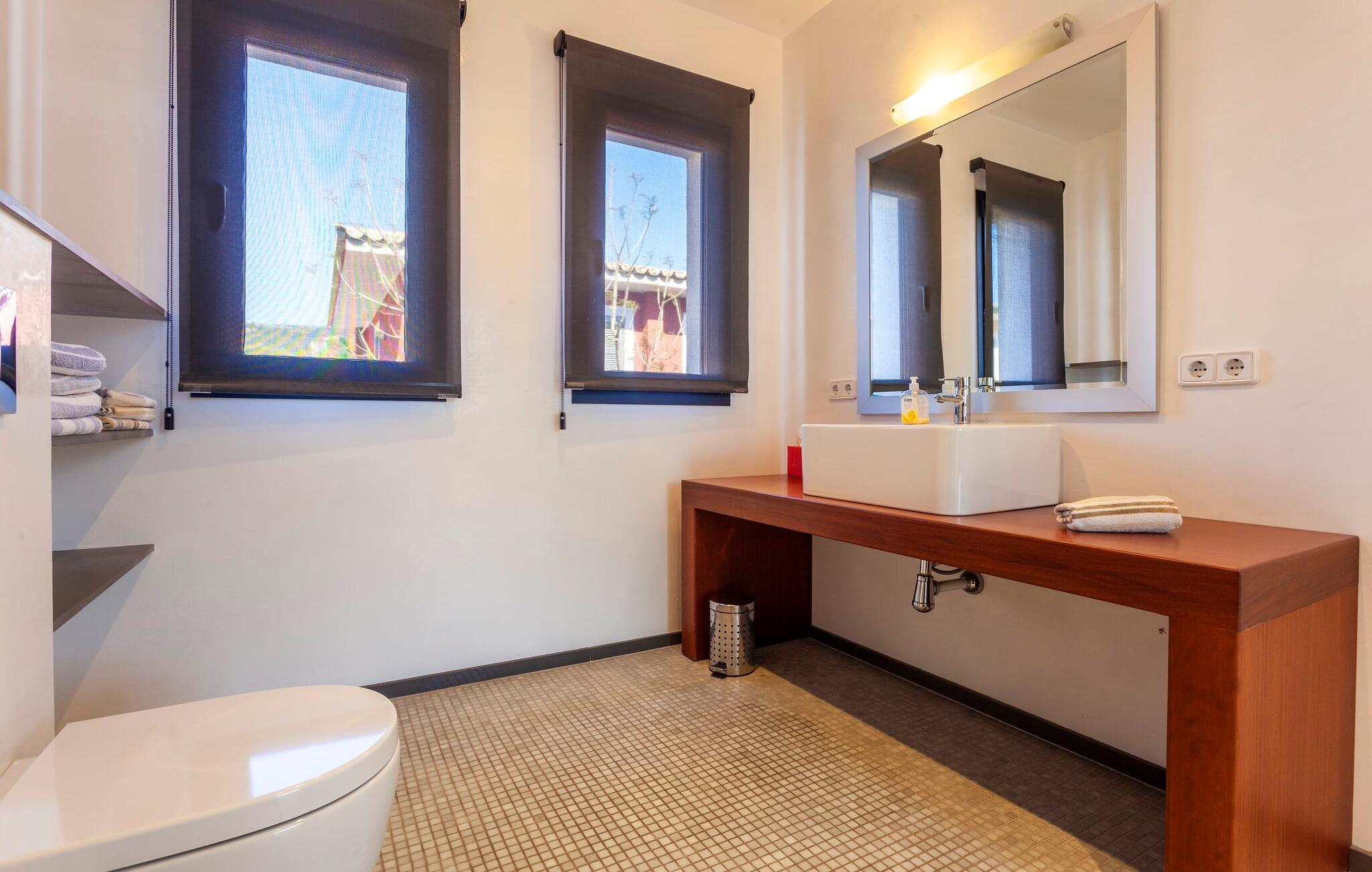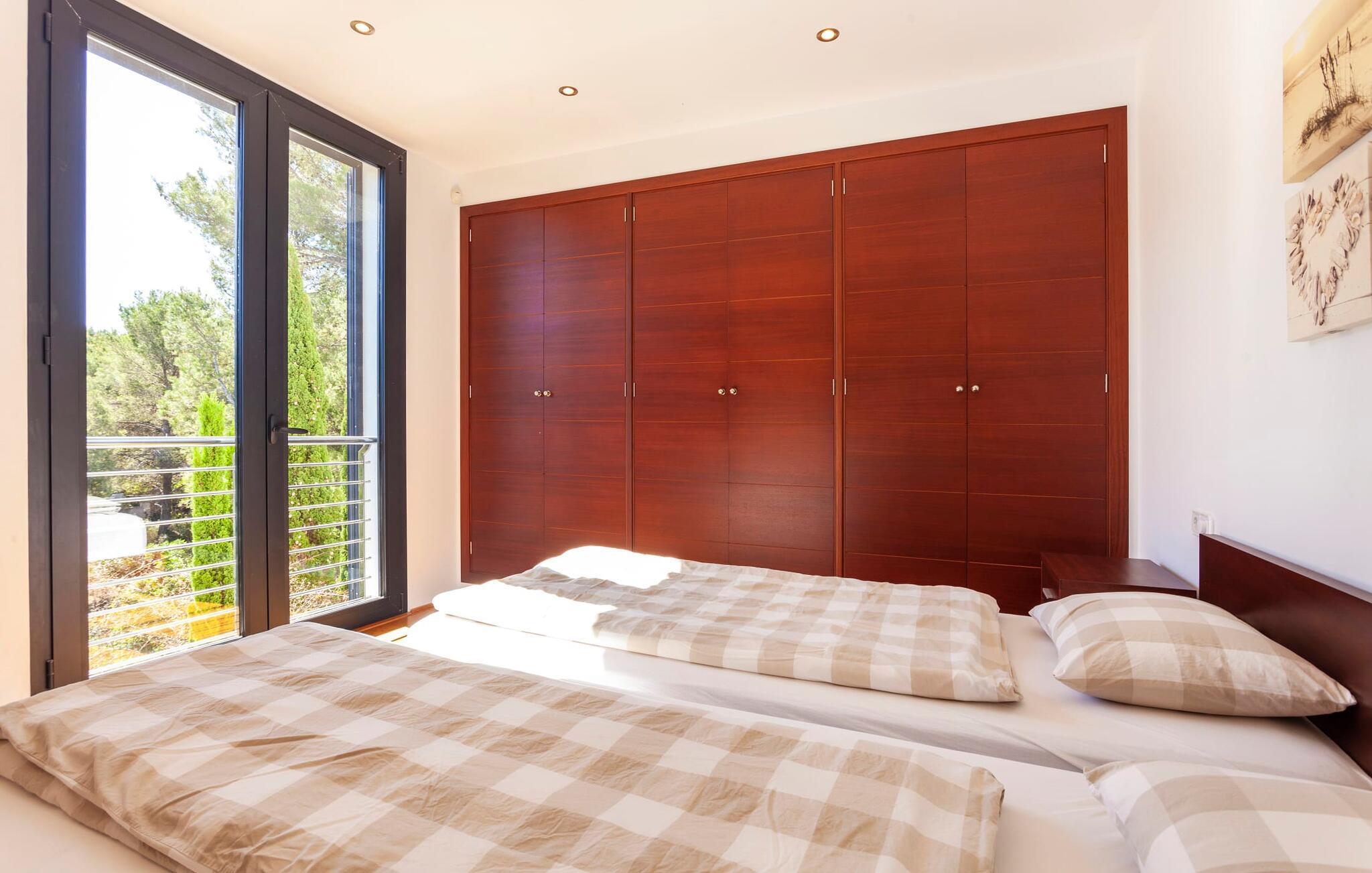 Das Innere der voll klimatisierten Villa passt perfekt zum modernen Äußeren. Klare Linien und harmonische, natürliche Farben dominieren, und dank des geschulten Blicks der Dekorateure für Details wie Möbel, Wohnaccessoires und Stoffe wurde eine zurückhaltende, aber einladend warme Wohnatmosphäre geschaffen. Sowohl Paare als auch Familien mit Kindern fühlen sich hier sofort zuhause. Alle Räume sind durch große Fenster wunderbar hell. Im Erdgeschoss befindet sich ein Doppelzimmer mit Bad sowie die schicke graue Küche mit kleinem Tisch für den Morgenkaffee und der offene Wohn- und Essbereich. Während das große Sofa dazu einlädt, stundenlang zu faulenzen und fernzusehen, finden Sie direkt daneben einen langen Esstisch mit eleganten Stühlen mit Satinpolsterung, der im stimmungsvollen Licht des Kronleuchters erstrahlt. Hier können Sie in Ruhe zusammensitzen, schmackhafte Mahlzeiten genießen und die erlebnisreichen Urlaubstage Revue passieren lassen.