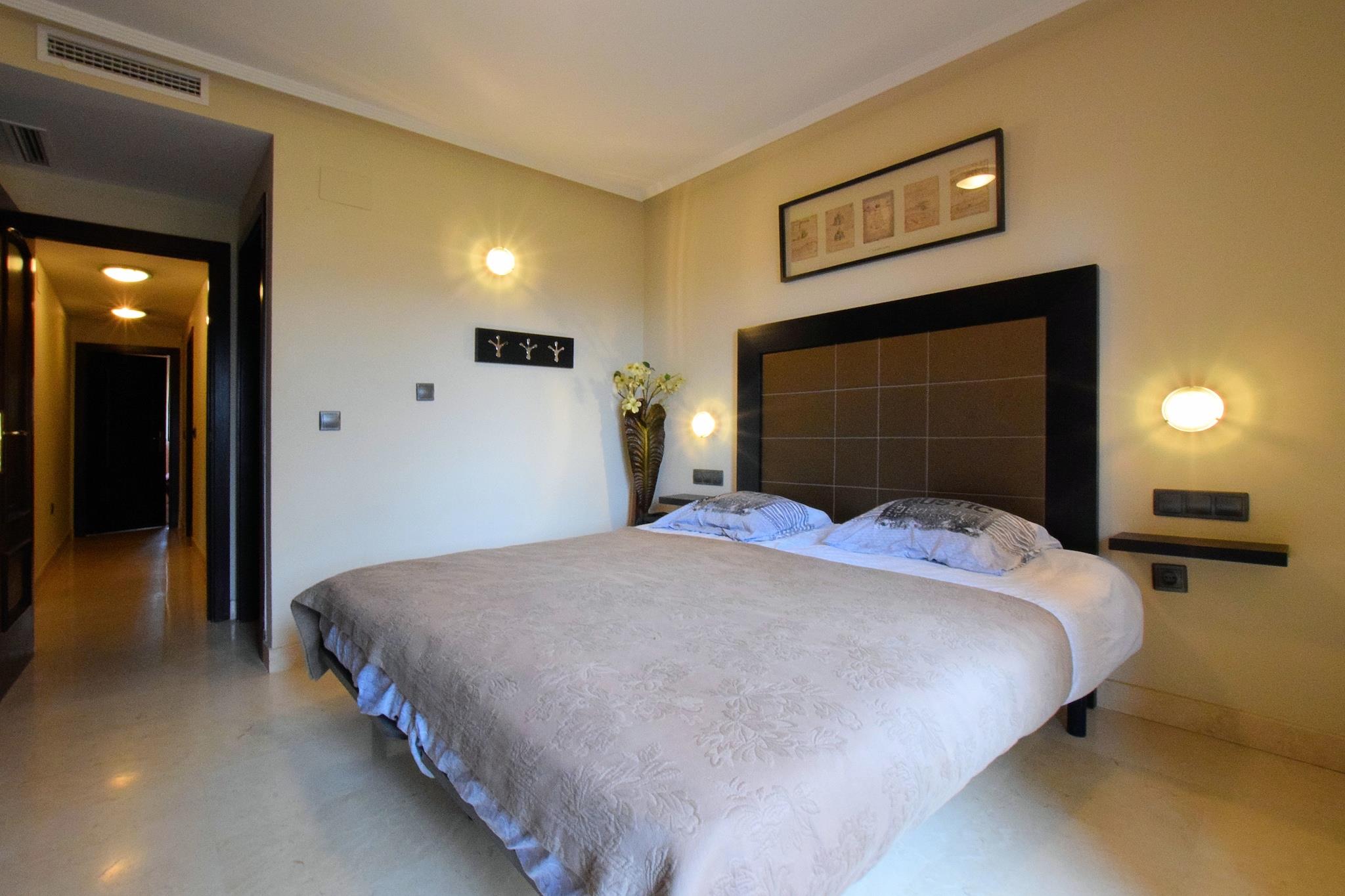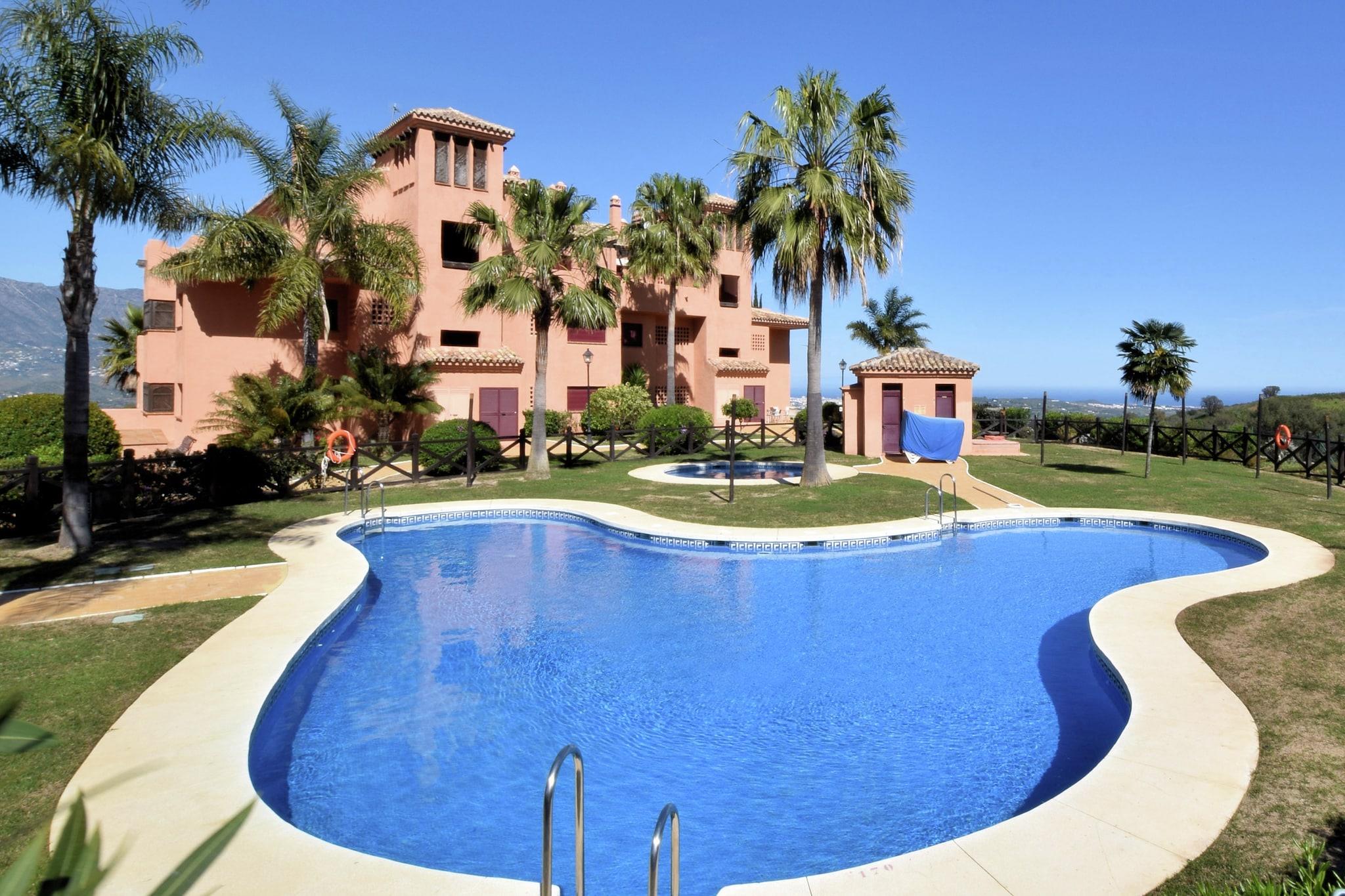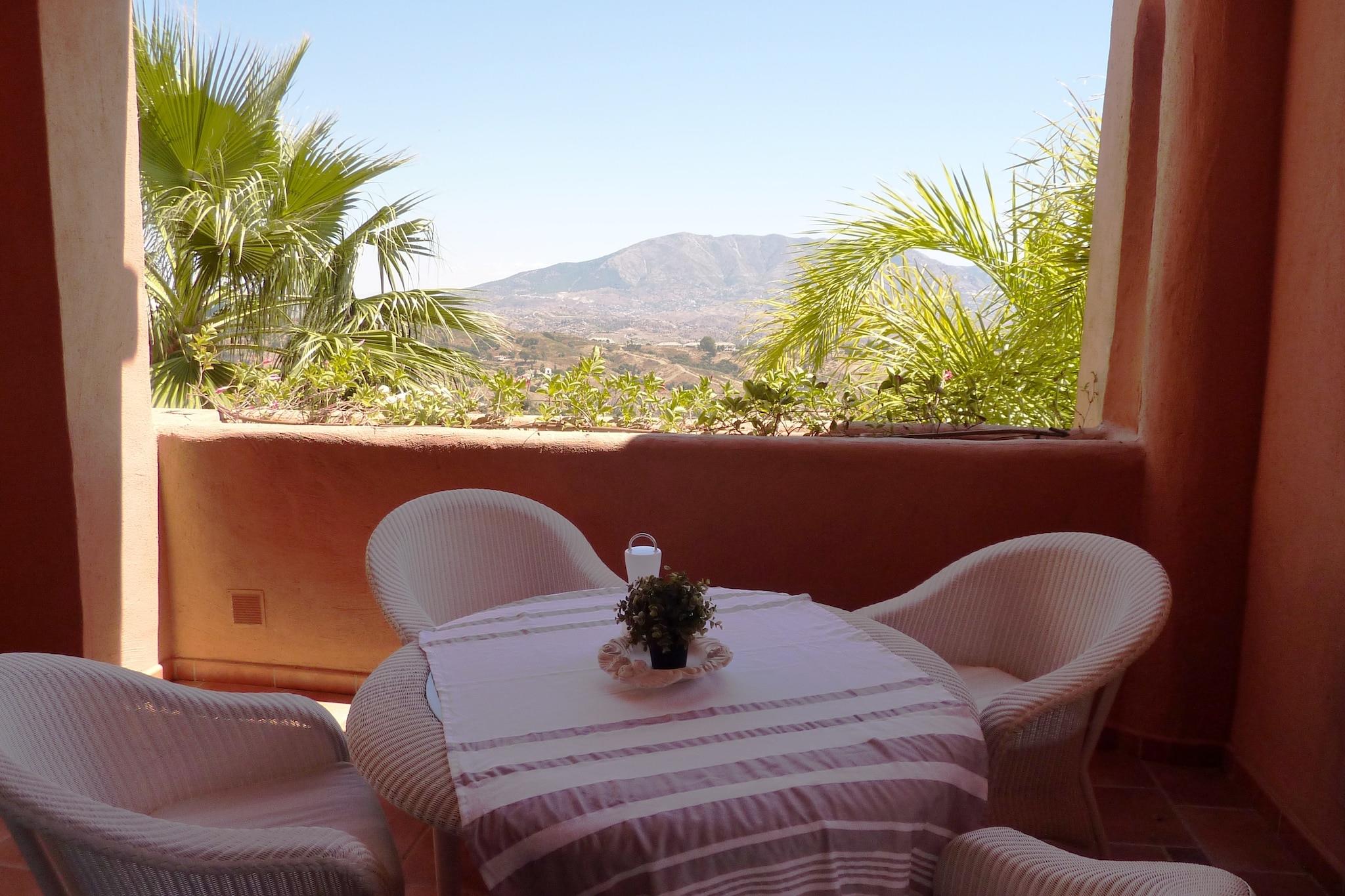 Ruhige Bergkulisse Dieses geräumige Apartment im ruhigen Golfresort El Soto de Marbella bietet Platz für bis zu vier Gäste und bietet einen komfortablen Urlaub. Zwei Schlafzimmer bieten erholsame Privatsphäre, und der offene Wohnbereich mit Klimaanlage sorgt für einen entspannten Aufenthalt. Genießen Sie auf dem Balkon die Gartenmöbel, den Morgenkaffee oder den Blick auf den Sonnenuntergang über den Bergen, Fuengirola und dem fernen Meer. Die voll ausgestattete Küche mit Backofen, Kaffeemaschine und Geschirrspüler macht die Zubereitung Ihrer Mahlzeiten zum Kinderspiel. Gastronomie & Freizeit in der Nähe Eine kurze 10-minütige Fahrt bringt Sie nach Elviria, wo Supermärkte, Bäckereien und lokale Restaurants auf Sie warten. Für einen Tag am Meer ist der nur 8 km entfernte Nikki Beach mit Sonne, Sand und Wassersportmöglichkeiten ideal. Die Altstadt von Marbella liegt 18 km entfernt und lädt Sie ein, charmante Straßen, maurische Einflüsse und historische Sehenswürdigkeiten zu erkunden. Ob Sie lieber am Gemeinschaftspool - inklusive Kinderbereich - entspannen oder ein kulinarisches Abenteuer erleben möchten - hier ist für jeden Geschmack etwas dabei. Komfortabler Komfort Die Wohnung verfügt über einen Aufzug für einen bequemen Zugang von der Garage, einen Abstellraum mit Waschmaschine und Liegestühle zum Entspannen. Mit Gemeinschaftspool und ruhiger Umgebung ist sie ideal für Familien oder kleine Gruppen, die Entspannung und Erkundungstouren suchen. Der Flughafen Málaga ist 43 km entfernt, was An- und Abreise unkompliziert macht. Ein Auto wird empfohlen, um die malerische Umgebung und die nahegelegenen Sehenswürdigkeiten optimal zu genießen.