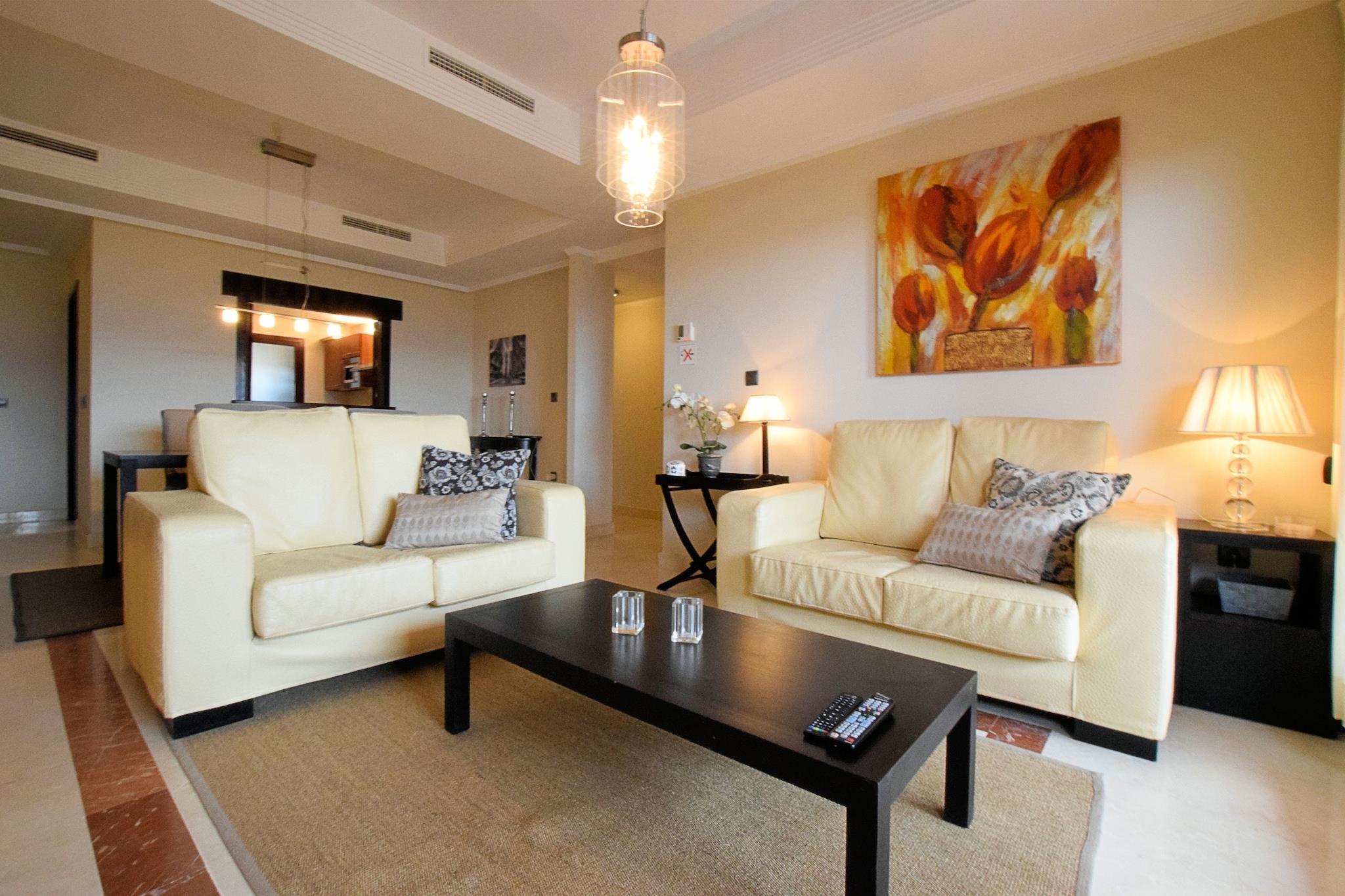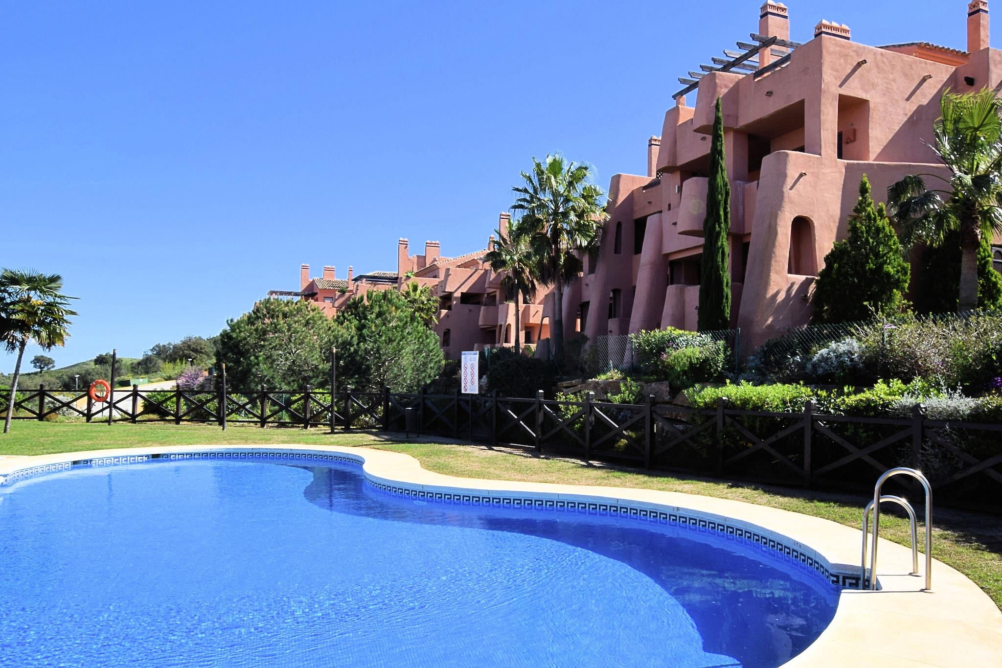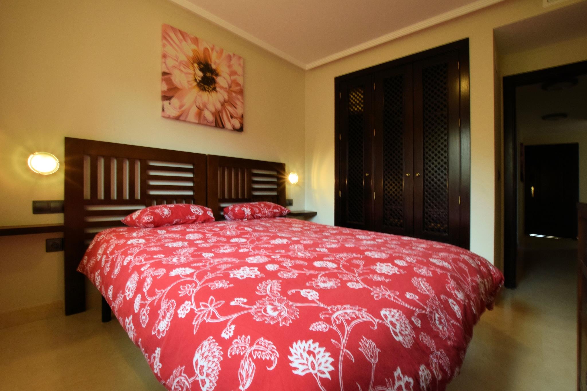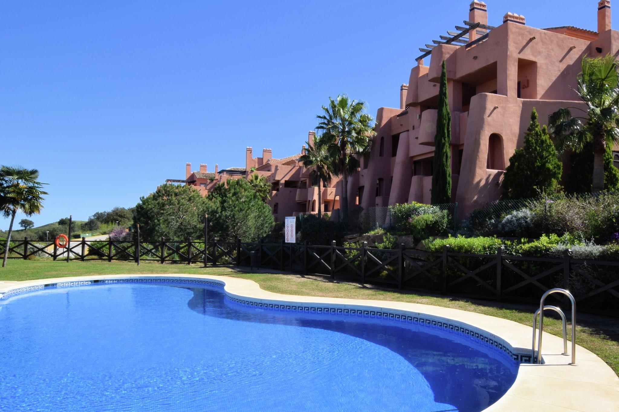 Ruhige Bergkulisse Dieses geräumige Apartment im ruhigen Golfresort El Soto de Marbella bietet Platz für bis zu vier Gäste und bietet einen komfortablen Urlaub. Zwei Schlafzimmer bieten erholsame Privatsphäre, und der offene Wohnbereich mit Klimaanlage sorgt für einen entspannten Aufenthalt. Genießen Sie auf dem Balkon die Gartenmöbel, den Morgenkaffee oder den Blick auf den Sonnenuntergang über den Bergen, Fuengirola und dem fernen Meer. Die voll ausgestattete Küche mit Backofen, Kaffeemaschine und Geschirrspüler macht die Zubereitung Ihrer Mahlzeiten zum Kinderspiel. Gastronomie & Freizeit in der Nähe Eine kurze 10-minütige Fahrt bringt Sie nach Elviria, wo Supermärkte, Bäckereien und lokale Restaurants auf Sie warten. Für einen Tag am Meer ist der nur 8 km entfernte Nikki Beach mit Sonne, Sand und Wassersportmöglichkeiten ideal. Die Altstadt von Marbella liegt 18 km entfernt und lädt Sie ein, charmante Straßen, maurische Einflüsse und historische Sehenswürdigkeiten zu erkunden. Ob Sie lieber am Gemeinschaftspool - inklusive Kinderbereich - entspannen oder ein kulinarisches Abenteuer erleben möchten - hier ist für jeden Geschmack etwas dabei. Komfortabler Komfort Die Wohnung verfügt über einen Aufzug für einen bequemen Zugang von der Garage, einen Abstellraum mit Waschmaschine und Liegestühle zum Entspannen. Mit Gemeinschaftspool und ruhiger Umgebung ist sie ideal für Familien oder kleine Gruppen, die Entspannung und Erkundungstouren suchen. Der Flughafen Málaga ist 43 km entfernt, was An- und Abreise unkompliziert macht. Ein Auto wird empfohlen, um die malerische Umgebung und die nahegelegenen Sehenswürdigkeiten optimal zu genießen.