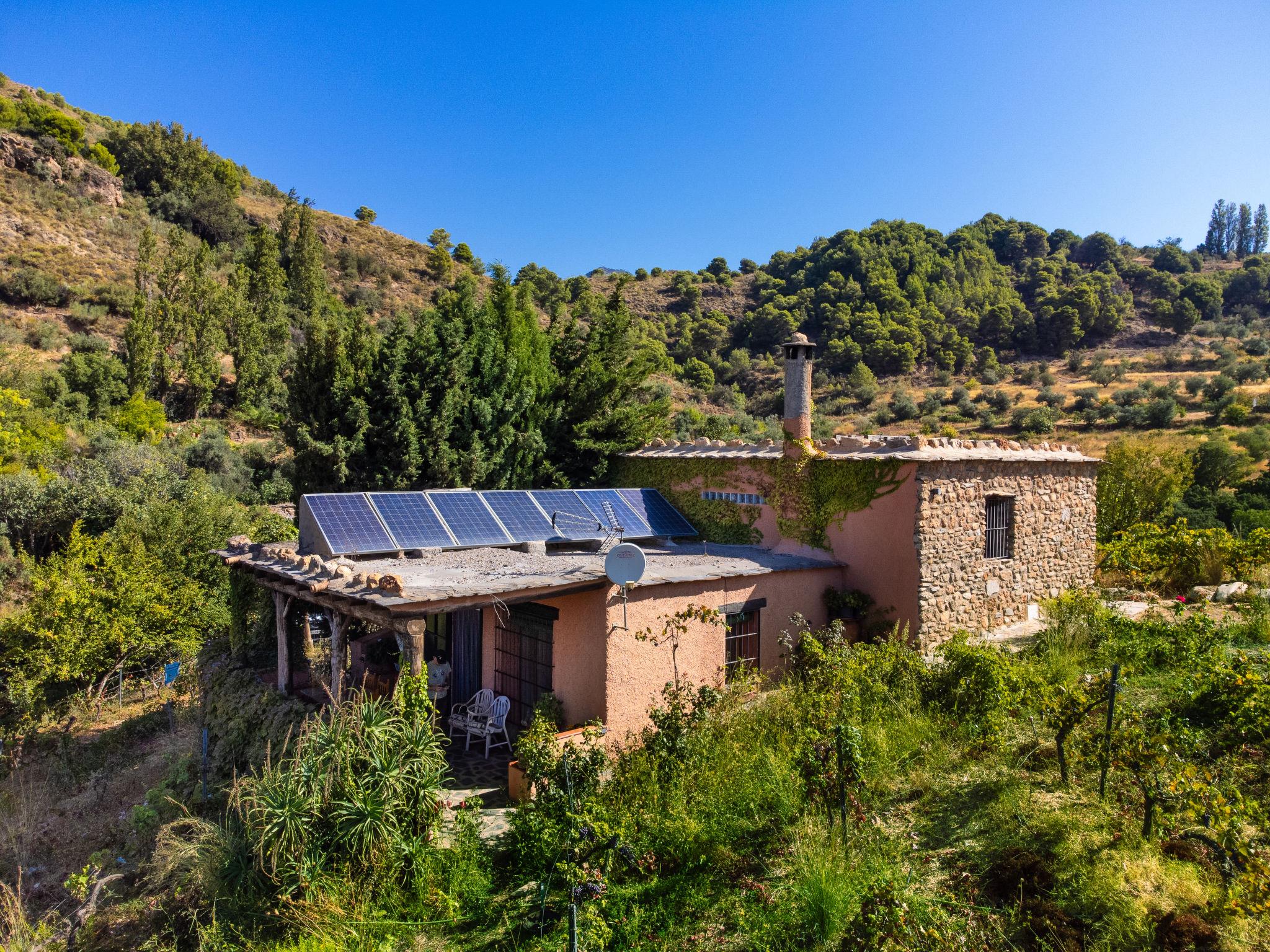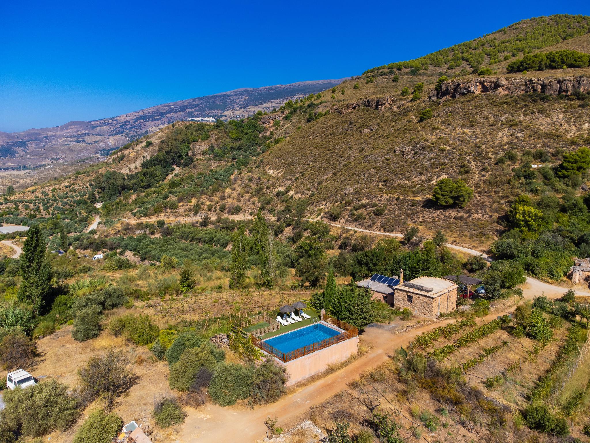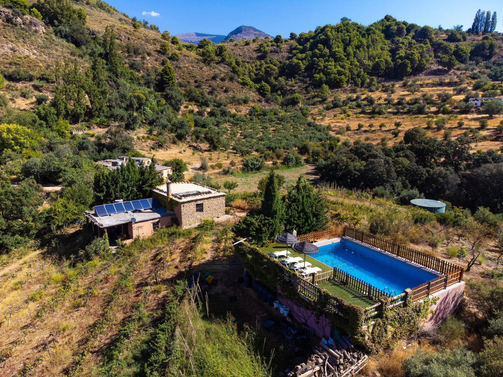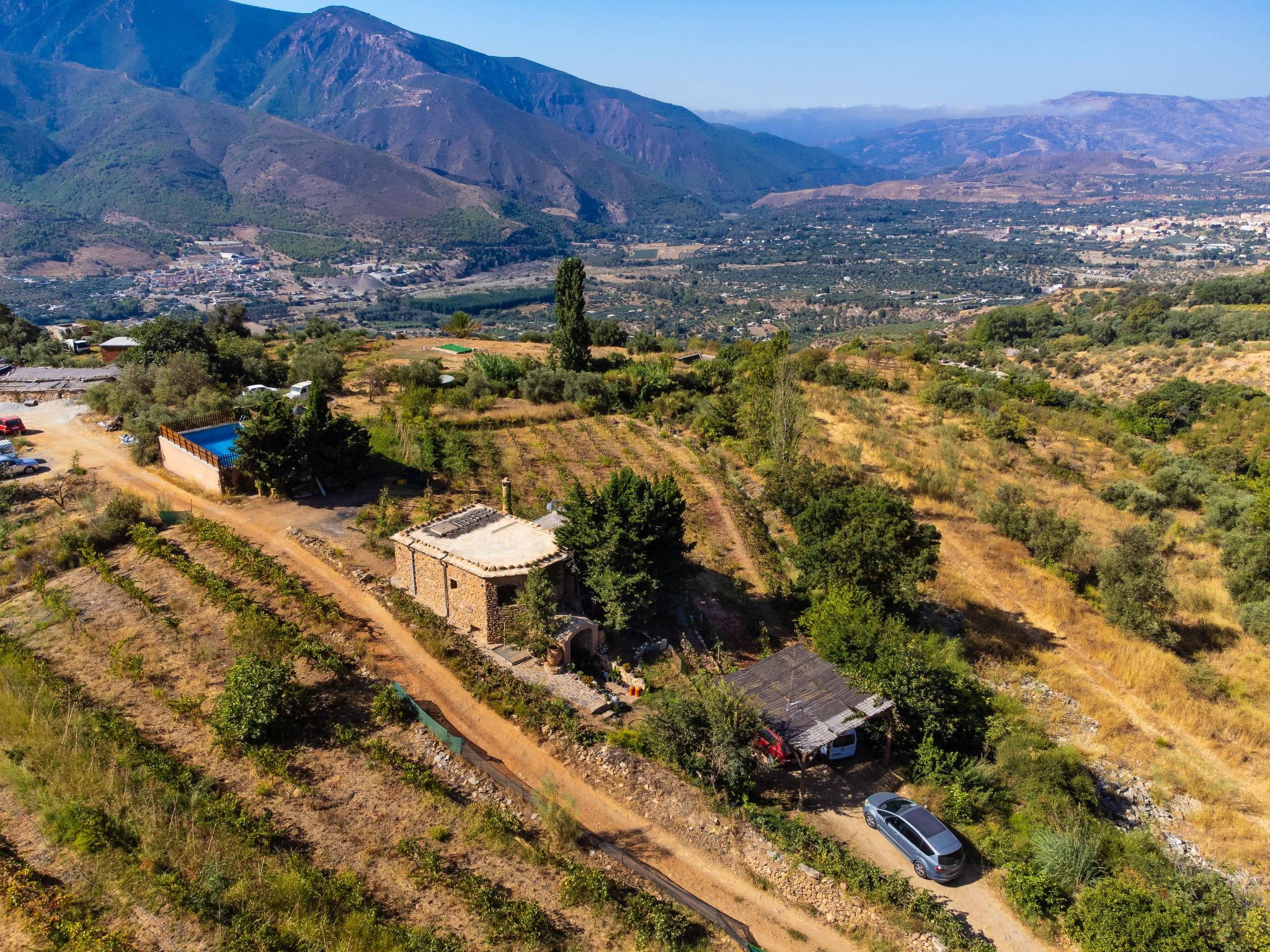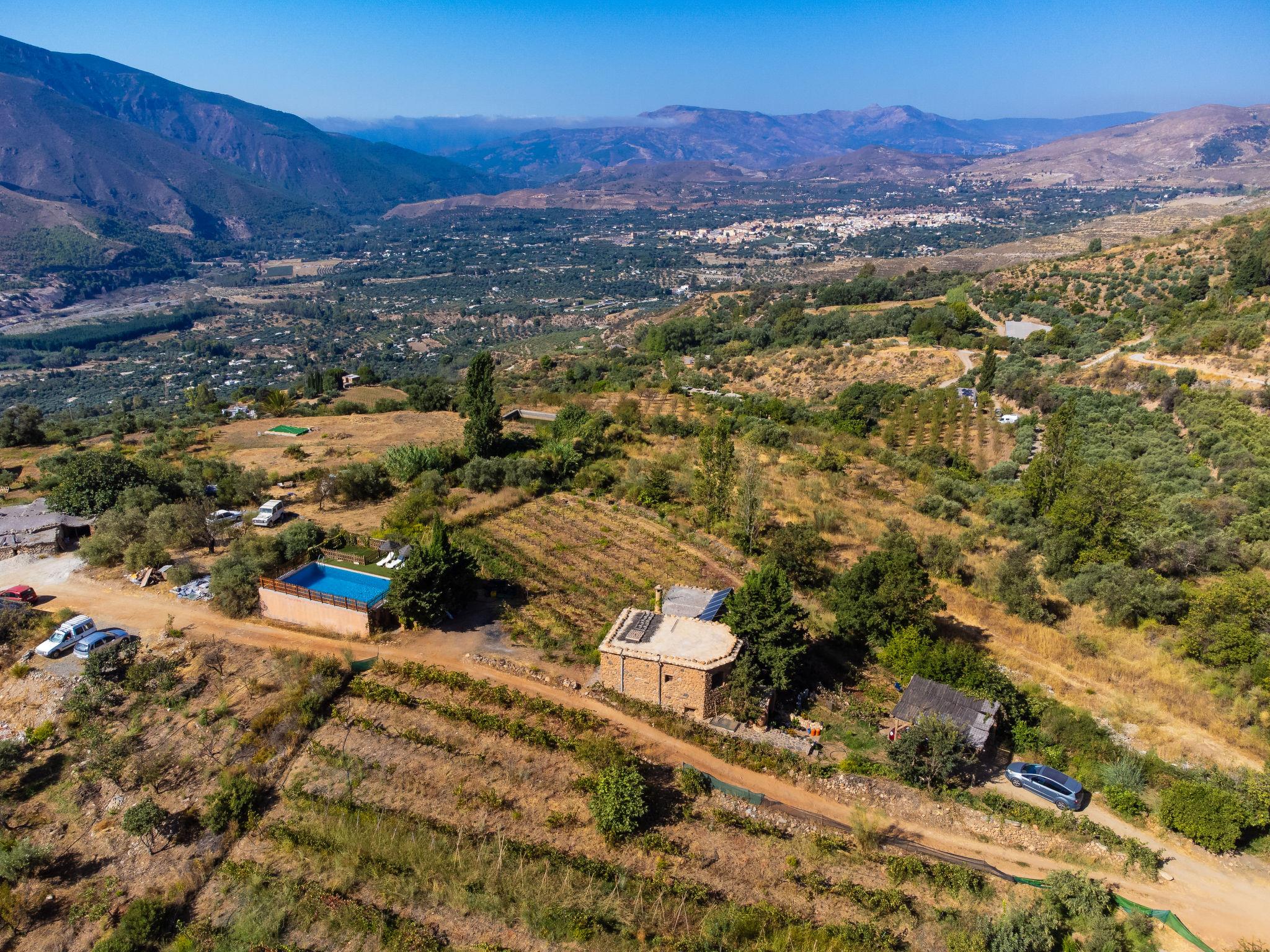 Orgiva: Gemütliches, einfaches, komfortables Haus "Cortijo el Cerrillo", Baujahr 1998, renoviert im Jahre 2018, umgeben von Weinbergen. Alleinstehende, ruhige Lage, im Grünen. Zur Alleinbenutzung: naturbelassenes Grundstück 5'000 m2, Schwimmbad (11 x 5 m, 225 cm tief, saisonale Verfügbarkeit: 01.Apr. - 01.Okt.). Kinderbecken. Holprige, steile Zufahrt (300 m Naturweg). Parkplatz beim Haus. Lebensmittelgeschäft 5 km, Supermarkt 5 km, Restaurant 5 km, Bushaltestelle 5 km. Nahe gelegene Sehenswürdigkeiten: Parque Natural Sierra Nevada Cara Sur 200 m, Aeropuerto Granada 70 km, Granada 58 km, Costa Tropical 30 km. Bitte beachten: Fahrzeug empfohlen. Geeignet für Familien. Eigentümer hat einen Hund.