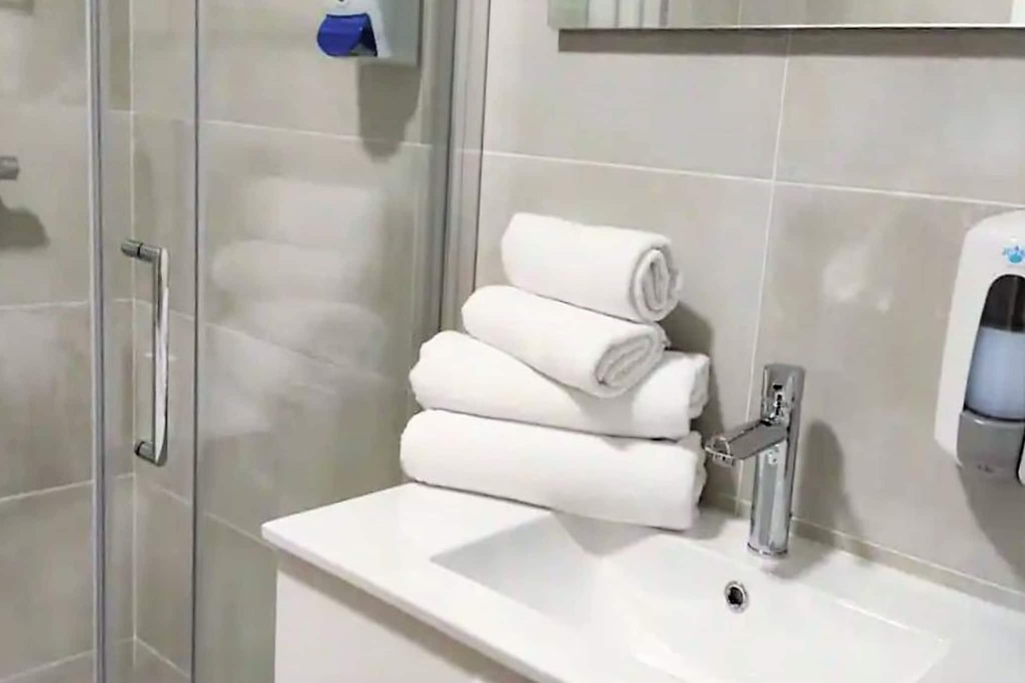 Parterre: (Eingang(von außen erreichbar), Aufzug) In der 4. Etage: (Eingang, Wohnzimmer(Doppelschlafcouch(120 x 200 cm), TV(Flatscreen, smart TV), Esstisch, Sitzecke), Küche(Kochplatte, Toaster, Dunstabzugshaube, Kaffeemaschine, Backofen, Mikrowelle, Spülmaschine, Kühl-/Gefrierkombination, Zitruspresse), Schlafzimmer(Doppelbett(150 x 200 cm)), Schlafzimmer(Doppelbett(150 x 200 cm)), Badezimmer(Dusche, Waschbecken, Toilette, Föhn), Badezimmer(Waschbecken, Toilette, Waschmaschine), Heizung, Klimaanlage, Terrasse(alleinige Nutzung, 2 m2)) Parkplatz
