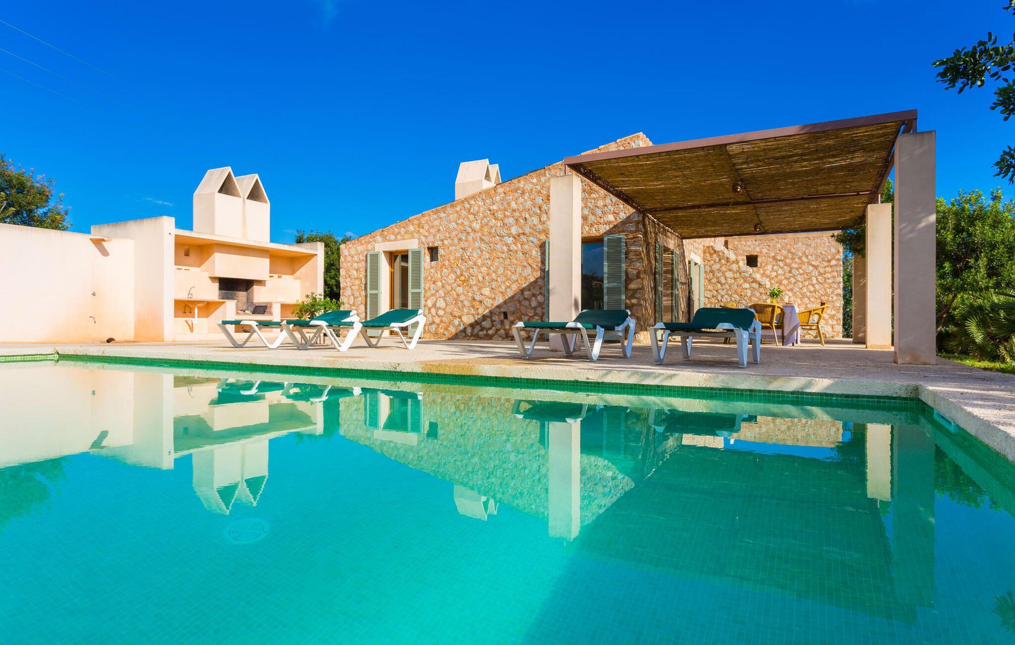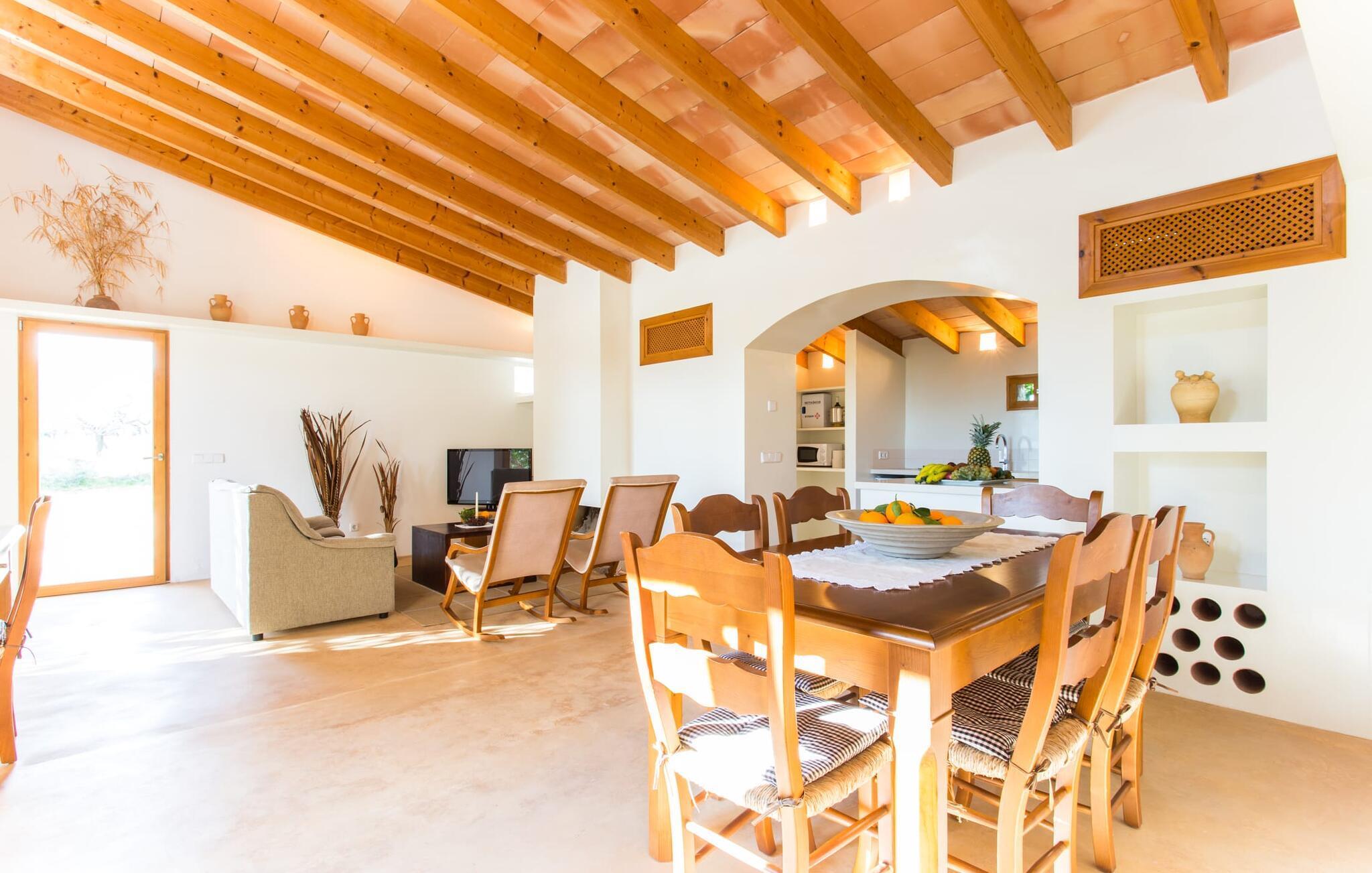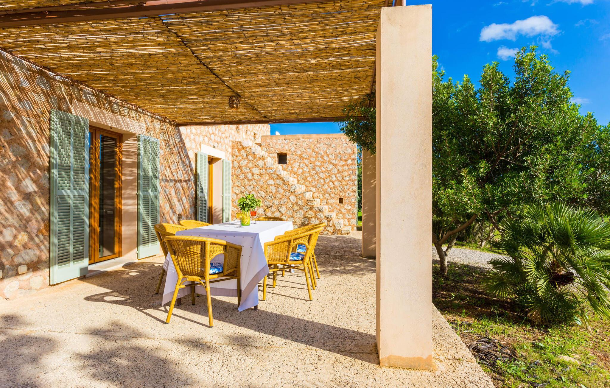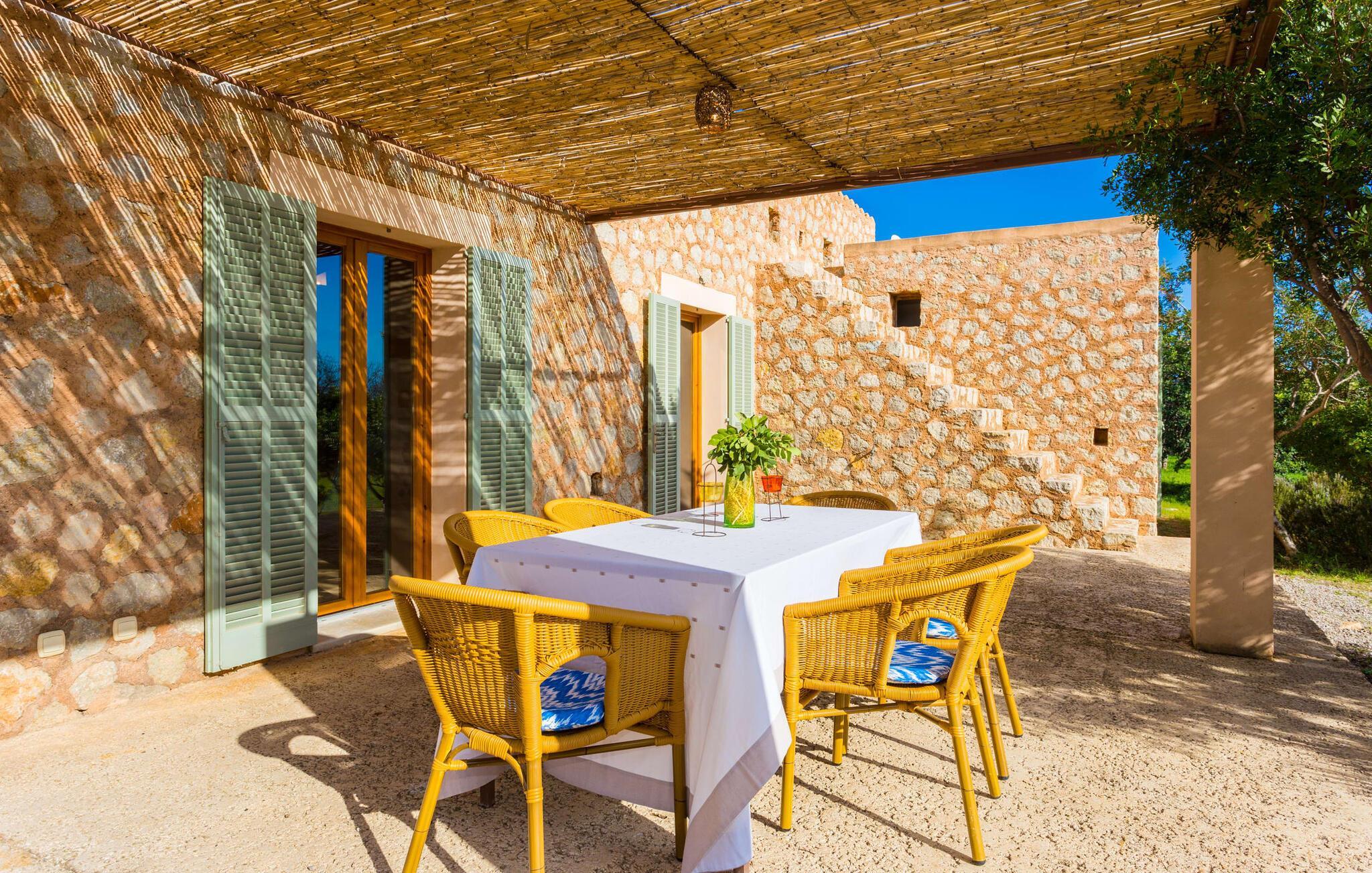 Die Villa „Pedra Viva“ ist ein bezauberndes Feriendomizil, das Sie mit viel Liebe zum Detail bezaubern wird. Dies ist bereits von außen an diesem angenehm ländlichen Anwesen zu erkennen, das inmitten von Feldern und alten Baumbeständen liegt und so eine unberührte Atmosphäre schafft. Auch wenn es sich bei dem Haus um einen Neubau handelt, haben die erfahrenen Eigentümer die mallorquinischen Traditionen durch den Einbau einer prächtigen Natursteinfassade bewahrt. Der fröhliche helle Sandstein und die meerschaumtürkisfarbenen Fensterläden ergeben ein harmonisches Ensemble. Die L-förmigen Terrassen sind nach Süden ausgerichtet und bieten sowohl überdachte als auch offene Freiflächen. Im Außenbereich gibt es eine tolle, sehr praktische Außenküche mit eingebautem Grill. Es gibt auch viel Platz für eine beeindruckende Anzahl von Sonnenliegen, die Sie nach Belieben rund um den malachitfarbenen Pool platzieren können, um entweder die Sonne zu genießen oder sich mit einem guten Buch in den Schatten eines großen Sonnenschirms zurückzuziehen. Machen Sie einen kleinen Schlummer und lassen Sie sich dem entspannten Ablauf des Tages hingeben – nicht hektisch, ohne Termine und Verpflichtungen, sondern selbstbestimmt mit einem Hauch von Freiheit. Alles ist möglich. Der schattige Teil der Terrasse liegt unter einem wunderbar heimeligen Bambusdach. Es verfügt über einen Essbereich mit bequemen Korbstühlen – auch während Ihrer Mahlzeiten oder wenn Sie abends mit Freunden draußen sitzen, können Sie den Panoramablick über das Land genießen.