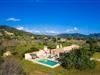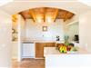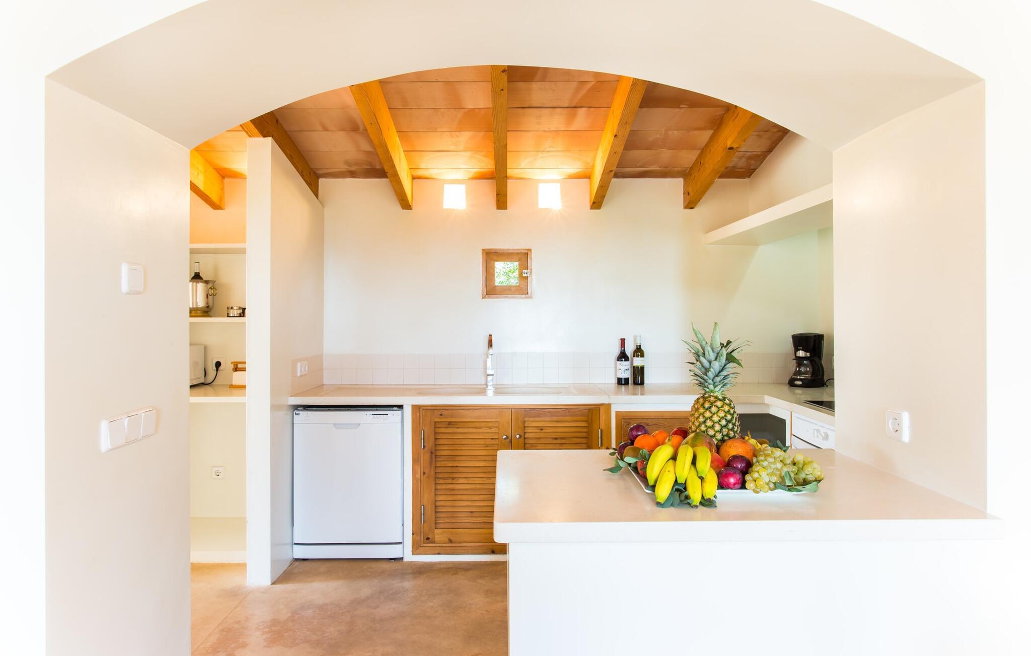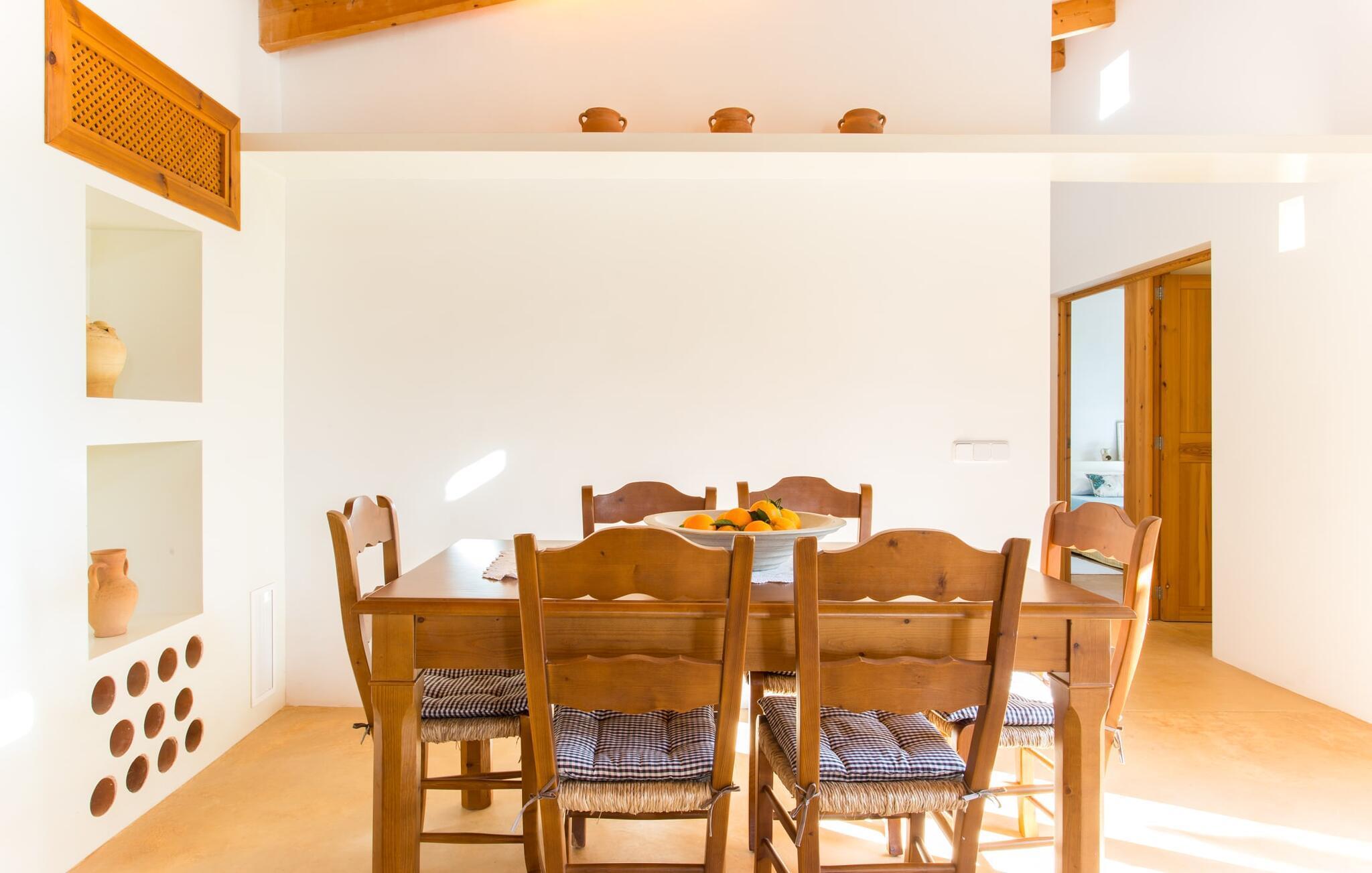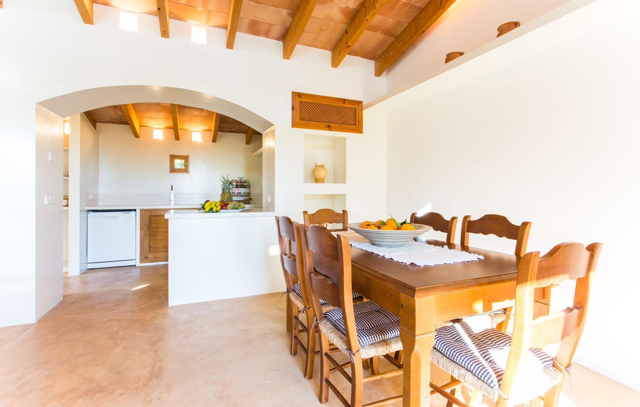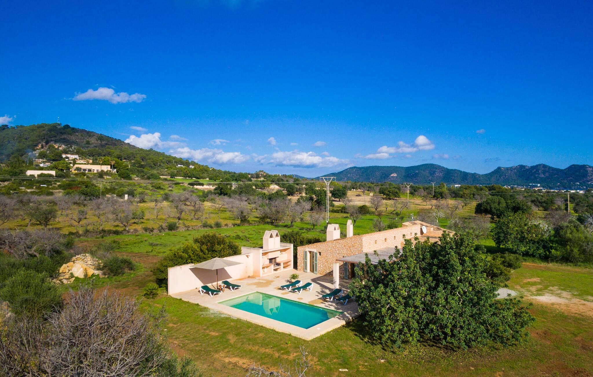 Die Villa „Pedra Viva“ ist ein bezauberndes Feriendomizil, das Sie mit viel Liebe zum Detail bezaubern wird. Dies ist bereits von außen an diesem angenehm ländlichen Anwesen zu erkennen, das inmitten von Feldern und alten Baumbeständen liegt und so eine unberührte Atmosphäre schafft. Auch wenn es sich bei dem Haus um einen Neubau handelt, haben die erfahrenen Eigentümer die mallorquinischen Traditionen durch den Einbau einer prächtigen Natursteinfassade bewahrt. Der fröhliche helle Sandstein und die meerschaumtürkisfarbenen Fensterläden ergeben ein harmonisches Ensemble. Die L-förmigen Terrassen sind nach Süden ausgerichtet und bieten sowohl überdachte als auch offene Freiflächen. Im Außenbereich gibt es eine tolle, sehr praktische Außenküche mit eingebautem Grill. Es gibt auch viel Platz für eine beeindruckende Anzahl von Sonnenliegen, die Sie nach Belieben rund um den malachitfarbenen Pool platzieren können, um entweder die Sonne zu genießen oder sich mit einem guten Buch in den Schatten eines großen Sonnenschirms zurückzuziehen. Machen Sie einen kleinen Schlummer und lassen Sie sich dem entspannten Ablauf des Tages hingeben – nicht hektisch, ohne Termine und Verpflichtungen, sondern selbstbestimmt mit einem Hauch von Freiheit. Alles ist möglich. Der schattige Teil der Terrasse liegt unter einem wunderbar heimeligen Bambusdach. Es verfügt über einen Essbereich mit bequemen Korbstühlen – auch während Ihrer Mahlzeiten oder wenn Sie abends mit Freunden draußen sitzen, können Sie den Panoramablick über das Land genießen.