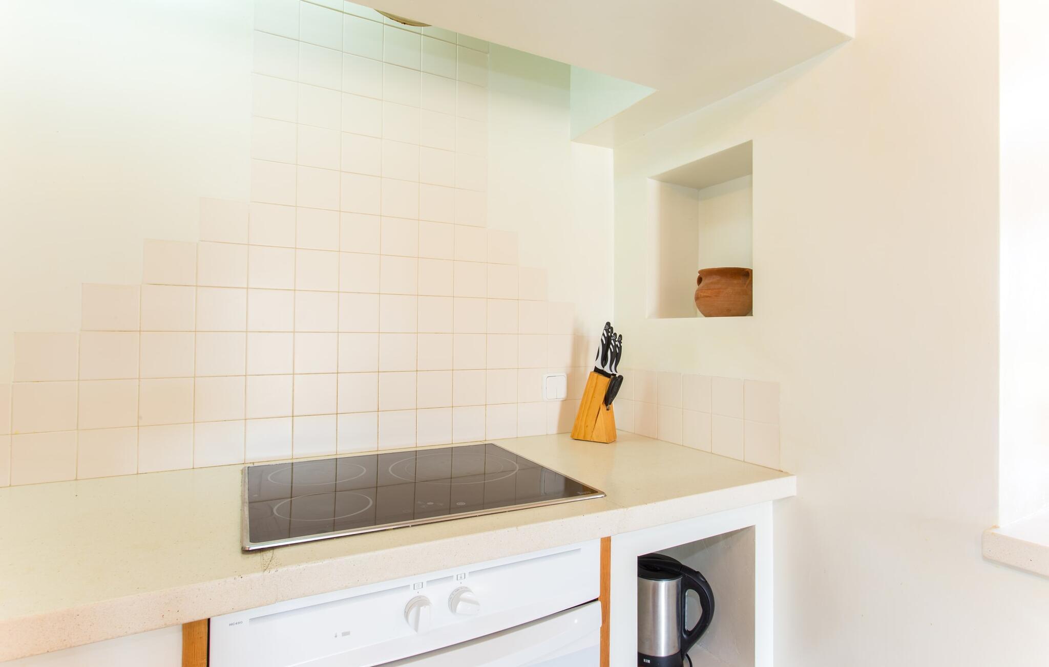 „Pedra Viva“ ist ein lebendiges, lichtdurchflutetes Haus mit kompaktem Grundriss und moderner Ausstattung. Die Zimmer sind größtenteils offen gestaltet und mit einfachen, minimalistischen Möbeln ausgestattet, was in diesem Fall ein gutes Beispiel für das Sprichwort „Weniger ist mehr“ ist. Große Bodenfliesen, helle, weiß getünchte Wände, Holzbalken und mit Terrakotta verkleidete Walmdecken wirken in Kombination mit der hellen Einrichtung erfrischend leicht und dennoch gemütlich. Gleiches gilt für den Wohnraum mit LCD-TV und offenem Kamin. Daneben befindet sich der mit Holzmöbeln ausgestattete Essbereich direkt vor der Küche. Es ist halboffen gestaltet, da es sich hinter einer Backsteinöffnung mit Korbbogen und einer kleinen Theke befindet. Die Schränke sind aus massivem Stein mit einfachen Fensterläden. Selbstverständlich ist die Küche komplett mit allen technischen Utensilien ausgestattet – Spülmaschine und Herd mit Cerankochfeld – damit die gemeinsame Selbstversorgung entspannt und unterhaltsam wird. Die Schlafzimmer befinden sich ebenfalls im Erdgeschoss: Es gibt drei Schlafzimmer, die entweder mit zwei Einzelbetten mit einer Breite von 1 m oder einem 2 m breiten Doppelbett ausgestattet sind. Das Hauptschlafzimmer verfügt über ein eigenes Bad, während sich die restlichen beiden Schlafzimmer ein frei zugängliches Duschbad mit stilvollem Industrie-Touch teilen. Insgesamt ist die fortschrittliche Villa ein sehr verlockendes Gästehaus, denn sie macht Lust, heute die Koffer zu packen, um dort eine erholsame Zeit zu verbringen.