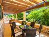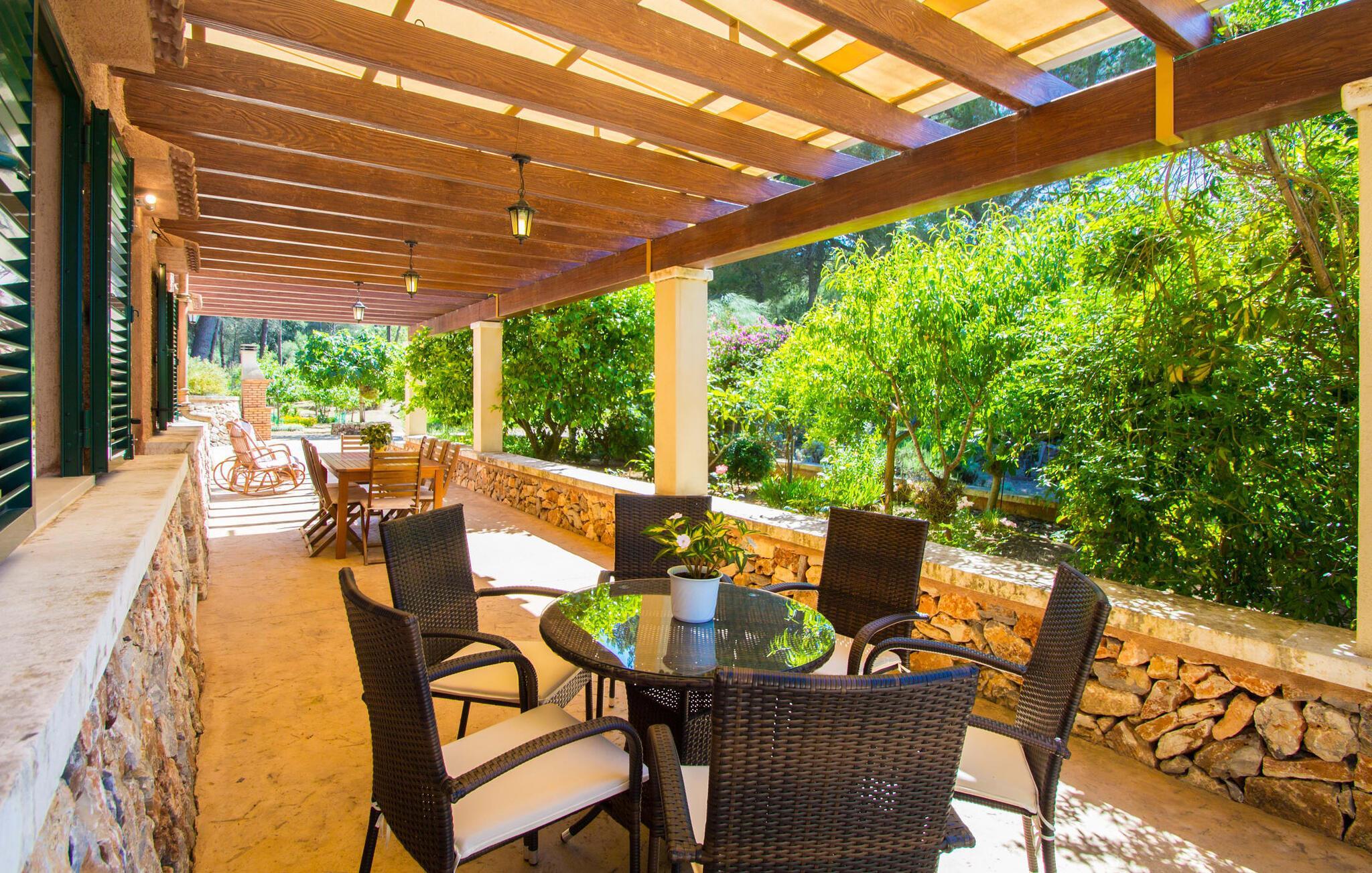 Die Villa „Perello“ hat mit ihrem aprikosenfarbenen Anstrich, dem angrenzenden Hain und der schönen überdachten Veranda einen besonderen Charme. Die Kombination aus Terrasse und Poollandschaft der Villa bildet das Herzstück des Anwesens mit einem 4.000 Quadratmeter großen Grundstück. Der wunderschön eingerahmte 48 Quadratmeter große Privatpool hat eine Tiefe von 1,90 m. An der Einstiegsseite gibt es einen bequemen Stufenzugang. Bequeme Liegen laden zum ausgiebigen Entspannen in der Sonne oder im natürlichen Schatten ein und lassen die Seele herrlich verwöhnen. Über ein paar Stufen erreichen Sie das Haus, unter dem sich eine herrliche, große überdachte Terrasse befindet, die zum Verweilen einlädt. Unterschiedliche Sitzmöbel, wie Schaukelstühle oder bequeme Sitzgelegenheiten an eckigen oder runden Esstischen, bieten die Möglichkeit, sich je nach Lust und Laune gemütlich niederzulassen. Ein fantastischer Ort, an dem man zum Beispiel in geselliger Runde ein herzhaftes Frühstück genießen kann. Ebenso können Sie auch nachts bei einem gemütlichen Grillabend die Aussicht auf das umliegende Grün genießen und die köstlichen regionalen Zutaten probieren. Auf diese Weise kann man den idealen Abschluss eines anstrengenden Urlaubstages erleben.