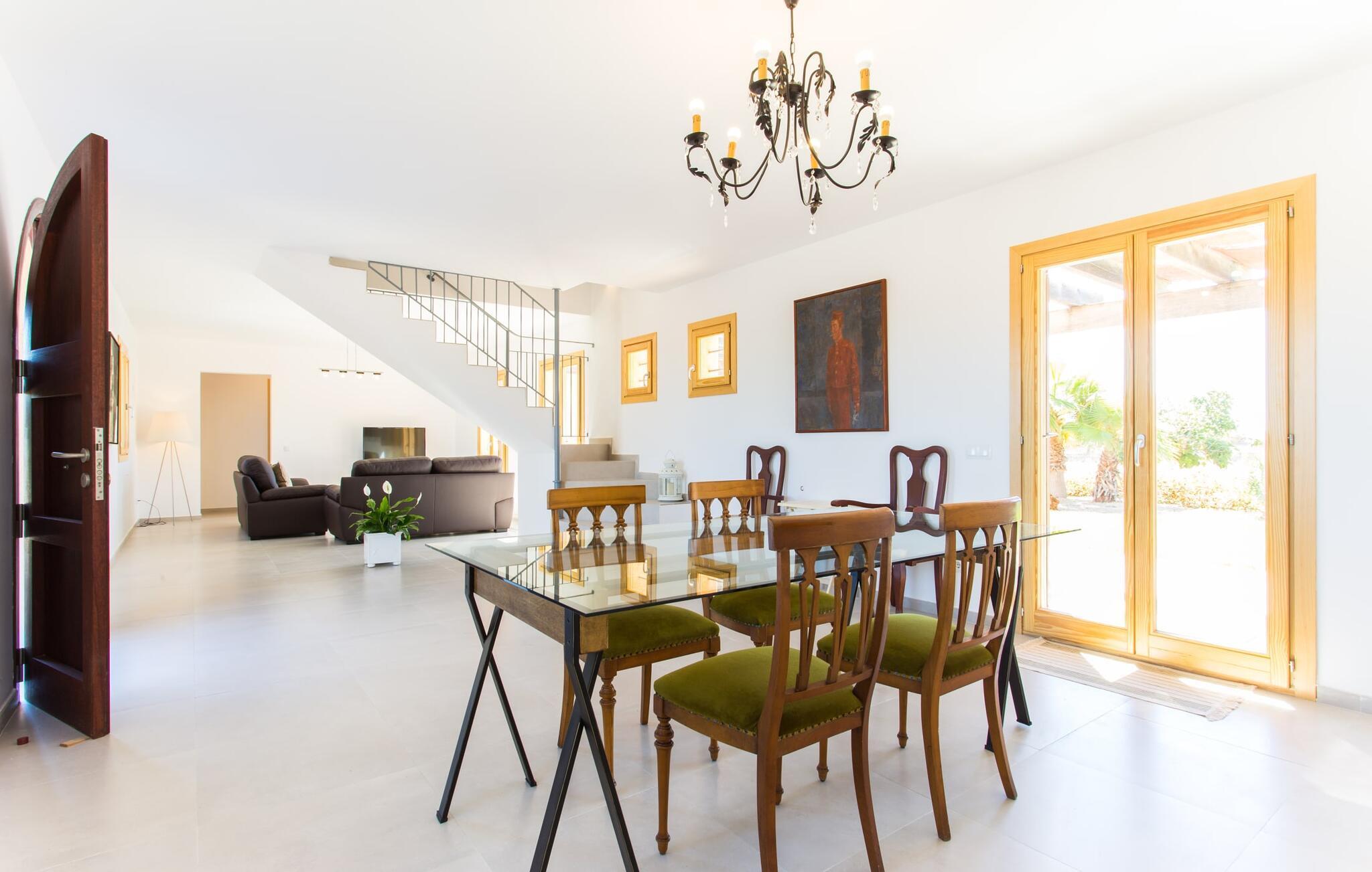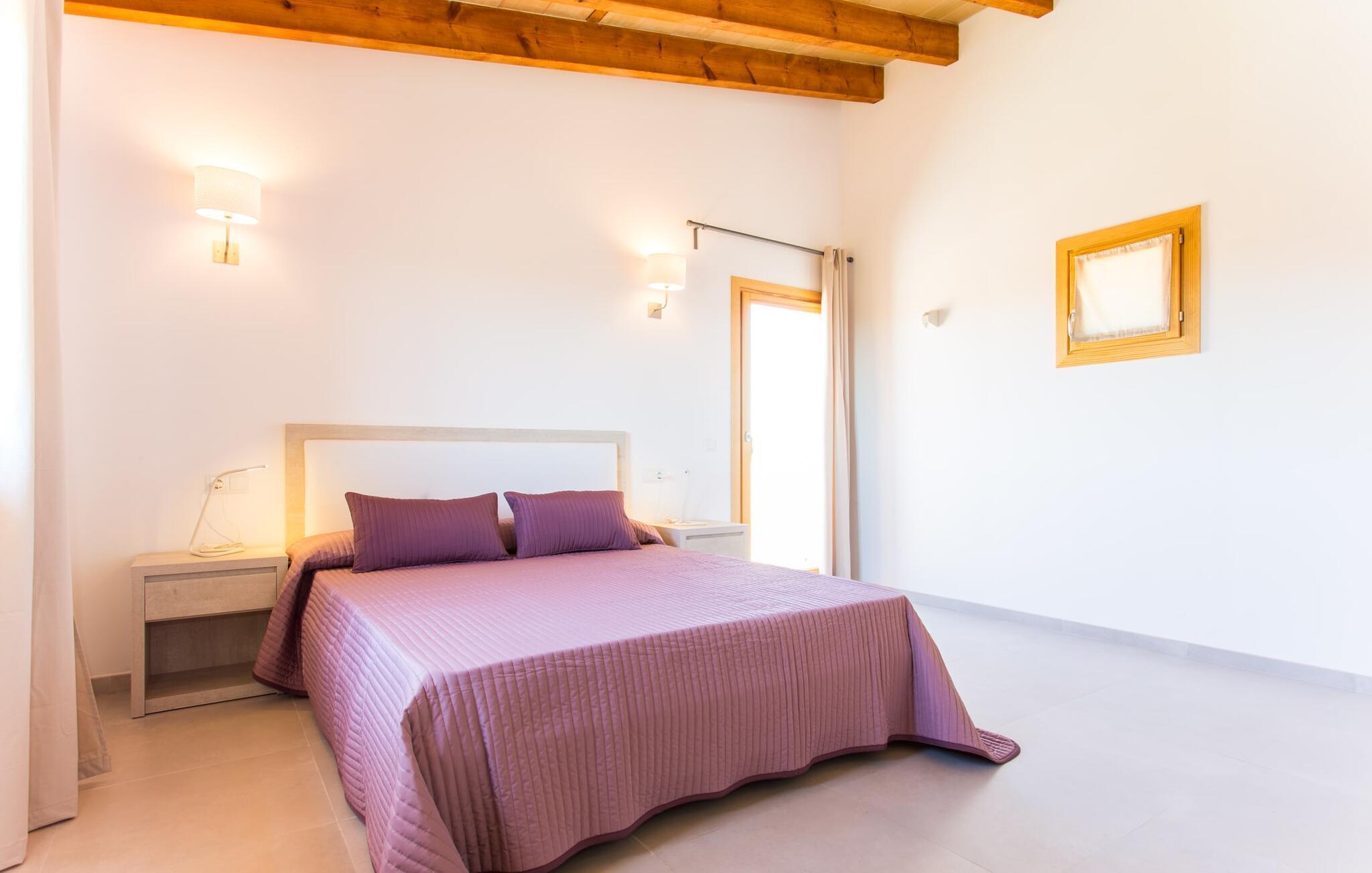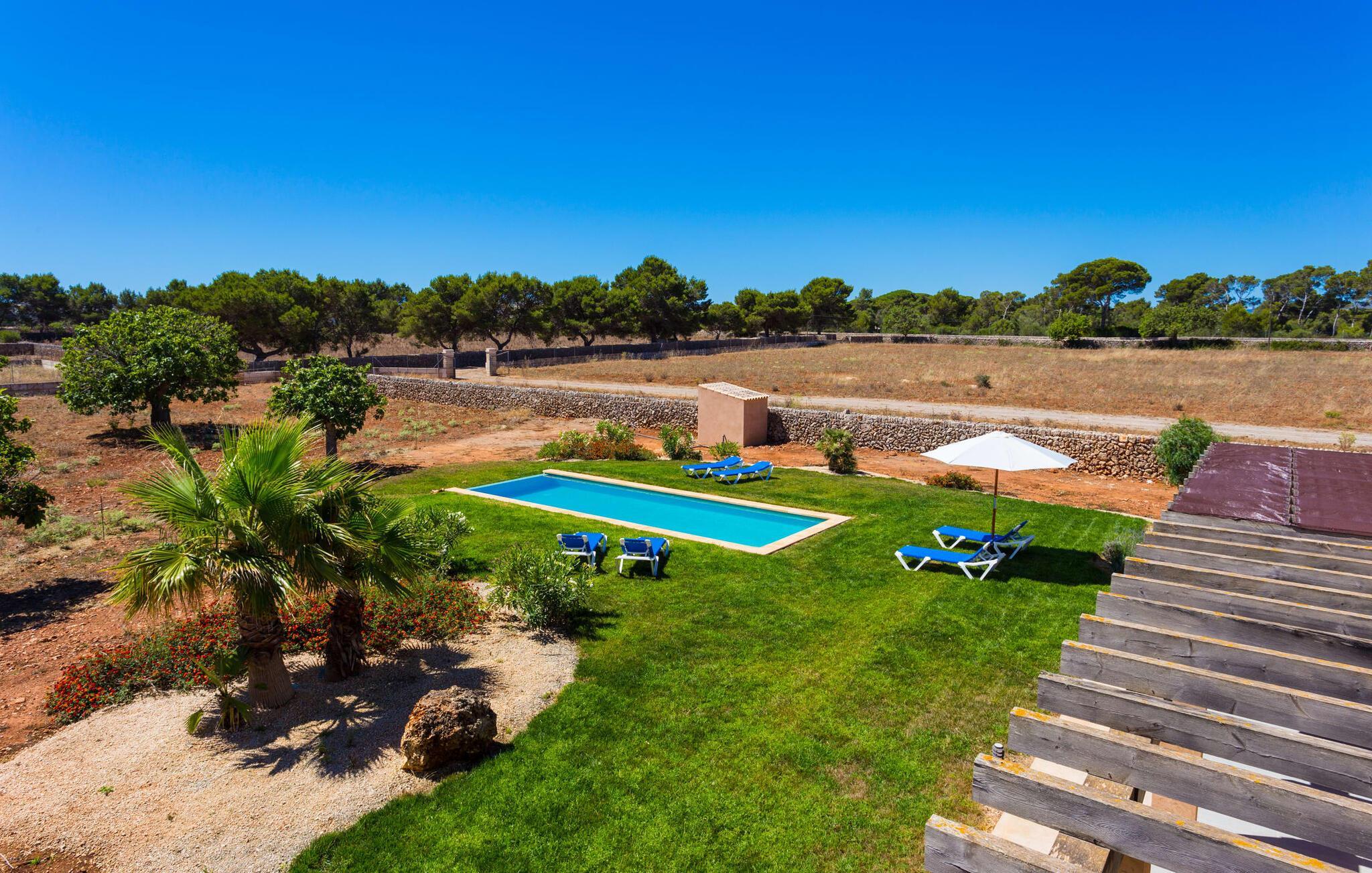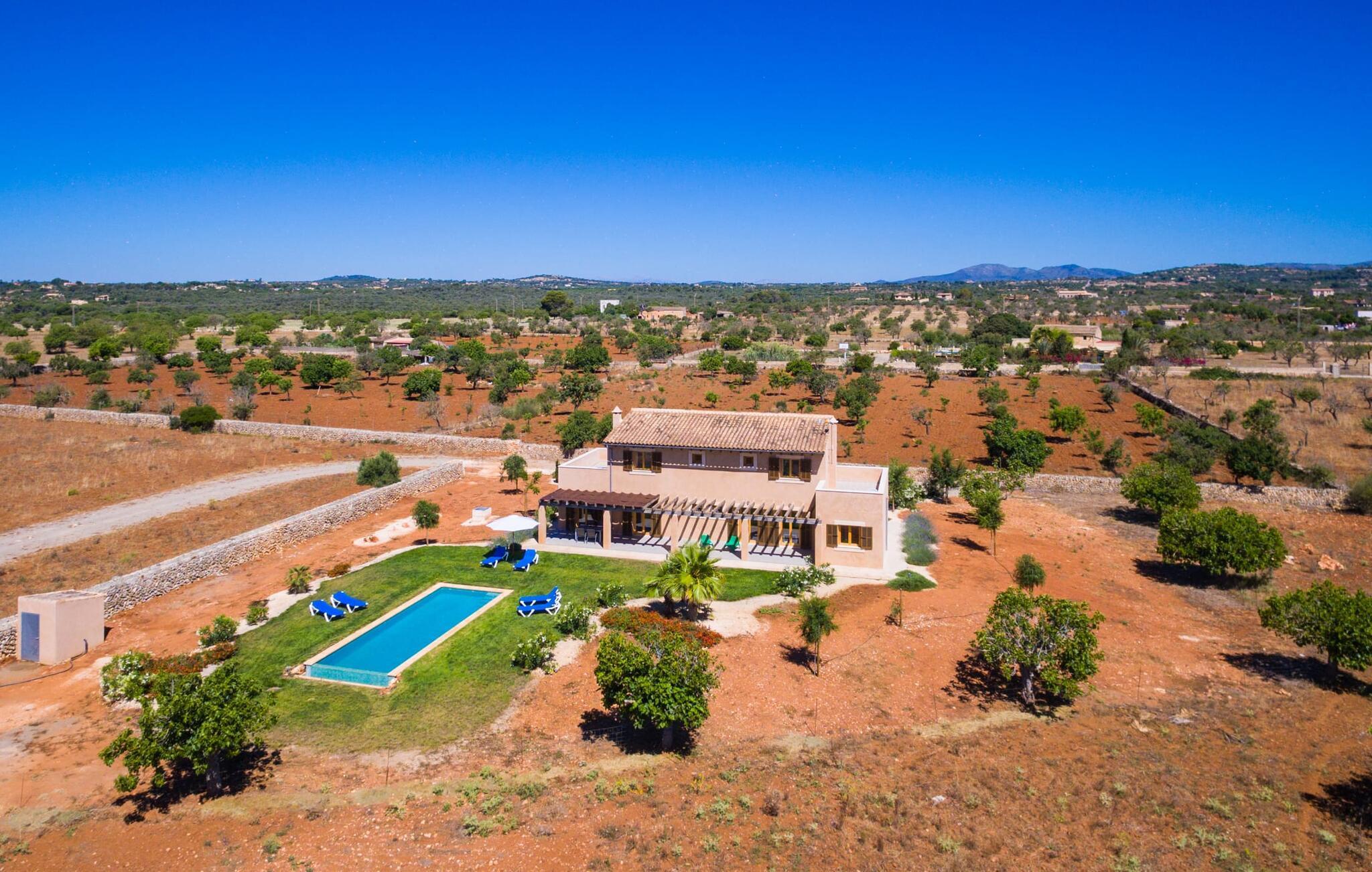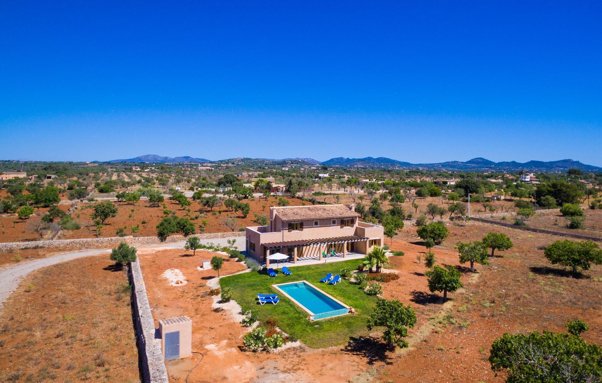 Nachbarn weit weg! Ein Hauch von Afrika umhüllt diese moderne Villa. Fotos lassen zunächst nicht erkennen, wie nah es am Meer oder an der Hafenstadt Porto Cristo liegt, die einst den Angriffen von Piraten widerstehen musste. Die Terra Rossa, die typische rote Erde vieler Regionen rund um das Mittelmeer, und der entfernte Hügelrücken lassen den zweigeschossigen Neubau wirken, als gehörte er schon immer zu dieser kargen, nur von wenigen Bäumen geprägten Landschaft. Allerdings haben Sie eine kleine Gartenoase, ein Fleckchen Grün, das den Pool liebevoll umgibt. In der Hochsaison ist es nicht ganz der richtige Ort für Schattenpflanzen, obwohl die lange Terrasse mit Pergola (Nomen est Omen) zumindest teilweise ein schützendes Dach über dem Kopf bietet; Hier gibt es viel Platz – sogar die Sonnenliegen und der Grill finden hier Unterschlupf. Wenn Sie jedoch zu denjenigen gehören, denen es nicht heiß genug ist, dorthin zu gehen, können Sie auch auf das Dach der Villa klettern, da die beiden Schlafzimmer im ersten Stock Zugang zu diesem privaten Plätzchen an der Sonne bieten.