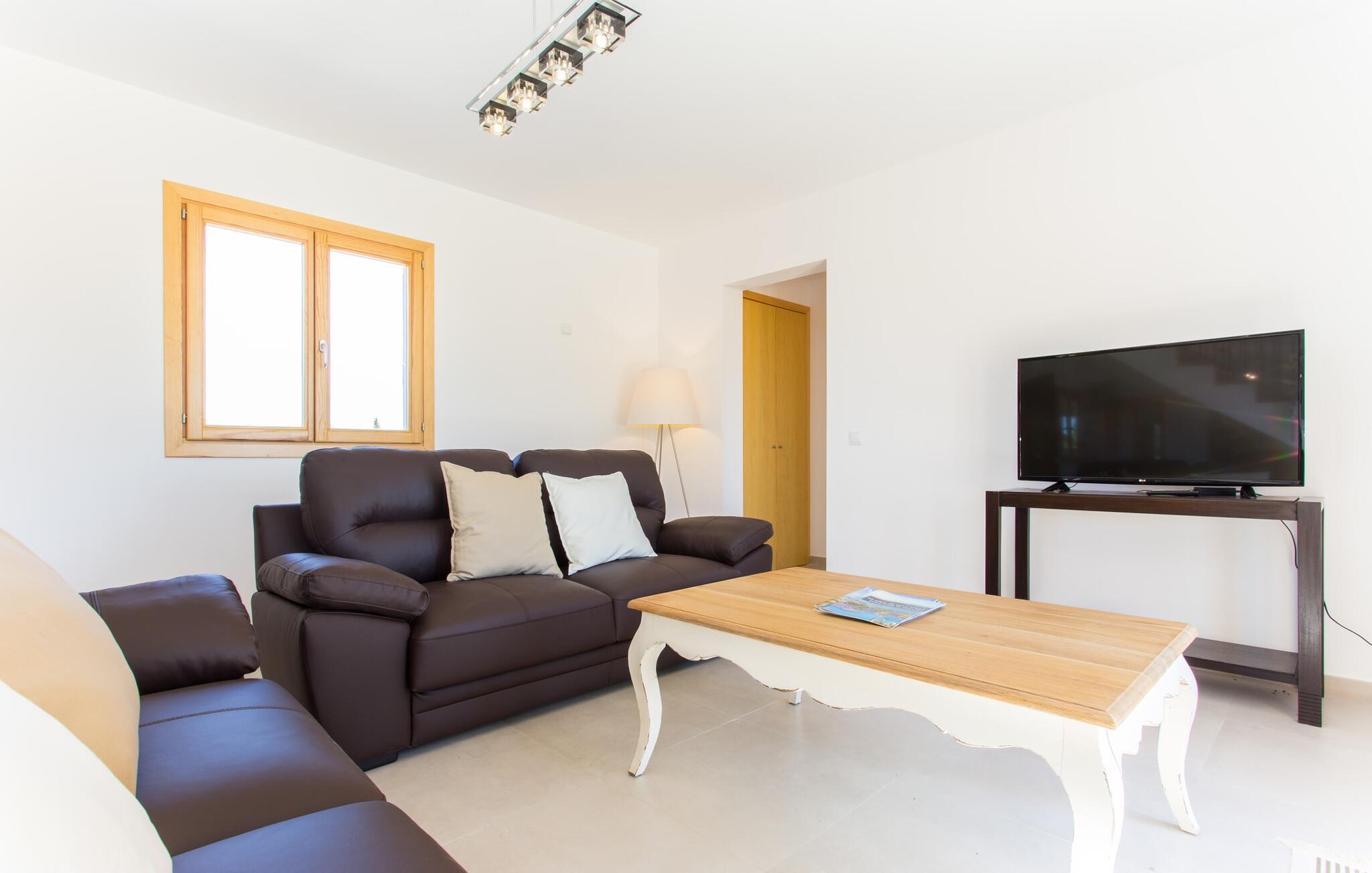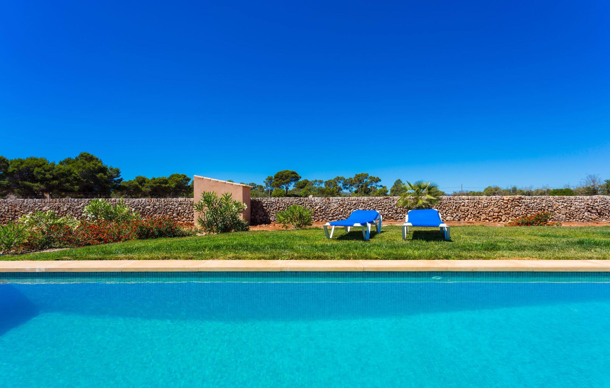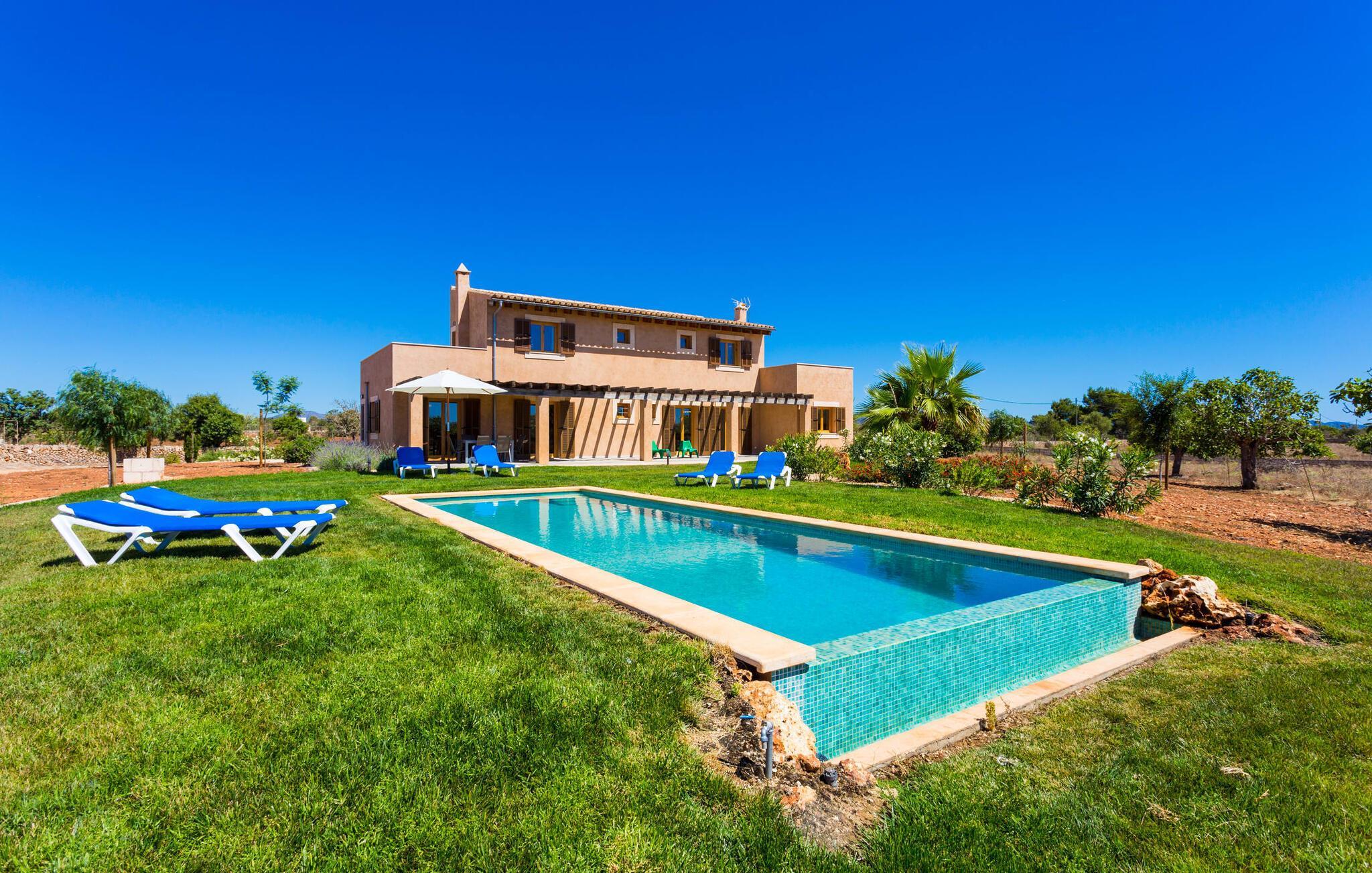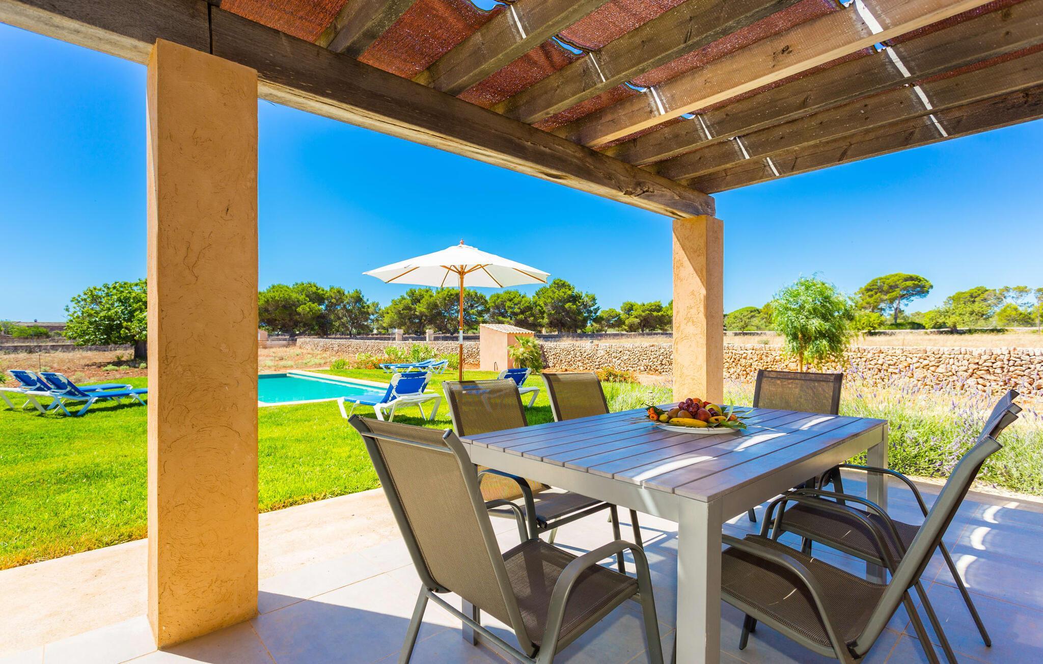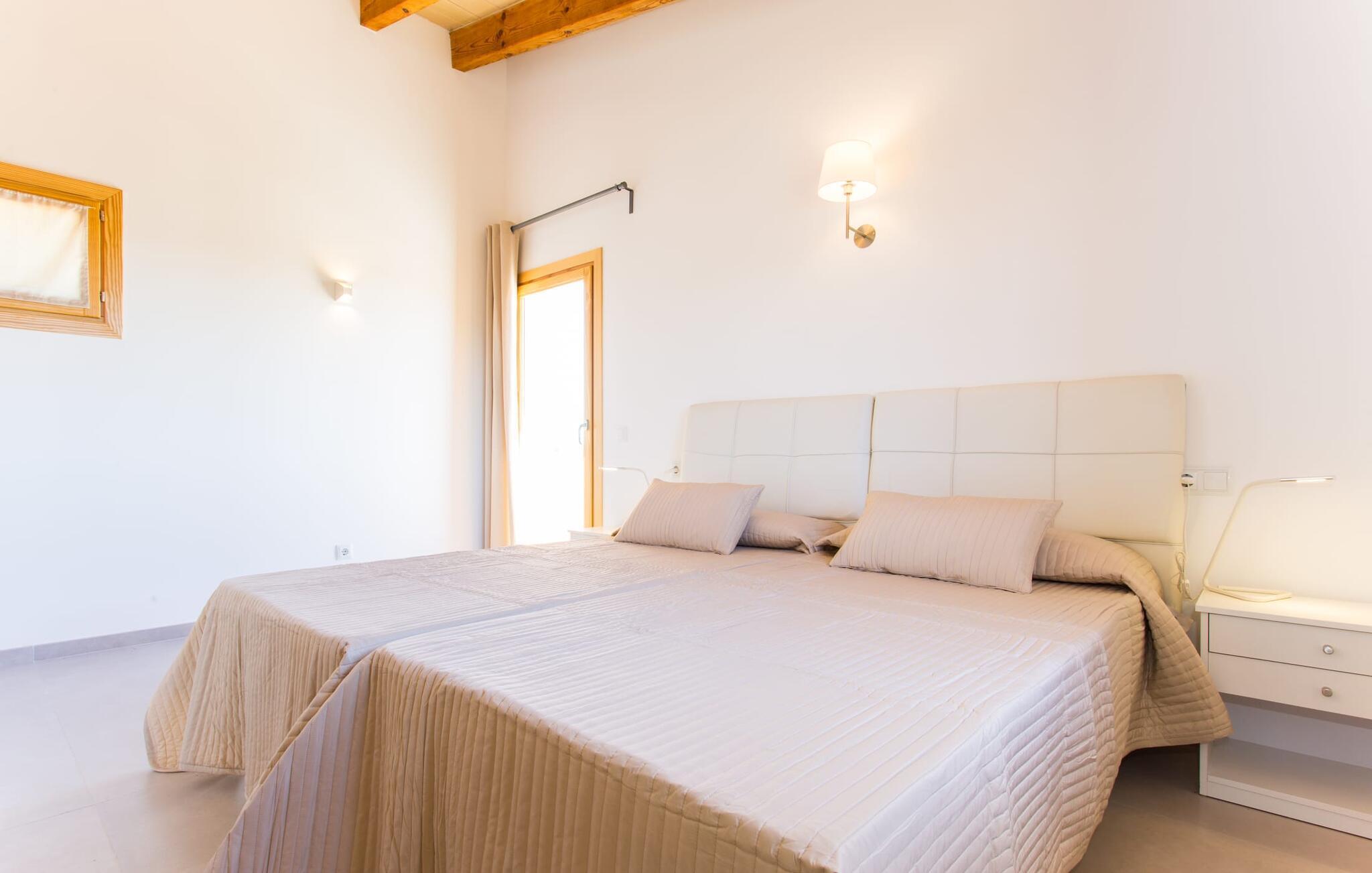 Nachbarn weit weg! Ein Hauch von Afrika umhüllt diese moderne Villa. Fotos lassen zunächst nicht erkennen, wie nah es am Meer oder an der Hafenstadt Porto Cristo liegt, die einst den Angriffen von Piraten widerstehen musste. Die Terra Rossa, die typische rote Erde vieler Regionen rund um das Mittelmeer, und der entfernte Hügelrücken lassen den zweigeschossigen Neubau wirken, als gehörte er schon immer zu dieser kargen, nur von wenigen Bäumen geprägten Landschaft. Allerdings haben Sie eine kleine Gartenoase, ein Fleckchen Grün, das den Pool liebevoll umgibt. In der Hochsaison ist es nicht ganz der richtige Ort für Schattenpflanzen, obwohl die lange Terrasse mit Pergola (Nomen est Omen) zumindest teilweise ein schützendes Dach über dem Kopf bietet; Hier gibt es viel Platz – sogar die Sonnenliegen und der Grill finden hier Unterschlupf. Wenn Sie jedoch zu denjenigen gehören, denen es nicht heiß genug ist, dorthin zu gehen, können Sie auch auf das Dach der Villa klettern, da die beiden Schlafzimmer im ersten Stock Zugang zu diesem privaten Plätzchen an der Sonne bieten.