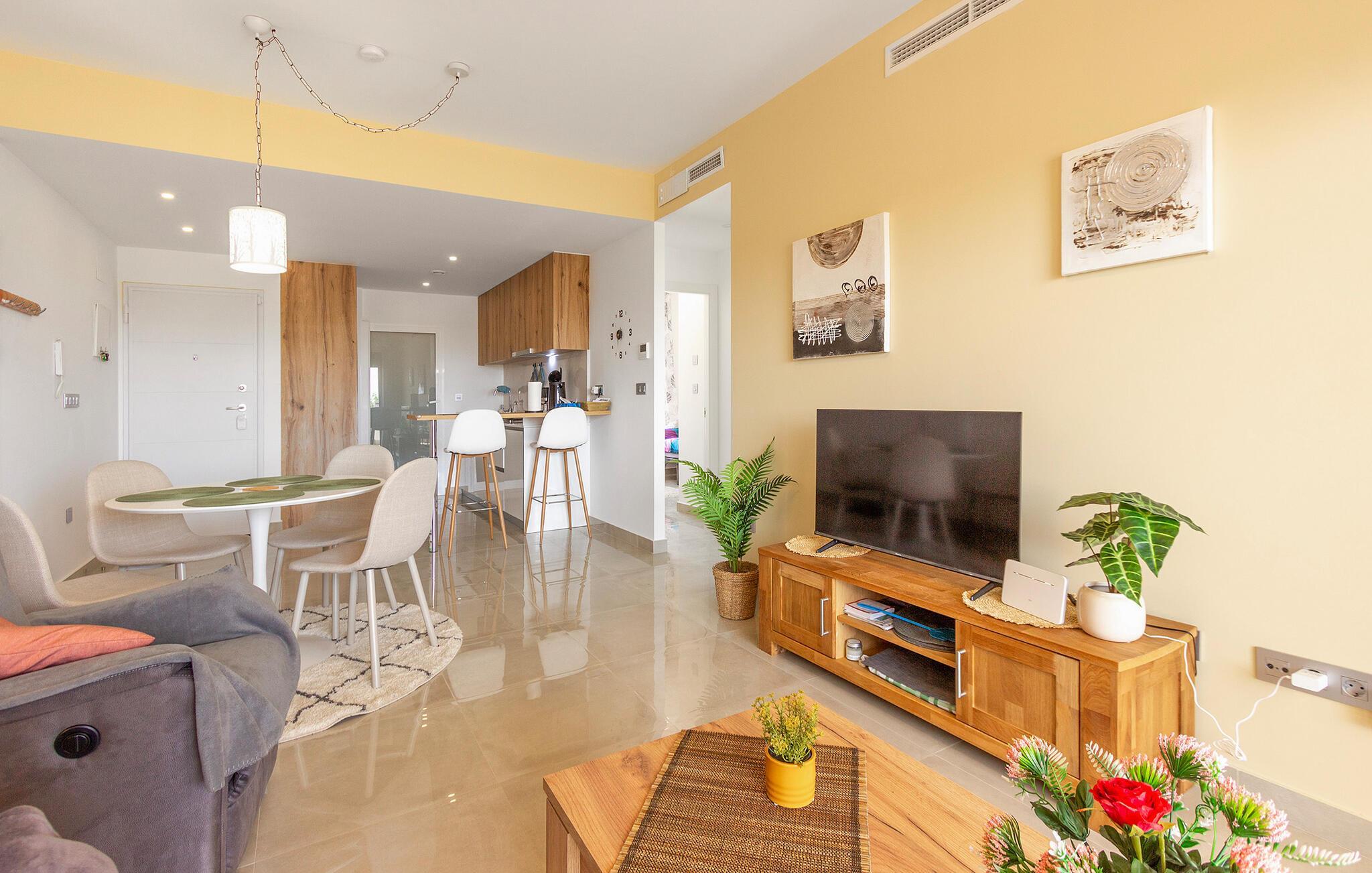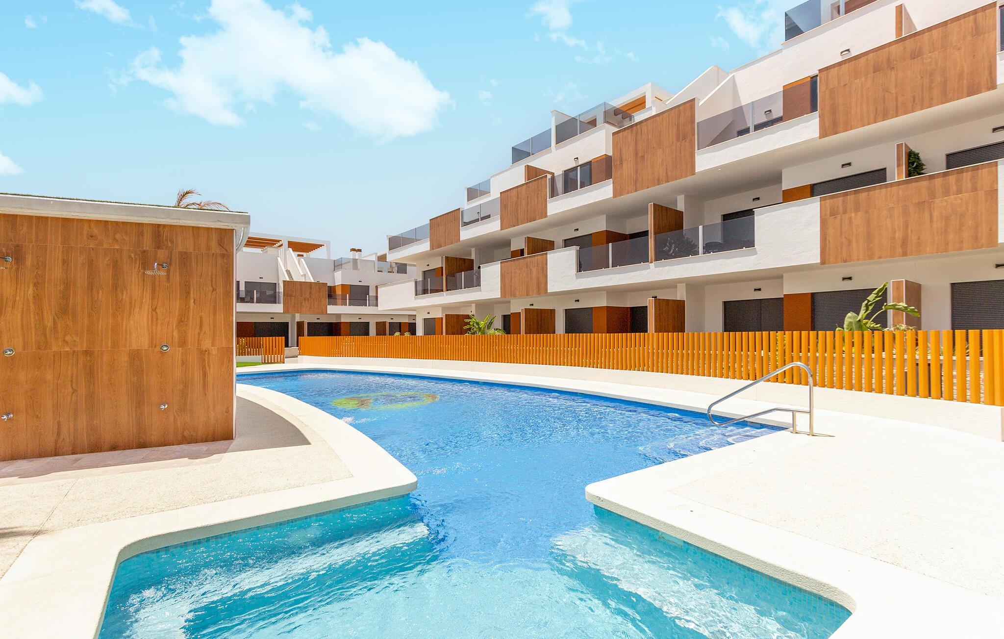 Genießen Sie diese moderne Ferienwohnung mit Gemeinschaftspool und schönem Spielplatz.