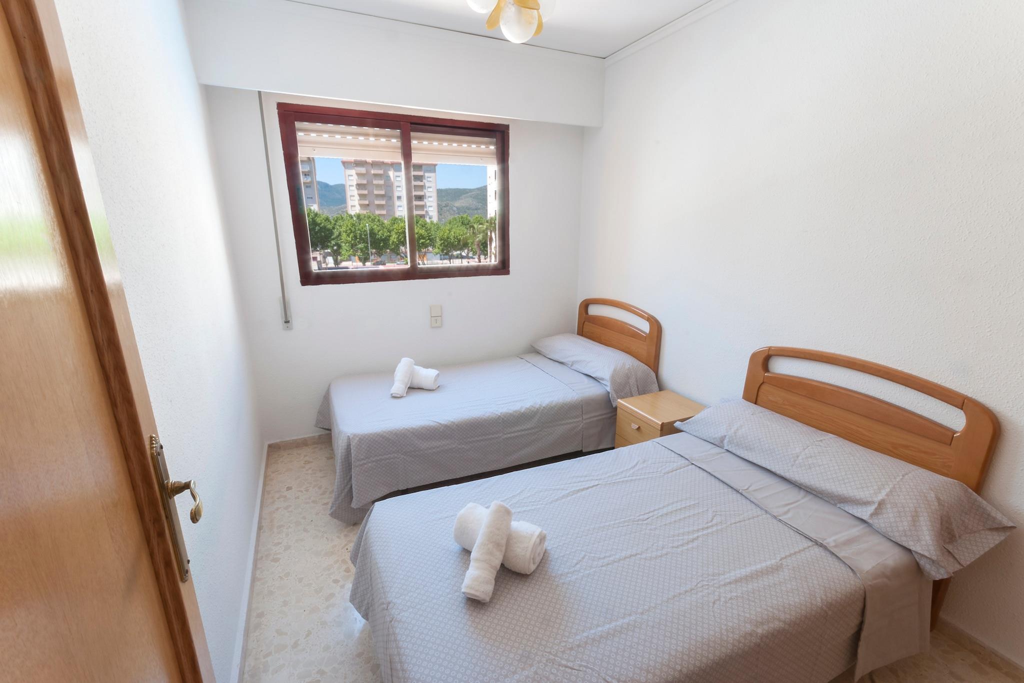 Sie haben Zugang zum 15mx 10m großen Gemeinschaftspool, der zwischen 1.5m und 2.2m tief ist und mit Chlor sauber gehalten wird. Die Kleinen können sich im 0.6m tiefen Kinderbecken erfrischen. Alle, die selbst im Urlaub nicht auf Sport verzichten möchten können den gemeinschaftlichen Tennisplatz benutzen (bitte nehmen Sie die Tennisausrüstung selbst mit). Die Wohnung liegt im vierten Stock mit Lift und hat eine 6m2 große, möblierte Terrasse mit Blick auf die Strasse und die Umgebung. Das hübsche Apartment hat einen Wohn-Essbereich mit Fernseher (nur Lokalsender), eine Küche mit Cerankochfeld und einigen Kochutensilien, ein Bad mit Badewanne sowie eine Waschmaschine, Bügeleisen und Bügelbrett. Hier wählt man zwischen drei Schlafzimmern, davon zwei mit je zwei Einzelbetten und eines mit Doppelbett und Bad en-suite mit Badewanne. Ein Babybettchen und ein Hochstuhl stehen auf Anfrage zur Verfügung. Zwei Elektroheizkörper und drei Ventilatoren runden die Ausstattung ab. Dieses hübsche Apartment befindet sich nur wenige Meter vom feinen Sandstrand Playa de Gandia. Dort können Sie Sonnenliegen und Schirme mieten, Volleyball spielen, Wassersportarten ausüben, auf der Promenade spazieren gehen und sich in einem der Cafés oder Eisdielen stärken. Zusammenfassend kann man sagen, dass Playa de Gandia für jeden Geschmack etwas bereit hält, egal ob man einen Strand- oder einen Aktivurlaub plant. Im Altstadtkern von Gandia können Sie mehr über die Vergangenheit dieser charmanten Stadt lernen. Eine Route in der Innenstadt führt Sie von der Kirche Colegiata de Santa Maria, über das hübsche Rathaus, bis hin zum Nonnenkloster Santa Clara. Der Pool ist ab der Osterwoche bis 30. September von 09:00h bis 15:00h und von 17:00h bis 22:00h geöffnet. Hinweis: Diese Unterkunft richtet sich an Familien und Gäste über 27 Jahre, die einen ruhigen Aufenthalt suchen. Buchungen für Partys oder Feiern werden nicht akzeptiert. Eine Kopie des Ausweisdokuments aller Gäste ist erforderlich, um die Reservierung zu bestätigen. Eventuelle Nebenkosten müssen beim Anbieter nachgefragt werden. Bitte beachten Sie, dass sich die Schlüssel für den Zugang zur Unterkunft in einem Briefkasten an einer nahegelegenen Tankstelle befinden. Sie erhalten die Koordinaten der Tankstelle sowie die Details zum Briefkasten drei Tage vor Ihrer Ankunft. Haustiere sind verboten. Partys oder ähnliche Veranstaltungen sind nicht gestattet. Bitte beachten Sie, dass die Öffnungs- und Schließzeiten des Gemeinschaftspools den jeweiligen Hausordnungen unterliegen und je nach Saison ohne vorherige Ankündigung variieren können. Aktuelle Informationen erhalten Sie bei Ihrer Ankunft. Entfernungen Strand: 0.35 km - Playa de Gandia Flughafen: 75 km - Valencia Golfplatz: 17 km - Oliva Nova Golf Ortsmitte: 0.01 km - Playa de Gandia Bahnhof: 2 km - Grau de Gandia Bushaltestelle: 0.07 km - Playa de Gandía Fähre: 45 km - Dénia Krankenhaus: 7 km - Gandía Touristen Lizenz: CV-VUT0040569-V