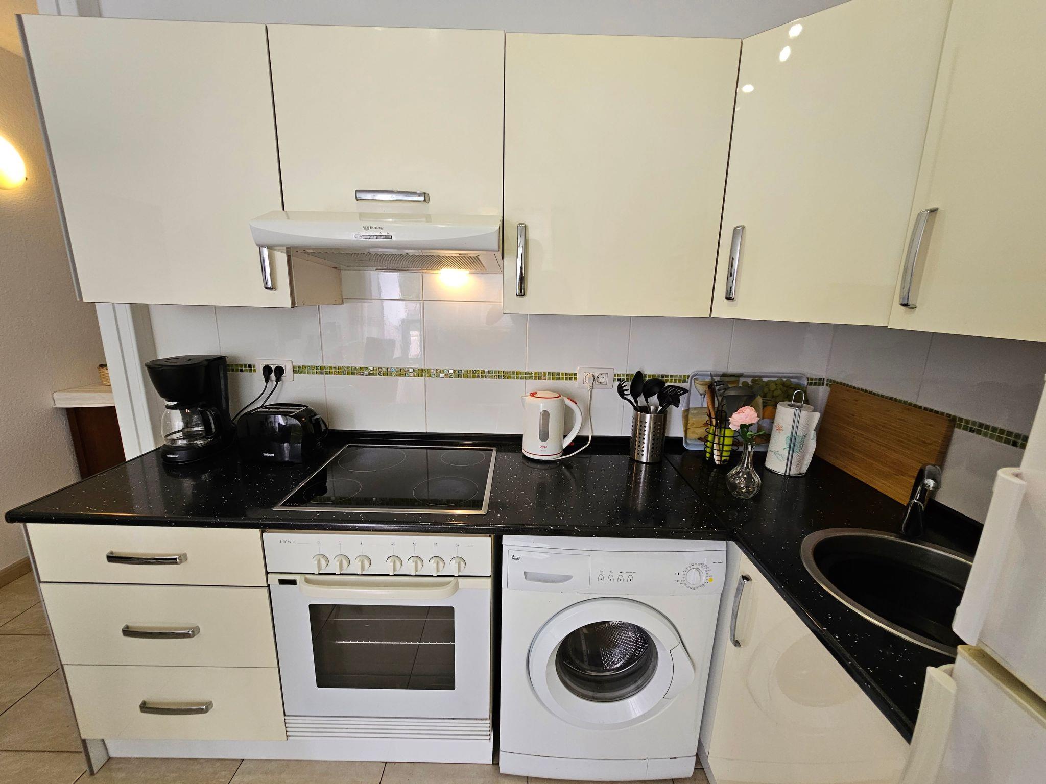 Die Küche verfügt über ein Cerankochfeld, einen Backofen, Kühl- und Gefrierschrank, eine Mikrowelle, sowie Toaster, Wasserkocher und eine Kaffeemaschine. Außerdem gibt es eine Waschmaschine mit Bügeleisen und Bügelbrett. Das Schlafzimmer verfügt über zwei Einzelbetten die zusammenstehen.