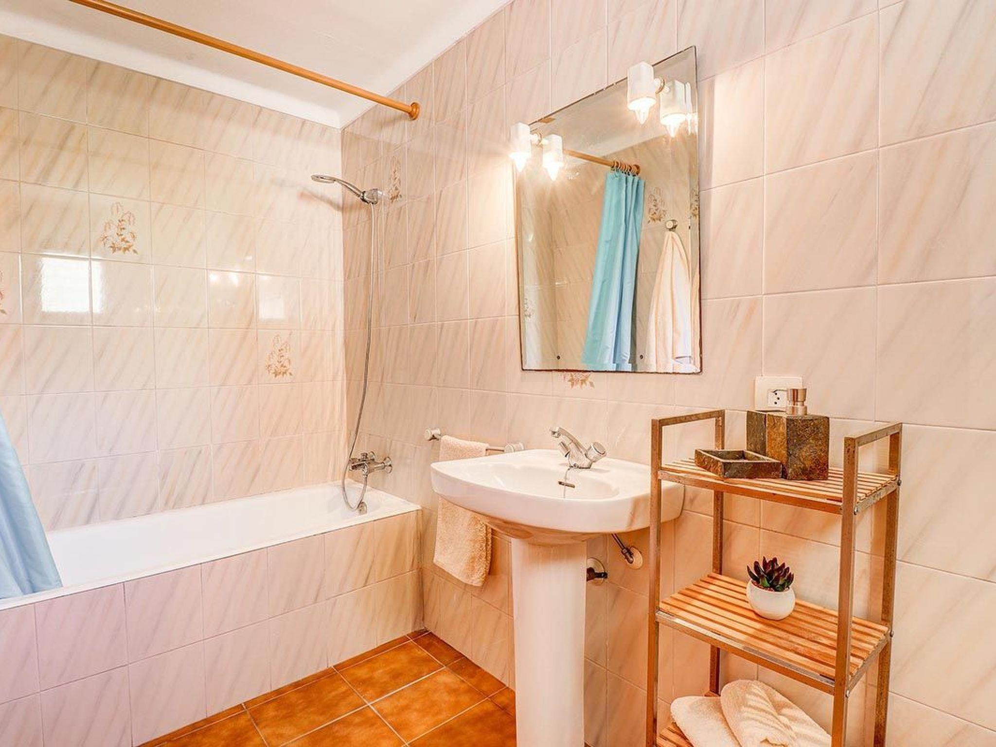 Das Innere des Hauses ist mit Holzmöbeln komfortabel und gemütlich eingerichtet. Sobald Sie eintreten, finden Sie das Esszimmer, das mit einem Wohnzimmer mit Satellitenfernsehen und DVD-Player verbunden ist, das wiederum mit dem Poolbereich verbunden ist. Die Küche ist mit Mikrowelle, Geschirrspüler, Gas- und Elektroherd und Kühlschrank mit Gefrierfach ausgestattet. Es gibt auch einen Hauswirtschaftsraum mit einer Waschmaschine. Auf der gleichen Etage befinden sich ein Schlafzimmer mit Doppelbett und eigenem Bad, ein Schlafzimmer mit zwei Einzelbetten und ein zweites Bad. Im Obergeschoss gibt es ein Schlafzimmer mit Doppelbett, ein Schlafzimmer mit zwei Einzelbetten und ein drittes Badezimmer.