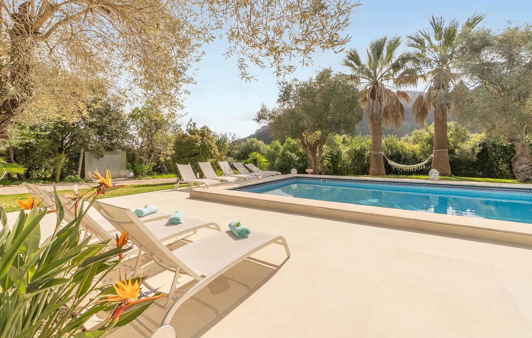 Der gepflegte, blickgeschützte Außenbereich ist wie geschaffen, um das mediterrane Klima von früh bis spät in vollen Zügen zu genießen. Ziehen Sie in der milden Morgensonne ruhige Bahnen im Pool und servieren Sie sich frisch gepressten Orangensaft zum Frühstück auf der überdachten Terrasse. Genießen Sie die friedliche Atmosphäre auf der Hängematte oder dem balinesischen Bett und zelebrieren Sie die lauen Sommernächte bei Wein und Kerzenschein in der eleganten Outdoor-Lounge.