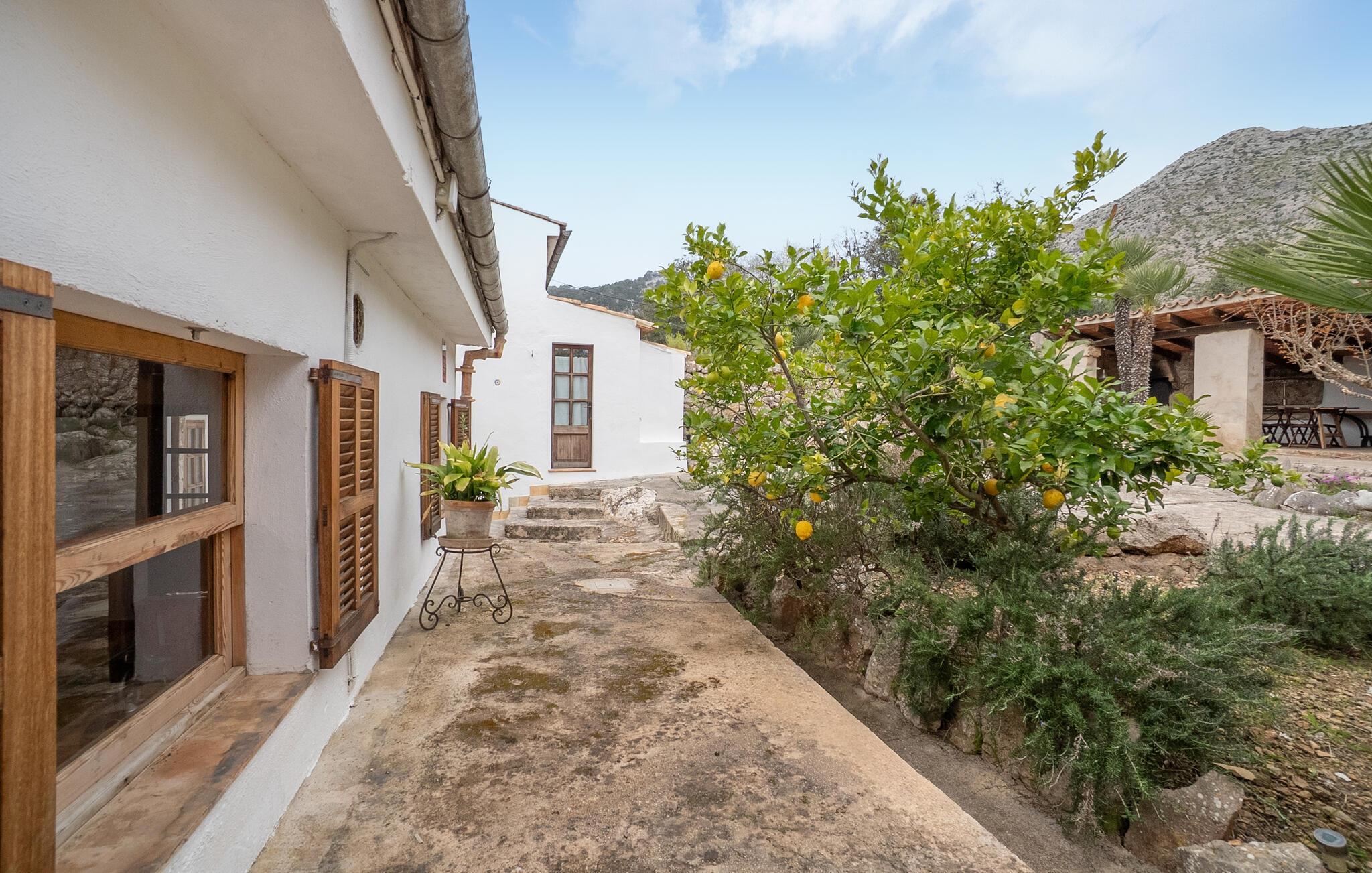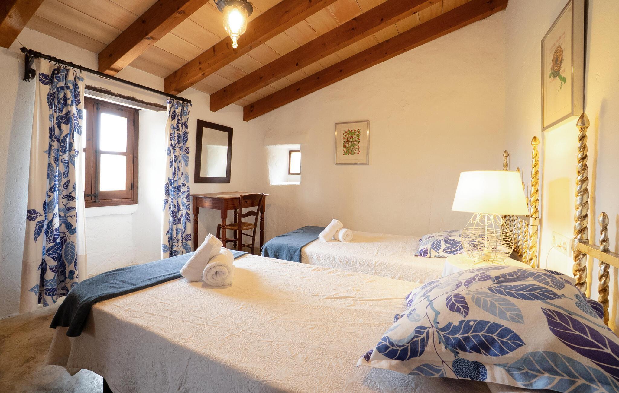 Diese geräumige Finca mit rustikalem Charme empfängt Sie mit sichtbarem Fachwerk, stimmungsvollen Steinwänden und einer liebevollen Einrichtung. Die stilvolle Dekoration und warme Farbtöne schaffen eine behagliche Atmosphäre, die Sie zum Entspannen einlädt. In der gut ausgestatteten Küche bereiten Sie köstliche Mahlzeiten zu, während das großzügige Wohnzimmer ideal für gesellige Abende ist. Draußen erwartet Sie ein weitläufiger Garten mit mediterranen Pflanzen, gemütlichen Terrassenbereichen, einem Grill und einem herrlichen Swimmingpool mit Sonnenliegen.