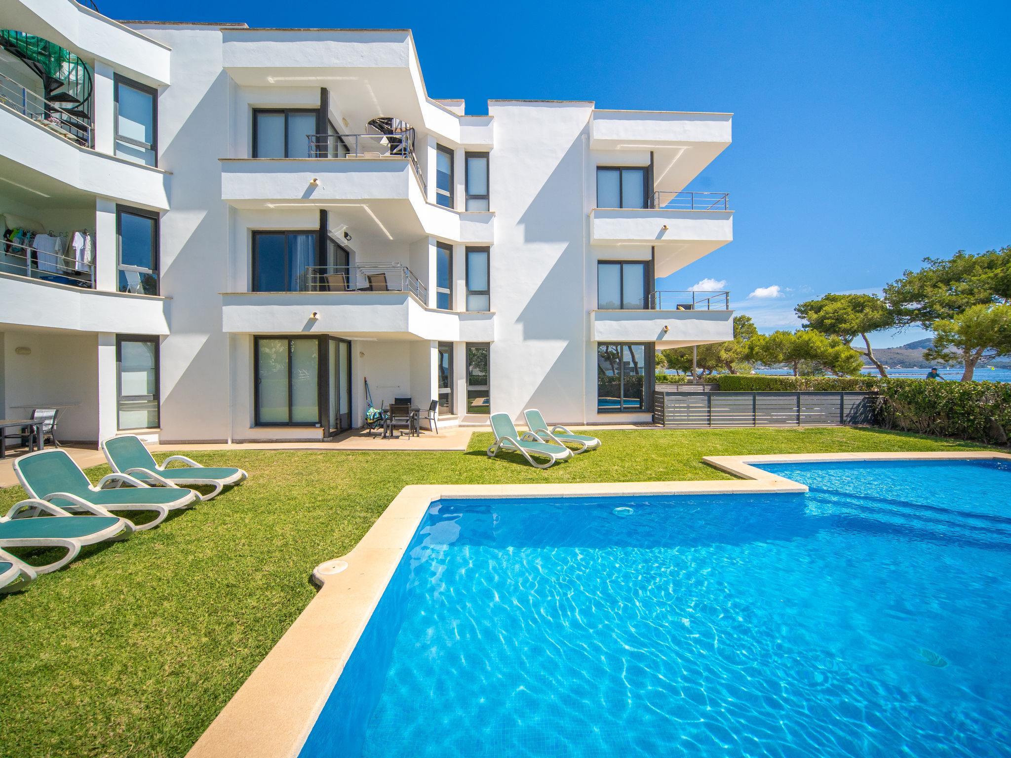 Modernes, schönes, komfortables Appartementhaus "Oratge Beach Views". Im Ort, 900 m vom Zentrum von Port de Pollença, ruhige, sonnige Lage, exzellente Lage: Absolut zentral und dennoch ruhig, 2.5 km vom Waldrand, 10 m vom Meer, 10 m vom Strand, Strasse zu überqueren. Zur Mitbenutzung: Garten mit Rasen, Schwimmbad (8 x 4 m, 40 - 165 cm tief, saisonale Verfügbarkeit: 01.Jan. - 31.Dez.). Aussendusche. Zur Alleinbenutzung: Terrasse (6 m2). Im Hause: Internetzugang, Wireless LAN, Klimaanlage, Waschmaschine. Öffentliches Parkhaus in 25 m, öffentliche Parkplätze auf der Strasse. Einkaufsgeschäft 1.2 km, Lebensmittelgeschäft 500 m, Supermarkt 600 m, Restaurant 50 m, Bar 100 m, Bäckerei 1.5 km, Fußgängerzone 600 m, Fahrradverleih 900 m, Biergarten 50 m, Zentrum zu Fuss in 10 Minuten erreichbar, Bushaltestelle 500 m, Sandstrand 10 m, Steinstrand 50 m. Sporthafen 1.7 km, Jacht-Hafen 1.7 km, Golfplatz (18 Loch) 9.8 km, Tennis 2 km, Wanderwege ab Haus 1.5 km, Radweg 1.5 km. Nahe gelegene Sehenswürdigkeiten: Pollença Pueblo 6.7 km, Far de Formentor 23 km, Ciudad Romana de Alcúdia 7 km, Playa de Formentor 12 km, Cala Sant Vicenç 11.2 km, Mercado Local Miércoles 8-13h. Wandergebiete: Cala Boquer, Atalaya de Alcúdia, Serra de Tramuntana. Bitte beachten: kein Fahrstuhl vorhanden. Objekt geeignet für 2 Erwachsene. Flugplatz 66 km vom Haus. Die Nachbarschaft ist sehr lärmempfindlich. Ruhe und gutes Benehmen wird erwartet.