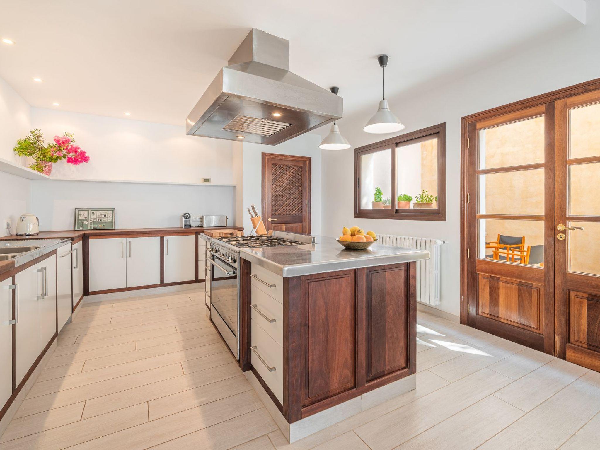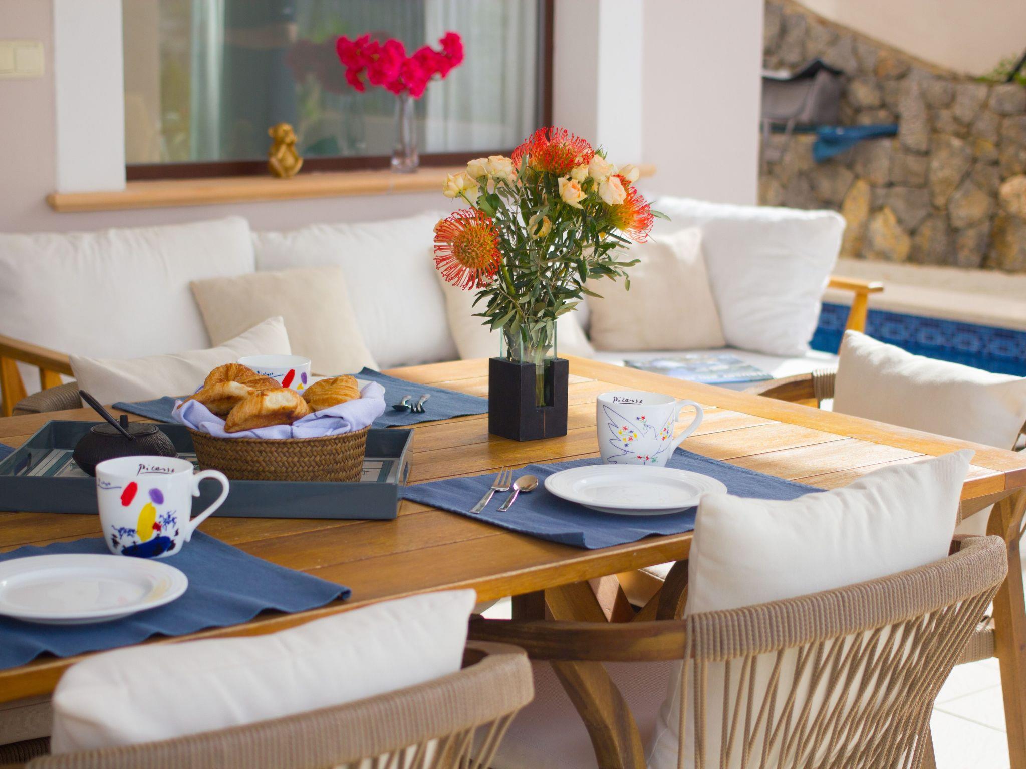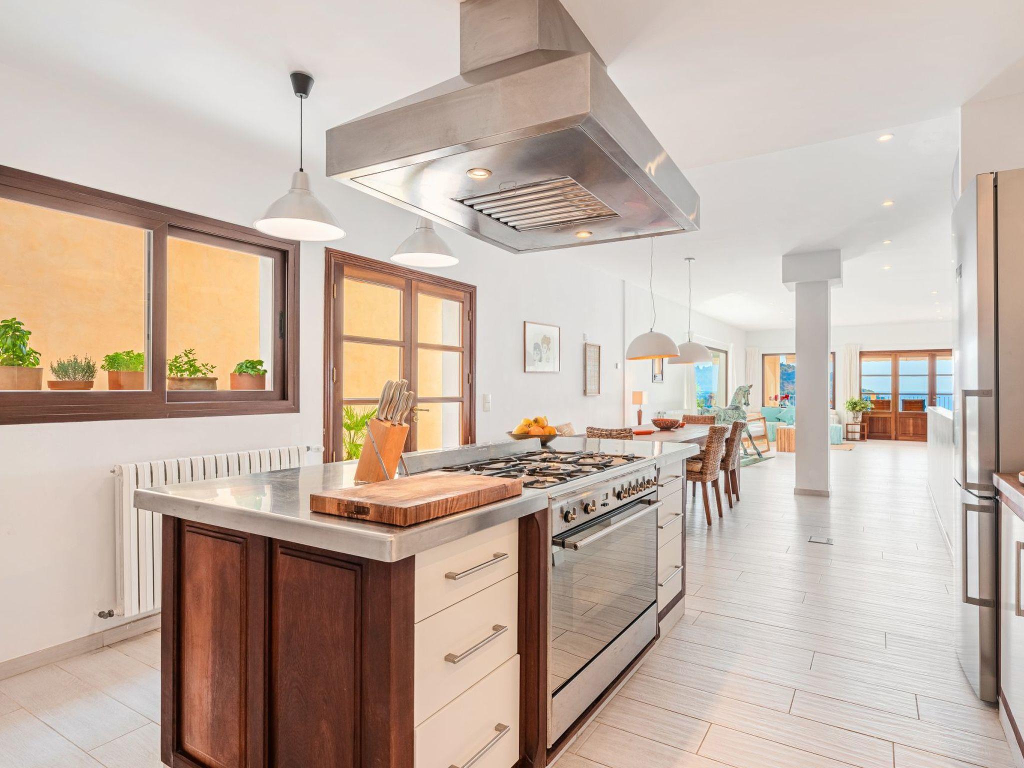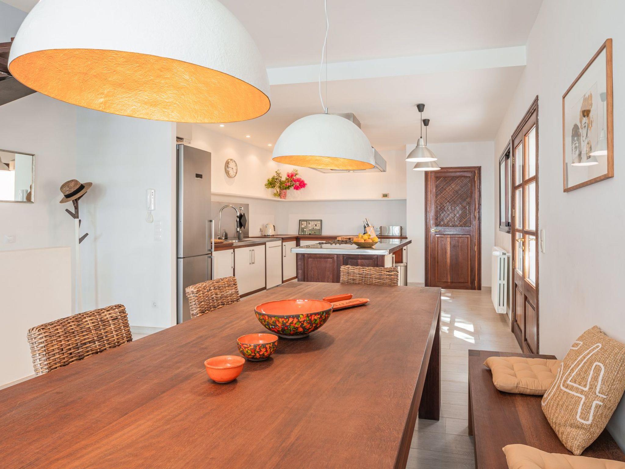 Zeitgenössischer mediterraner Baustil. Ca. 350 qm bebaute Fläche inkl. 150qm Terrasse auf 2 Etagen, 3 Schlafzimmer (mit Klimaanlage), 3 Bäder (1 en suite), großzügiger Wohn- und Essbereich, offene Küche mit großer Kochinsel (SMEG, Gas), Kühl-/Gefrierschrank (Bosch), Spülmaschine, Trockner und Waschmaschine (Miele), separater Abstellraum. Zentralheizung. Essecke für 8 Personen. Küche und Essbereich mit individuellen Schreinerarbeiten, hochwertige Ausstattung mit liebevollen Details. Wohnzimmer mit LOEWE-TV, Apple TV, bequemer Ledercouch und Schaukelstühlen. Eine Hausmanagerin und ein Hausmeister stehen bei Bedarf zur Verfügung.