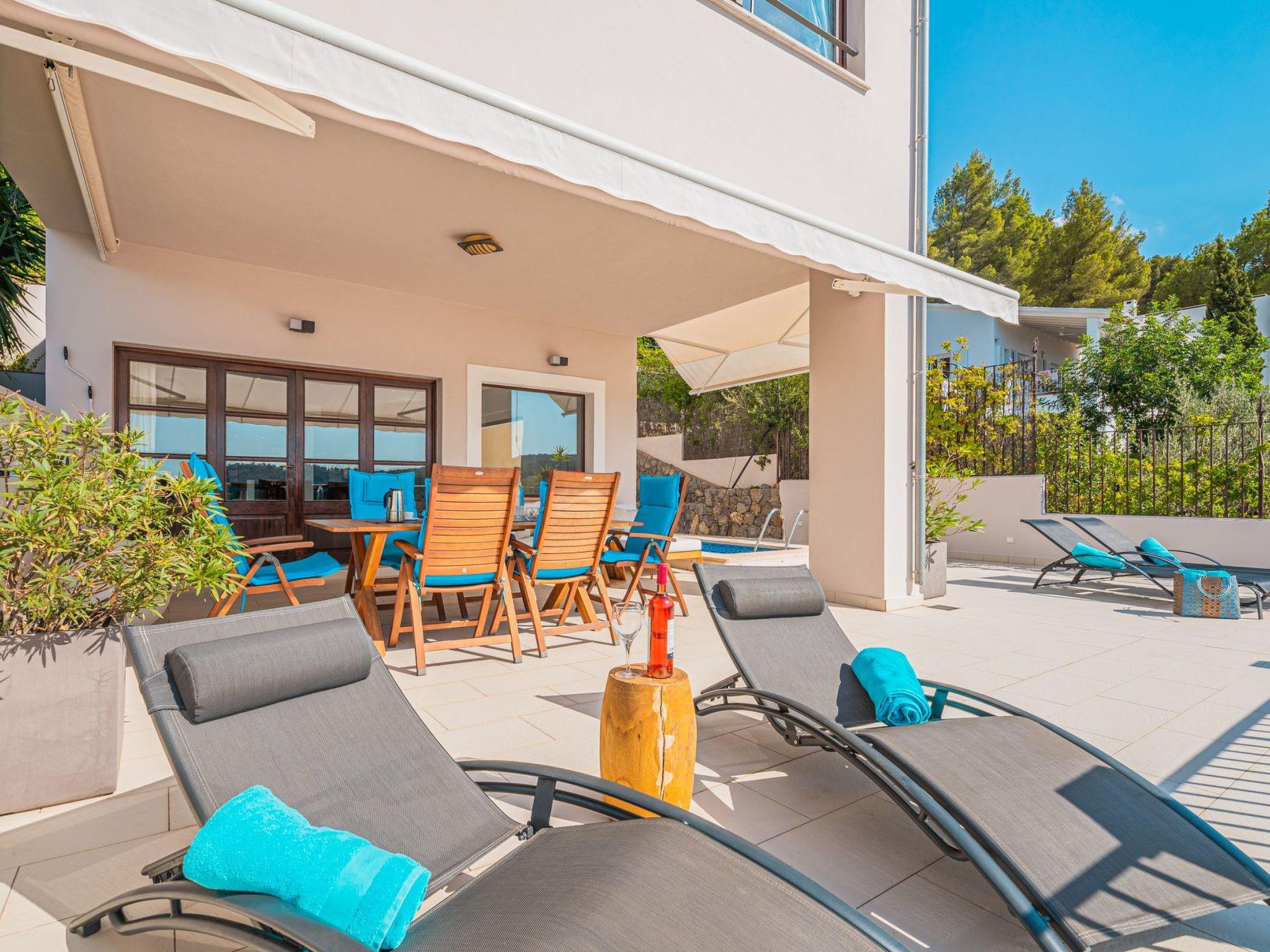 Außenbereich mit 150qm Terrasse und Lounge, großem Esstisch für sechs Personen und Pool auf der Wohnebene mit Holzkohlegrill. Schattiger zusätzlicher Essplatz vor dem Holzkohlegrill für vier Personen. Unvergleichlicher Panoramablick auf den Hafen und das Meer von der Terrasse und der obersten Etage und direkter Blick auf den Sonnenuntergang an der Westküste.