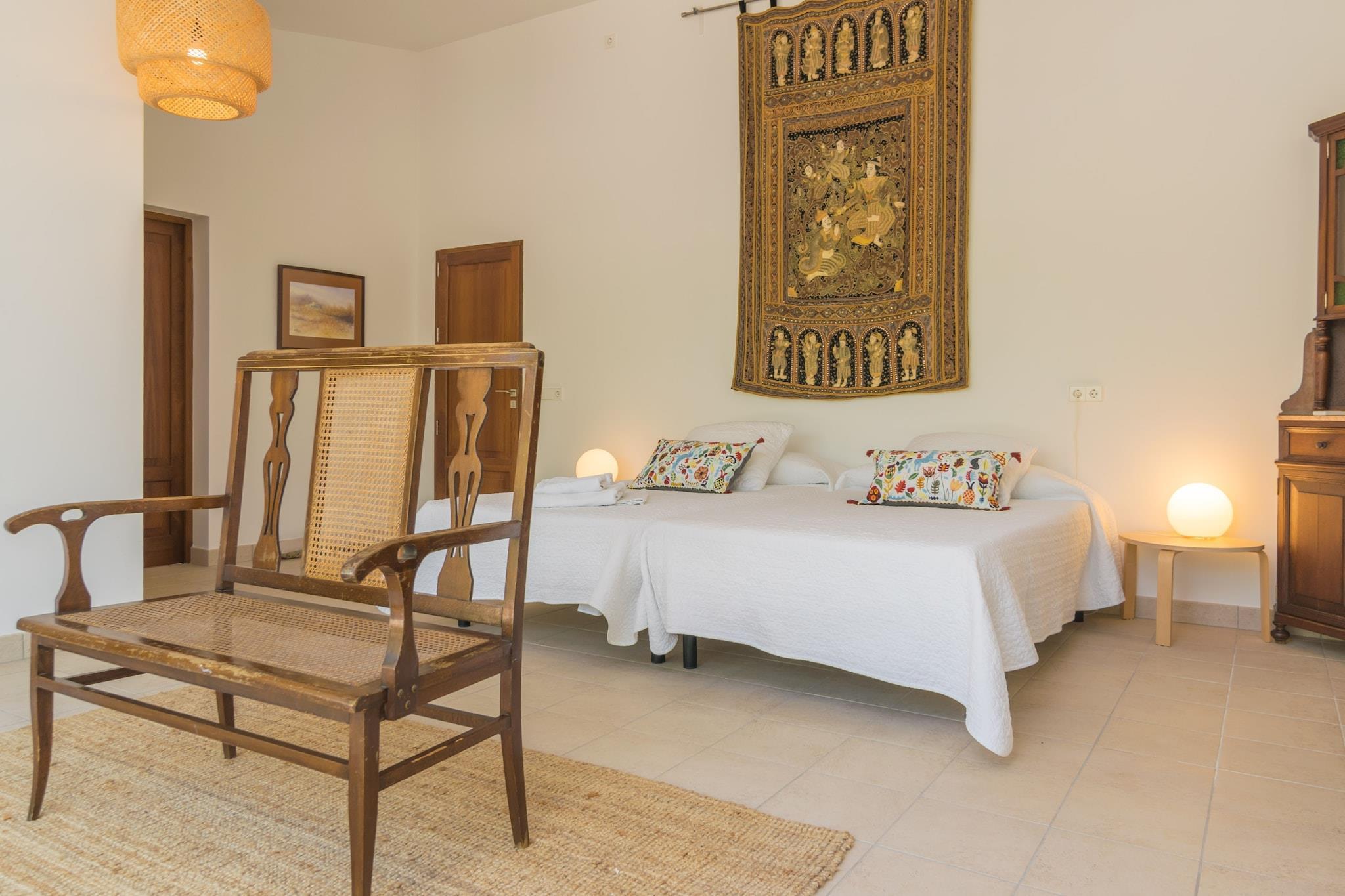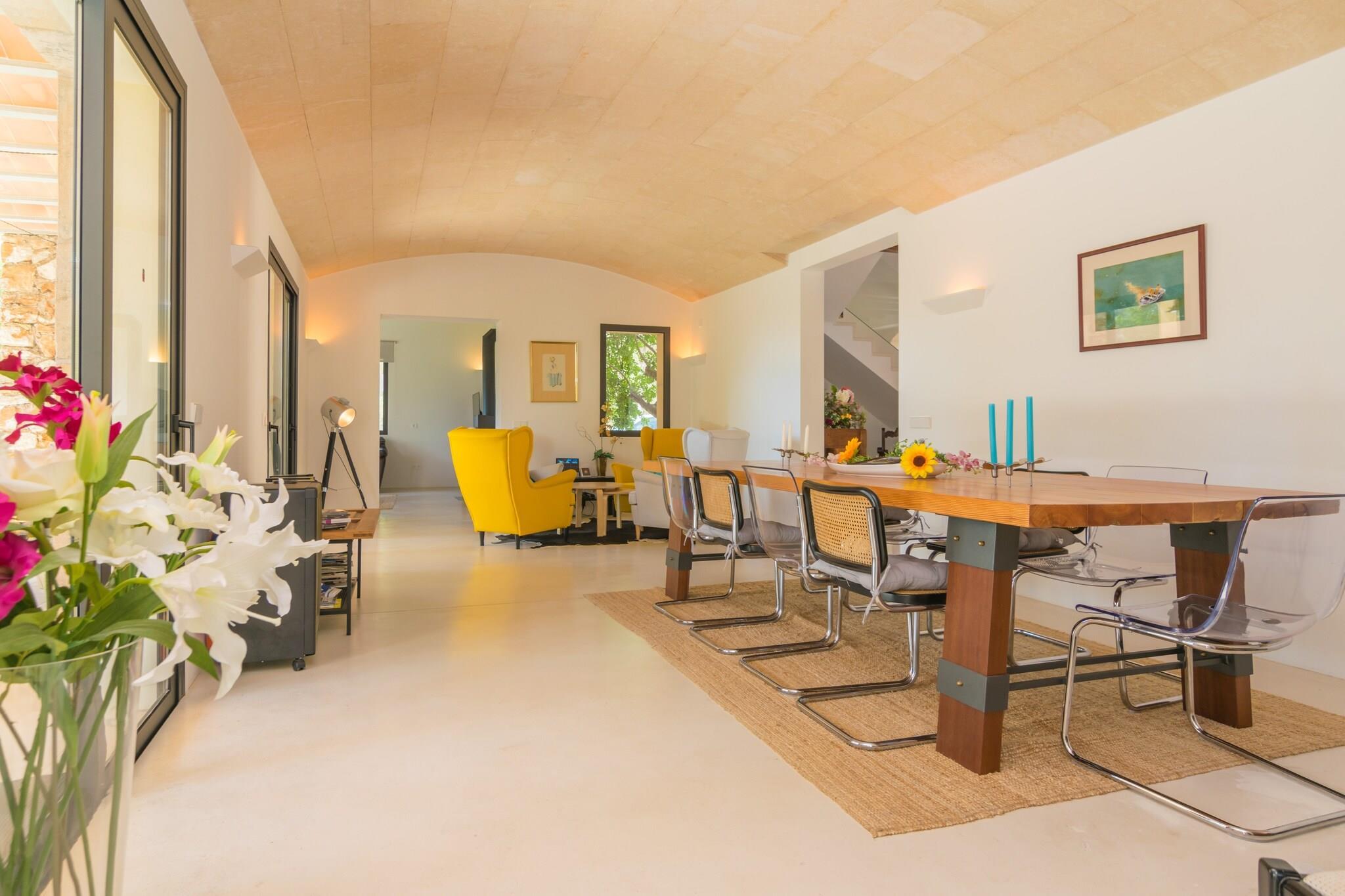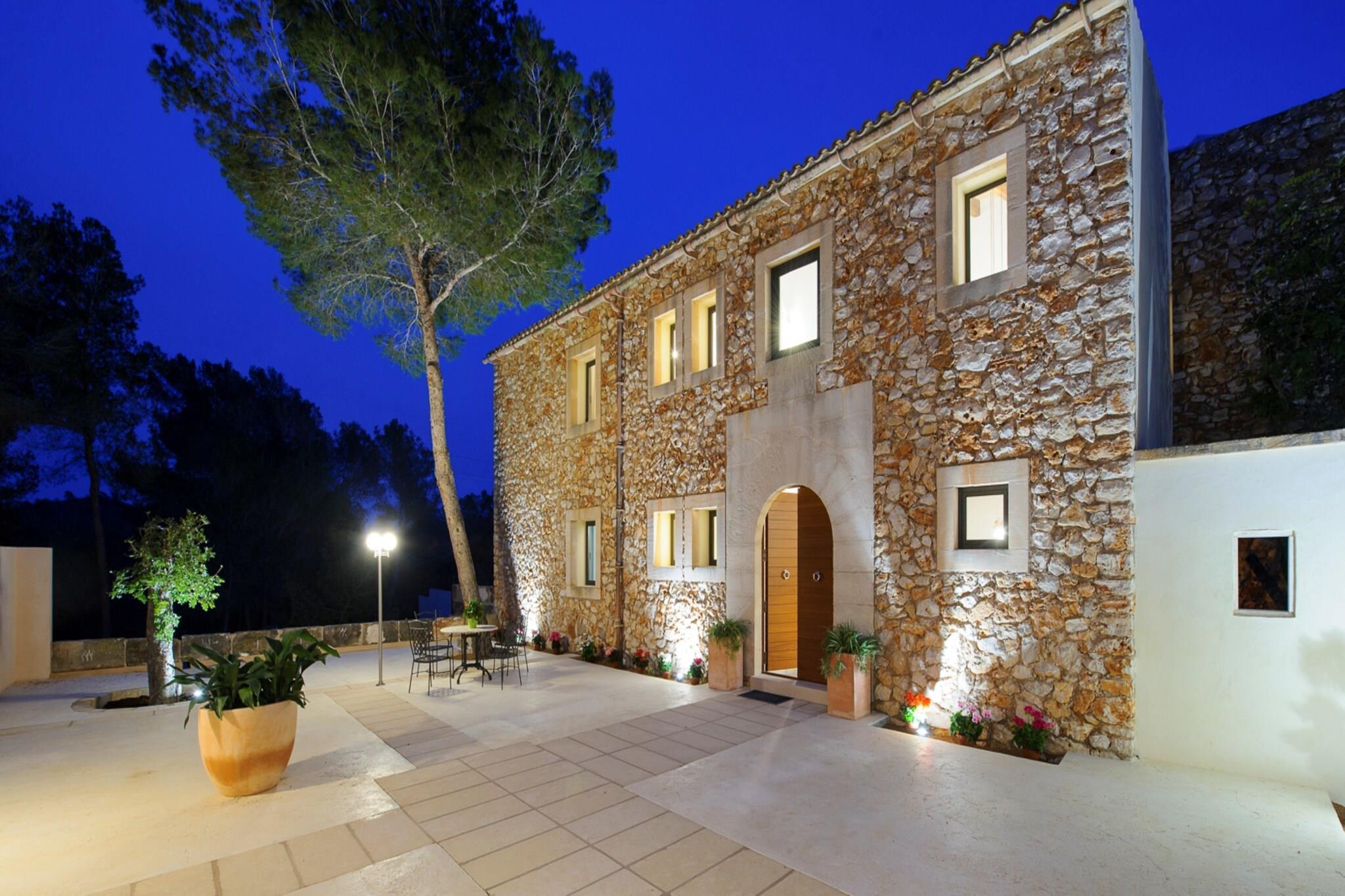 Zum 28.000 m2 großen Grundstück dieser eleganten Finca gehören der private Pool, Garten, Terrassen und die Veranda. Die Bruchsteinfassade der Finca kommt vor allem nachts dank der tollen Beleuchtung gut zur Geltung, wovon man sich auf der vorderen Terrasse bei einem Gläschen Wein überzeugen kann. Im 12 x 4 Meter großen Pool kann man sowohl tagsüber als auch abends seine Bahnen ziehen. Das Wasser wird mit Chlor sauber gehalten und die Tiefe variiert zwischen 1.1 und 1.7 Meter. Rundherum erstreckt sich einerseits die Poolterrasse mit 10 Sonnenliegen und andererseits der Kunstrasen, wo man sein Handtuch ausbreiten kann. Die poolseitige Veranda mit gemauertem Grill, Gasherd und Geschirrspüler lädt zu langen Sommerabenden mit Freunden ein. Egal, ob man es sich in der Sitzecke gemütlich macht oder den Tag mit einem ausgiebigen Frühstück rund um den Esstisch beginnen mag - auf der Veranda ist genügend Platz für alle. Das Haus ist brandneu und mit unschlagbarem Geschmack und Dekoration gestaltet. Der Blick auf die Landschaft und den Wald von innen wird niemanden gleichgültig lassen. Es verfügt über ein Wohnzimmer mit Satellitenfernsehen und Klimaanlage, ein exklusiv gestaltetes Esszimmer mit Platz für mehrere Personen, eine voll ausgestattete Küche mit Cerankochfeld, Backofen, Mikrowelle und allem, was man braucht, sowie insgesamt fünf Schlafzimmer und sechs Bäder mit Dusche. Zwei der Schlafzimmer mit zwei Einzelbetten (eines davon mit eigenem Bad mit Dusche) und ein Außenbad befinden sich auf dieser Etage. Im Obergeschoss befinden sich die restlichen drei Schlafzimmer, zwei davon mit zwei Einzelbetten und eines mit einem Doppelbett, sowie die restlichen drei Bäder, alle mit Dusche und en-suite. Alle Schlafzimmer sind mit Kleiderschränken und Klimaanlage ausgestattet und zwei von ihnen haben Zugang zu einer Terrasse und die Möglichkeit, bis zu zwei Kinderbetten und zwei Hochstühle unterzubringen. Es gibt eine separate Waschküche mit Waschmaschine, Bügeleisen und Bügelbrett. Die Finca liegt ca. 70 Meter von der Hauptstraße Portocolom-Felanitx entfernt, die je nach Verkehrslage akustisch wahrnehmbar ist. Dank dieser guten Lage ist man in wenigen Minuten Autofahrt sowohl in Felanitx als auch an den herrlichen Stränden der Ostküste. Der authentische Ort Felanitx bietet alles, was man im Urlaub als Selbstversorger braucht, darunter Supermärkte und Restaurants. An der Küste befinden sich wie an einer Perlenkette aufgereiht viele schöne Strände. Cala Marçal, Cala Murada oder Cala Domingos sind nur ein paar davon. Eventuelle Nebenkosten müssen beim Anbieter nachgefragt werden. Haustiere sind verboten. Partys oder ähnliche Veranstaltungen sind nicht gestattet. Es gibt Freiluftparkplätze für 5 Autos. Entfernungen Strand: 8.3 km - Cala Marçal Flughafen: 50.8 km - Son Sant Joan Golfplatz: 5.2 km - Golf Vall d'Or Ortsmitte: 5.3 km - Felanitx Bahnhof: 17.6 km - Estació de Manacor Bushaltestelle: 5.3 km - Felanitx Fähre: 60.7 km - Port de Palma Krankenhaus: 19.5 km - Hospital de Manacor Touristen Lizenz: ETV/8262Einheitsregister: ESFCTU00000700800010097600000000000000000000ETV/82624Bei der Anreise muss die Ecotasa (Touristensteuer der Balearen) bar bezahlt werden. Der zu zahlende Betrag beträgt zwischen 0.55EURO pro Nacht und Gast in der Nebensaison und 2.2EURO pro Nacht und Gast in der Hochsaison. Ab dem 9. Tag reduziert sich die Steuer um die Hälfte. Personen unter 16 Jahren sind davon ausgenommen.Die Kaution ist bei Ankuuft direkt an den Eigentümer zu übergeben.