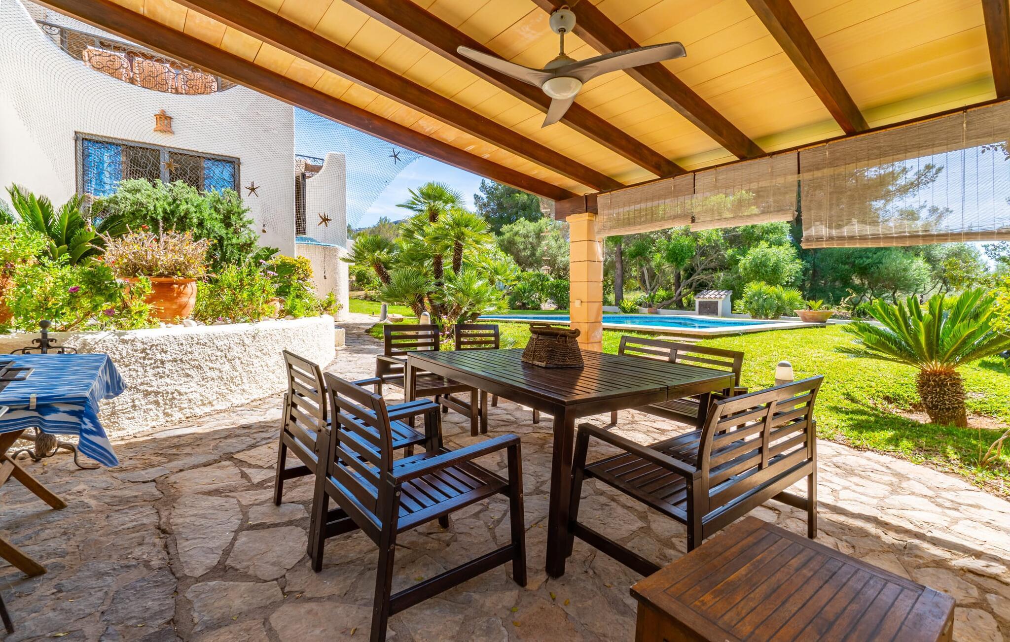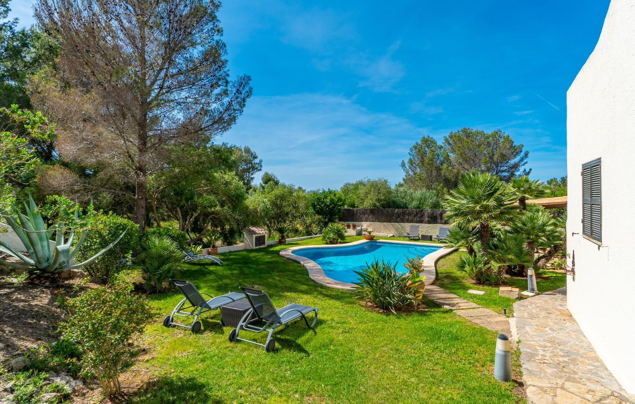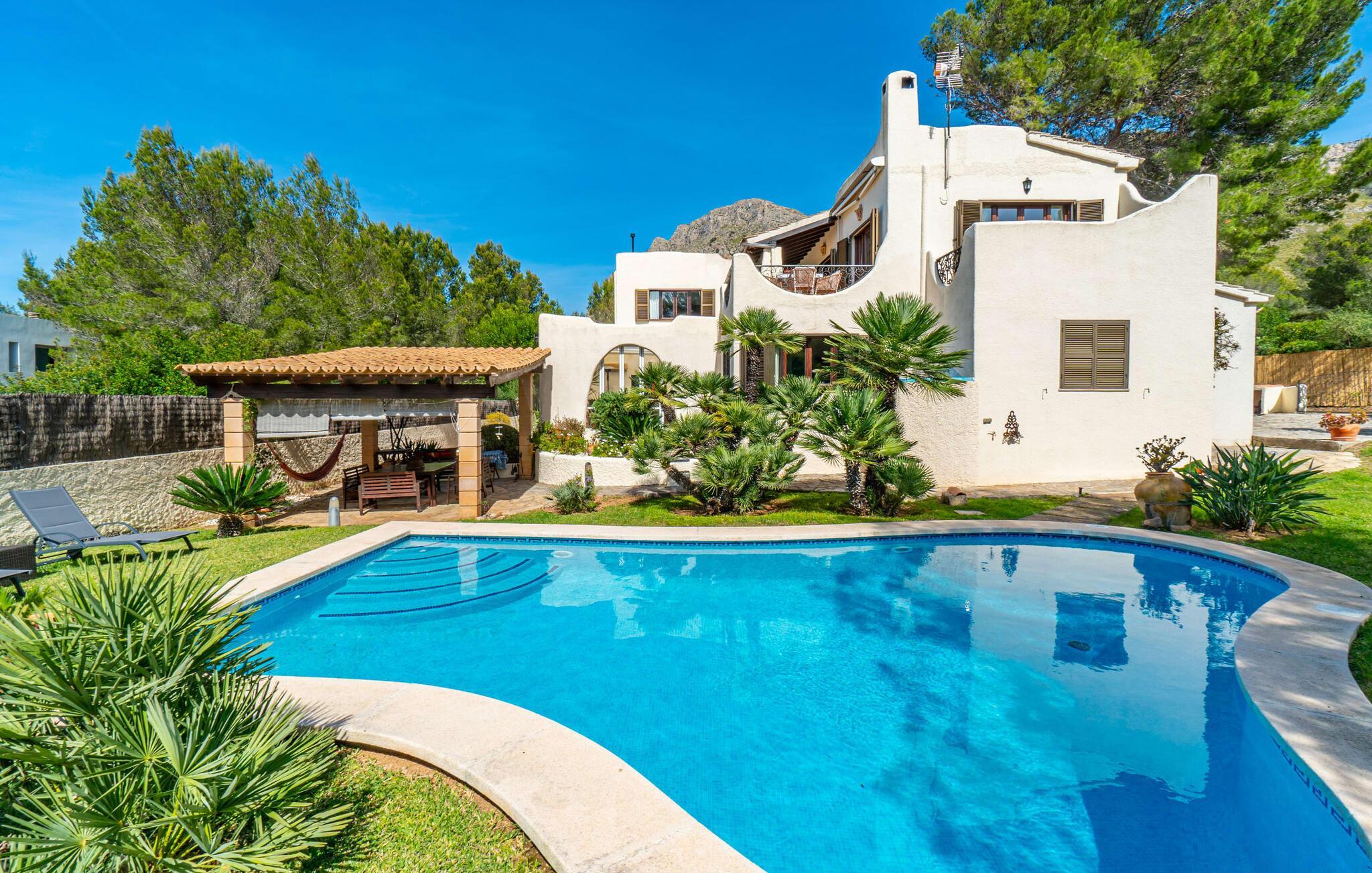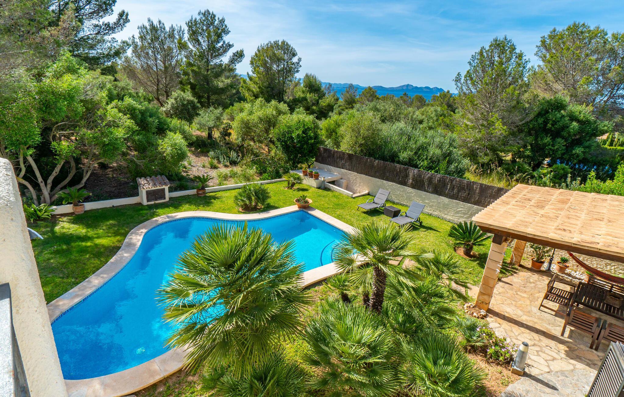 Die architektonisch außergewöhnliche Ferienvilla „Romani“ liegt inmitten eines uneinsehbaren, gepflegten Gartens. Auf der Rückseite ist es durch die Berge der Ostküste windgeschützt. Auf der anderen Seite eröffnen die Balkone im Obergeschoss einen wunderschönen Blick auf die nahe Meerseite und die südlichen Ausläufer der Bucht von Alcúdia. Vom Eingangstor des Grundstücks führen rund um das Haus verlaufende Bruchsteinwege in das schöne Gartengrundstück mit flachem Pool und schönem, gepflegtem Rasen. Angrenzend bietet ein überdachter Essbereich im Freien mit Grill einen gemütlichen Platz für ausgedehnte Mahlzeiten im Schatten. Von hier aus sind es nur wenige Schritte zu einer weiteren Terrasse mit Blumenbeeten und Zugang zur großzügigen Wohnfläche von 450 m² verteilt auf zwei Ebenen.