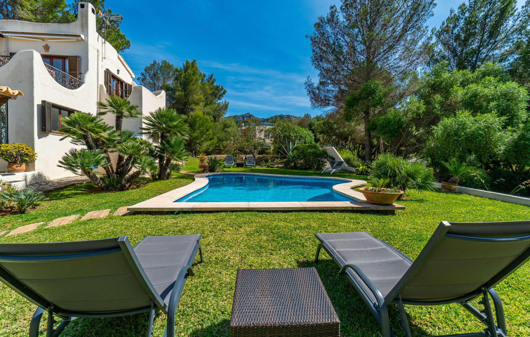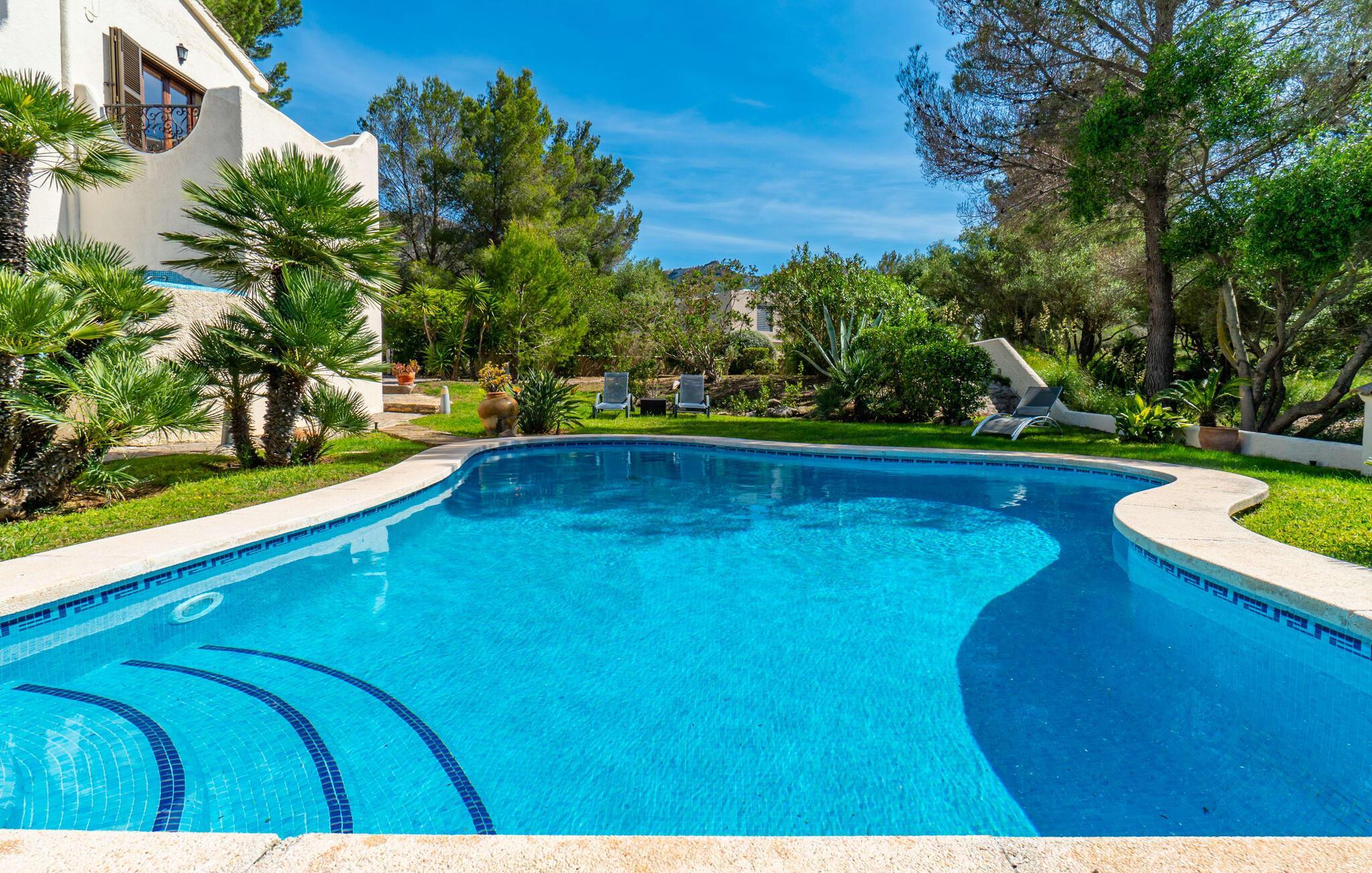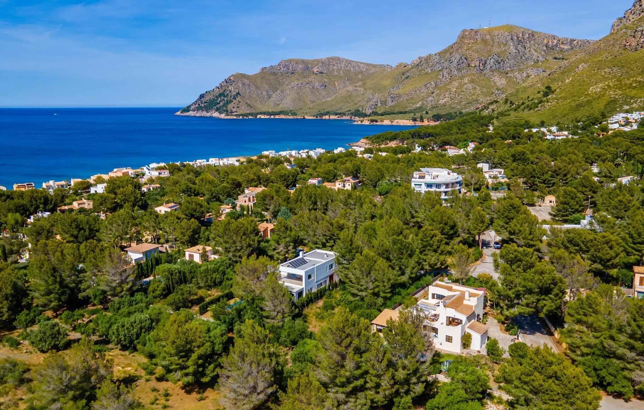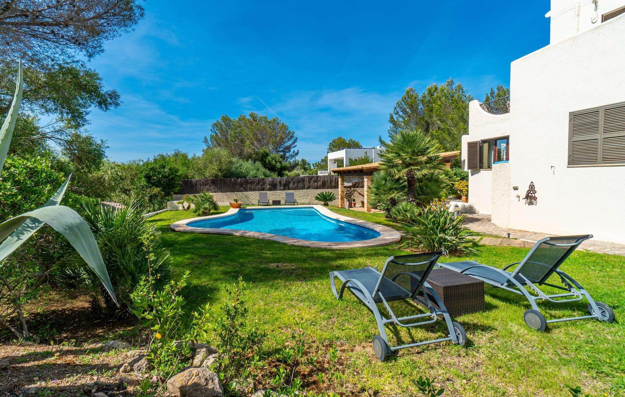Die architektonisch außergewöhnliche Ferienvilla „Romani“ liegt inmitten eines uneinsehbaren, gepflegten Gartens. Auf der Rückseite ist es durch die Berge der Ostküste windgeschützt. Auf der anderen Seite eröffnen die Balkone im Obergeschoss einen wunderschönen Blick auf die nahe Meerseite und die südlichen Ausläufer der Bucht von Alcúdia. Vom Eingangstor des Grundstücks führen rund um das Haus verlaufende Bruchsteinwege in das schöne Gartengrundstück mit flachem Pool und schönem, gepflegtem Rasen. Angrenzend bietet ein überdachter Essbereich im Freien mit Grill einen gemütlichen Platz für ausgedehnte Mahlzeiten im Schatten. Von hier aus sind es nur wenige Schritte zu einer weiteren Terrasse mit Blumenbeeten und Zugang zur großzügigen Wohnfläche von 450 m² verteilt auf zwei Ebenen.