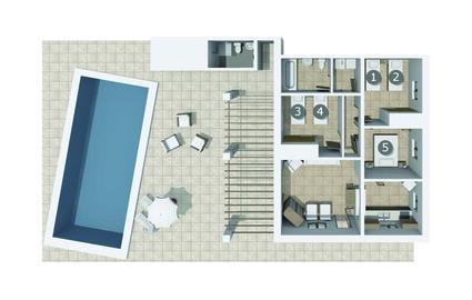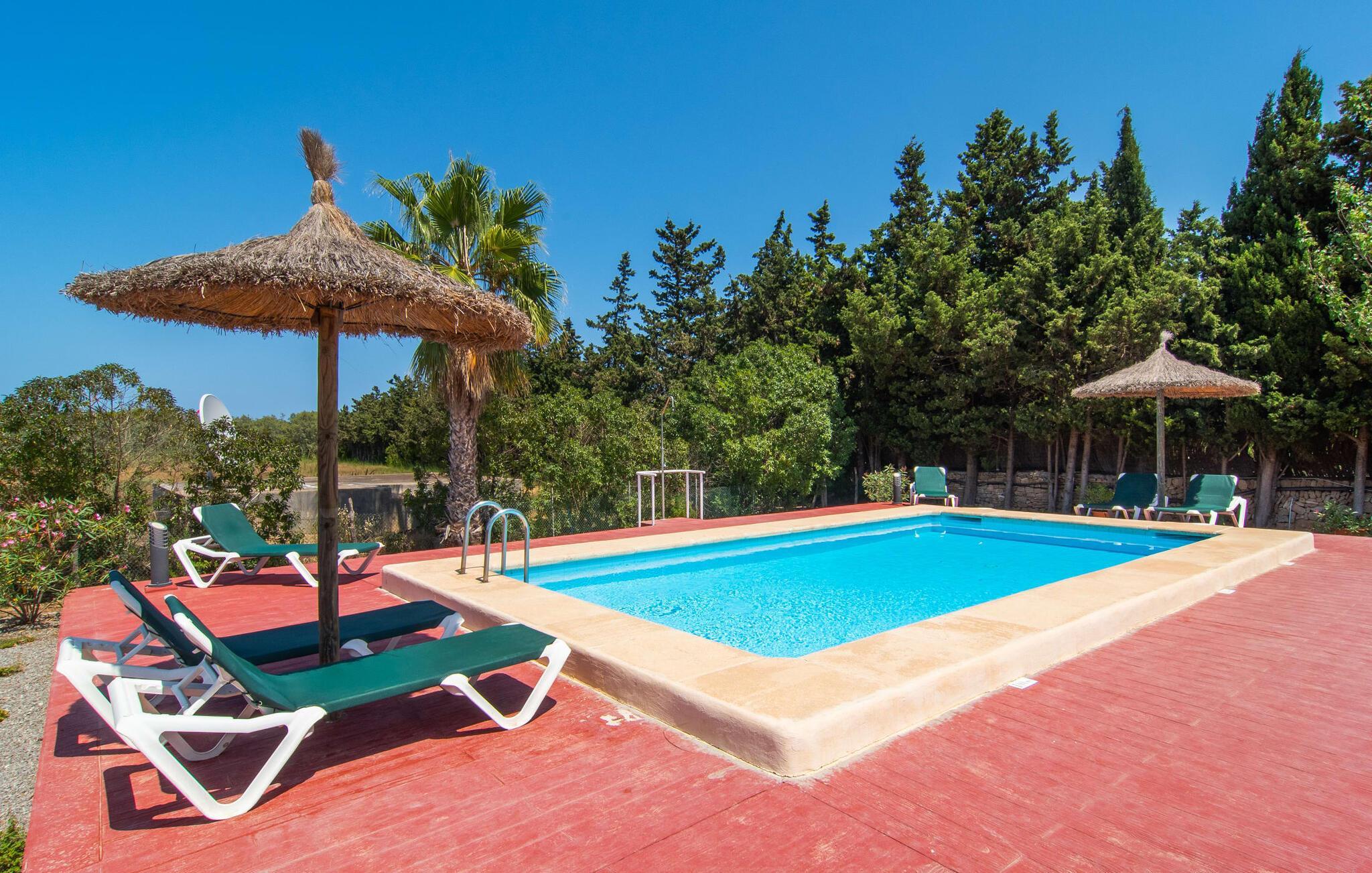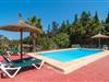 Die idyllische Villa „Rotes de Bou“ liegt in unmittelbarer Nähe einer Hauptstraße, die direkt zum örtlichen Strand führt. Das weitläufige Grundstück dieser Ferienresidenz bietet einen üppigen Bestand an Bäumen und verschiedenen anderen mediterranen Pflanzen, die die große Pool- und Terrassenlandschaft hübsch umrahmen. Im Zentrum des Außenbereichs, leicht erhöht, befindet sich der 32 m² große Pool, in dem Sie sich an heißen Tagen wunderbar erfrischen können. Es ist über eine klassische Treppe erreichbar und von einer farblich kontrastierenden Sonnenterrasse umgeben. Bequeme Sonnenliegen bieten ideale Voraussetzungen für ausgiebige Entspannung. Vielleicht möchten Sie einfach mal abschalten und eine Weile nichts tun – schließlich sind Sie ja im Urlaub. Um sich vor starker UV-Strahlung zu schützen, steht Ihnen ein Sonnenschirm zur Verfügung. Von hier aus führen ein paar Stufen auf die große, teilweise überdachte Terrasse neben dem Haus. Auf der Terrasse stehen verschiedene Sitzmöbel für den Außenbereich bereit, die den unterschiedlichsten Aktivitäten und Ansprüchen gerecht werden. Sie können zum Beispiel gemeinsam an der Sitzgarnitur zu Abend essen, in der kleinen, luxuriösen Lounge-Zone mit Polyrattan-Sesseln entspannen oder an der Holztisch-Bank-Kombination im luftigen Schatten verweilen – auch perfekt geeignet, um gemeinsam ein Abendessen zu genießen. Hier können Sie gemeinsam einen kulinarischen Grillabend zelebrieren, köstliche regionale Köstlichkeiten zubereiten und genießen und dabei den wunderschönen Blick in den Garten genießen.