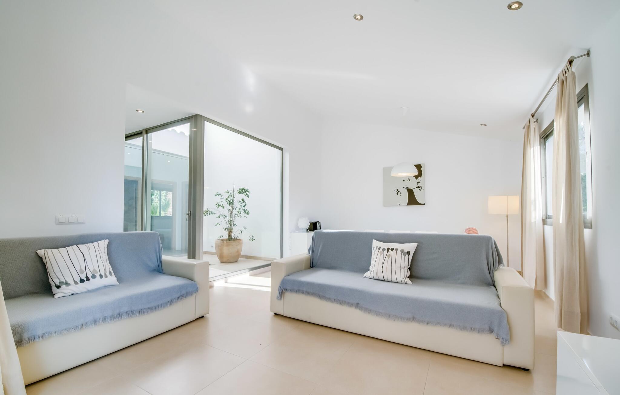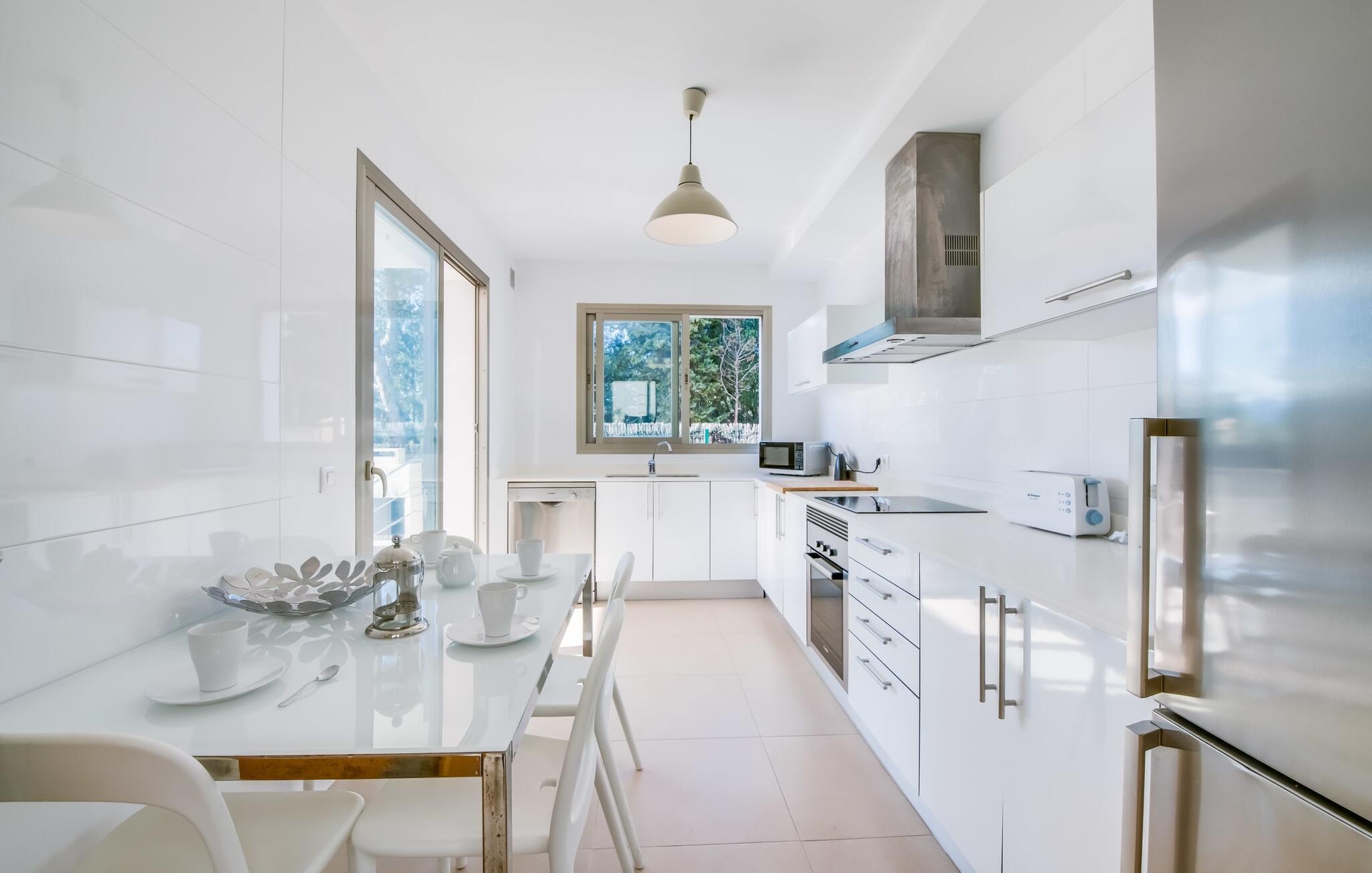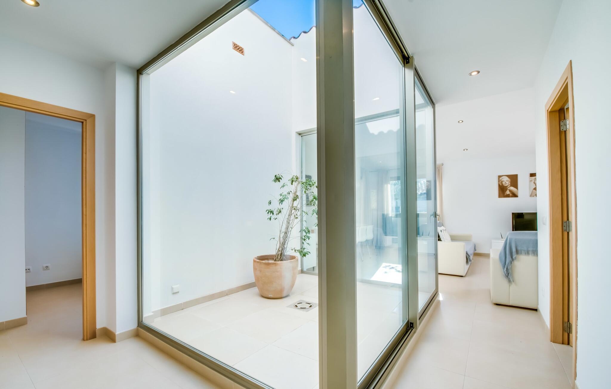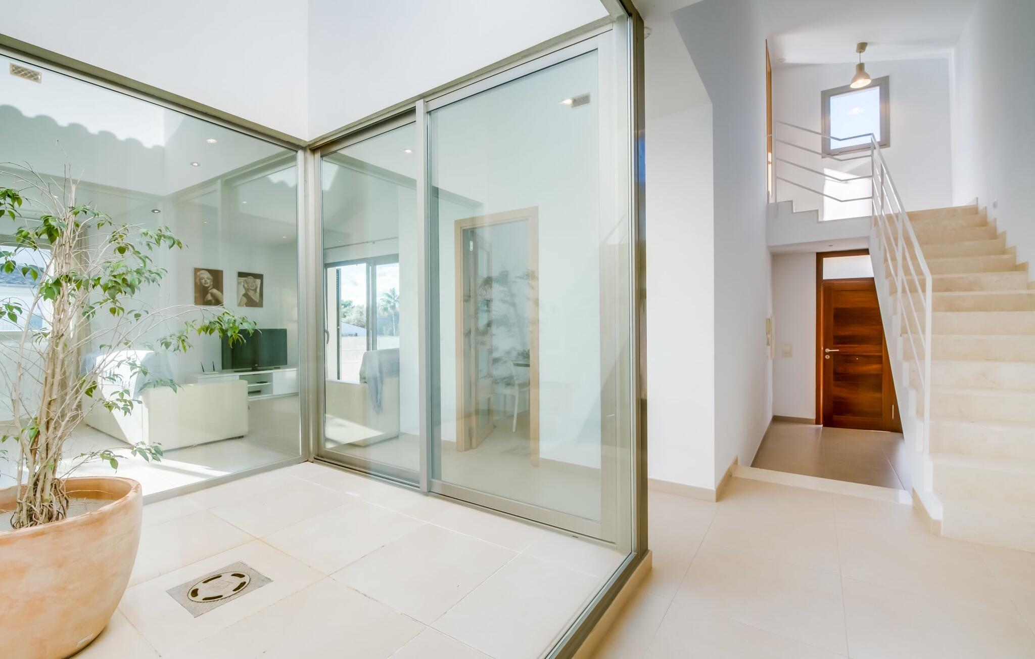 Der Innenraum ist weiterhin traumhaft lichtdurchflutet. Gerade Linien, leuchtende und harmonische Farben und Formen sind hier an der Tagesordnung. Neben dem Eingangsbereich gibt es im Erdgeschoss ein schönes Wohn-Esszimmer sowie eine Küche, die selbstverständlich komplett ausgestattet ist und im angesagten Weiß-Stil erstrahlt. Es gibt sogar Platz für einen weiteren Esstisch. Drei ästhetisch gestaltete Doppelschlafzimmer – eines davon mit Bad en Suite – sowie ein zweites Badezimmer befinden sich ebenfalls auf dieser Wohnebene, die durch den Glaskubus eine ganz besondere Wirkung entfaltet. Das vierte Schlafzimmer, ebenfalls mit eigenem Bad, befindet sich im Obergeschoss. Von hier aus haben Sie Zugang zur bereits erwähnten Terrasse, wo Sie auch morgens den ersten Kaffee zelebrieren können. Diese charmante Villa mit privatem Pool liegt im eher ruhigen Cielo de Bonaire. Nur 10 Gehminuten trennen Sie vom Meer. Die Gegend ist wenig touristisch und daher der ideale Rückzugsort für alle Mallorca-Urlauber, die die Ruhe der Insel suchen. Attraktive Sehenswürdigkeiten von Alcúdia und Pollensa sind 5-10 Autominuten entfernt und können bequem über die Straße erreicht werden. Im Umkreis von 2 bis 4 km gibt es mehrere attraktive Strände.