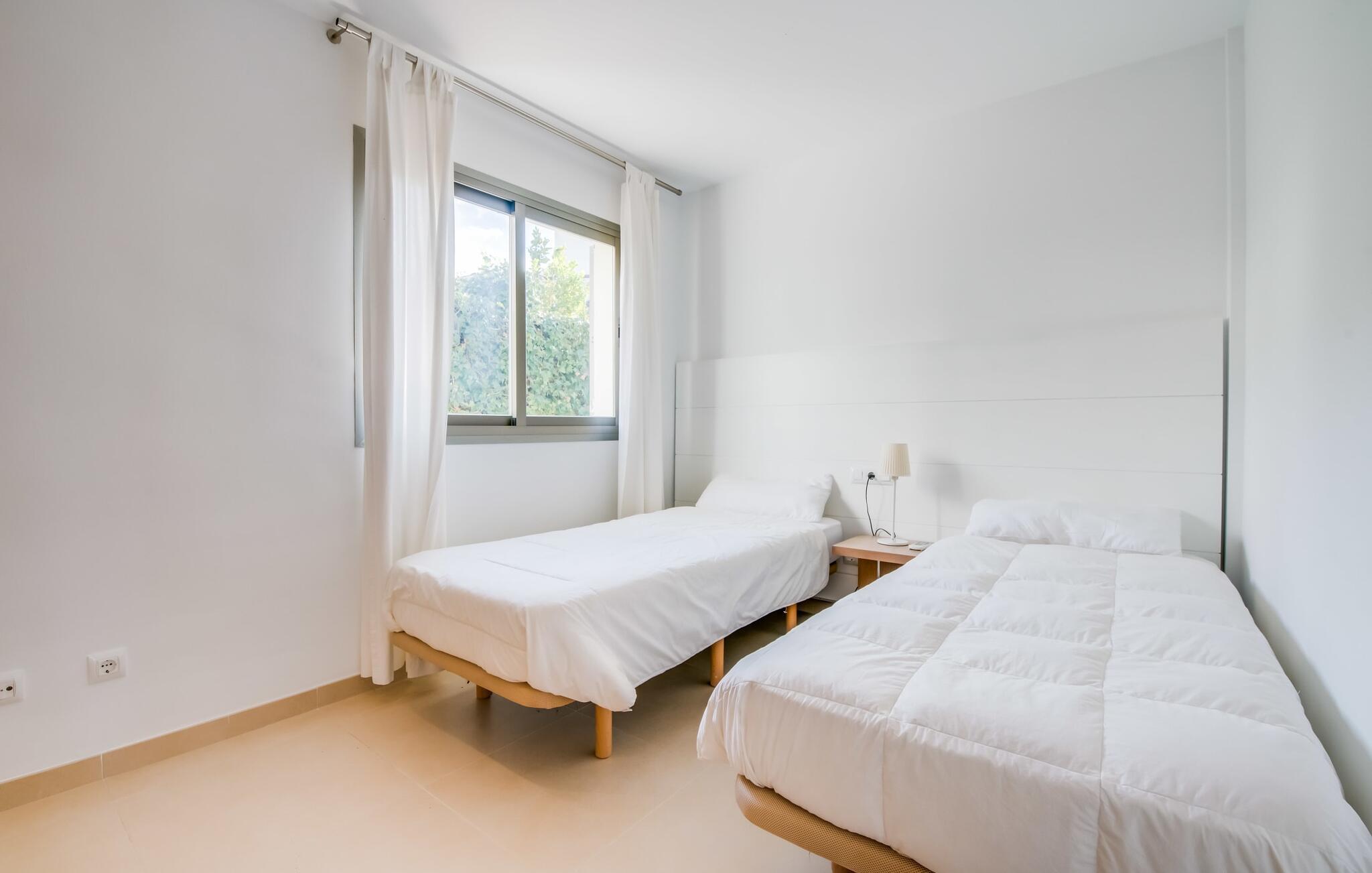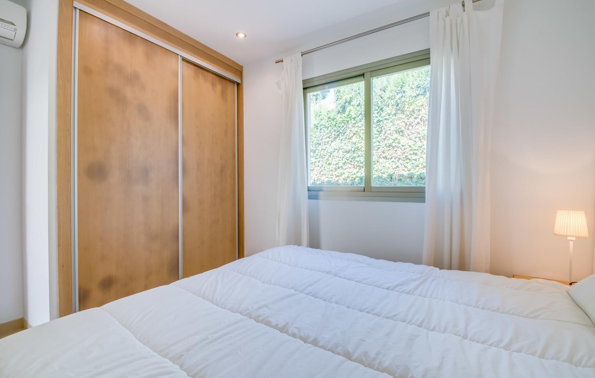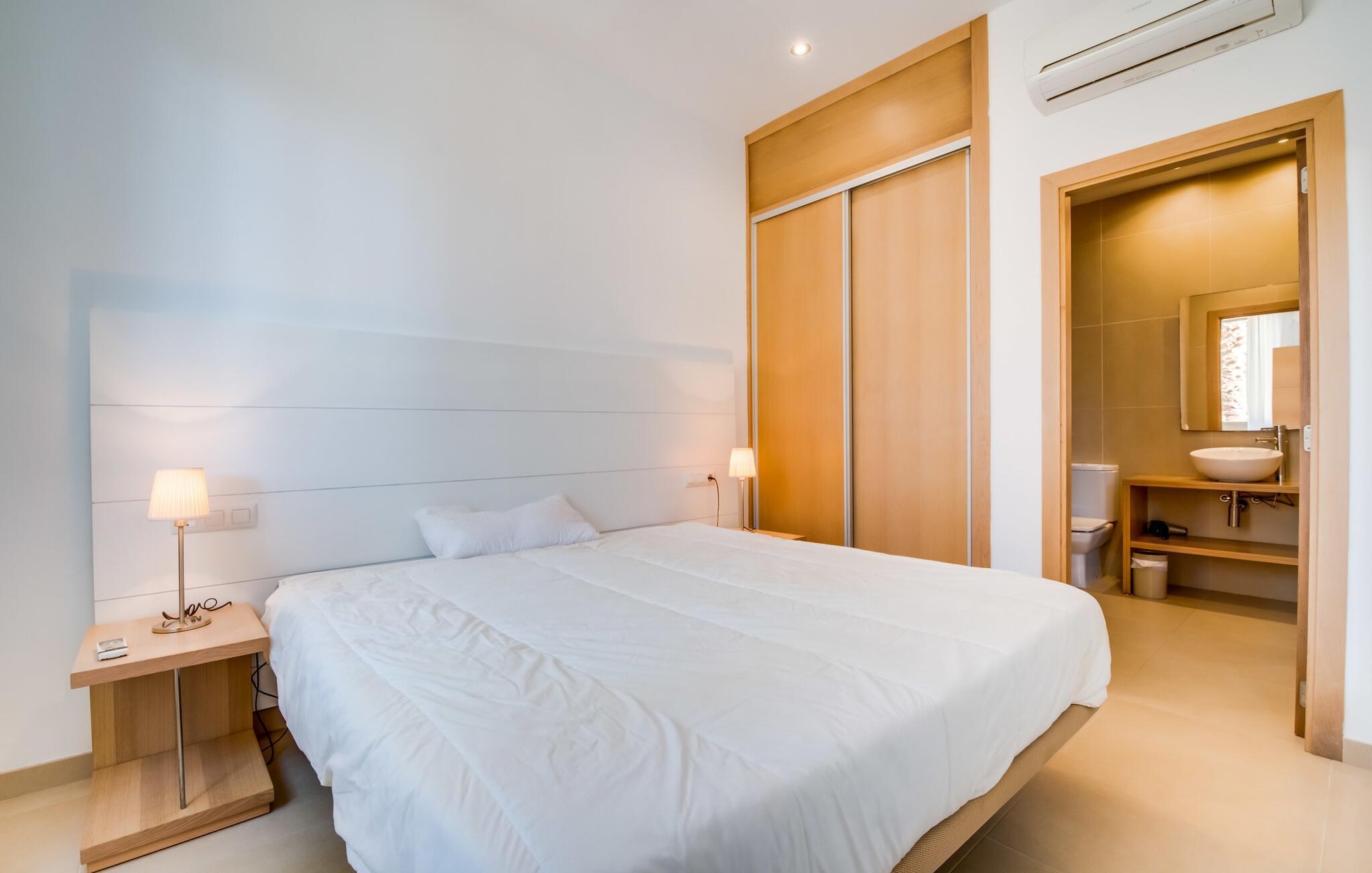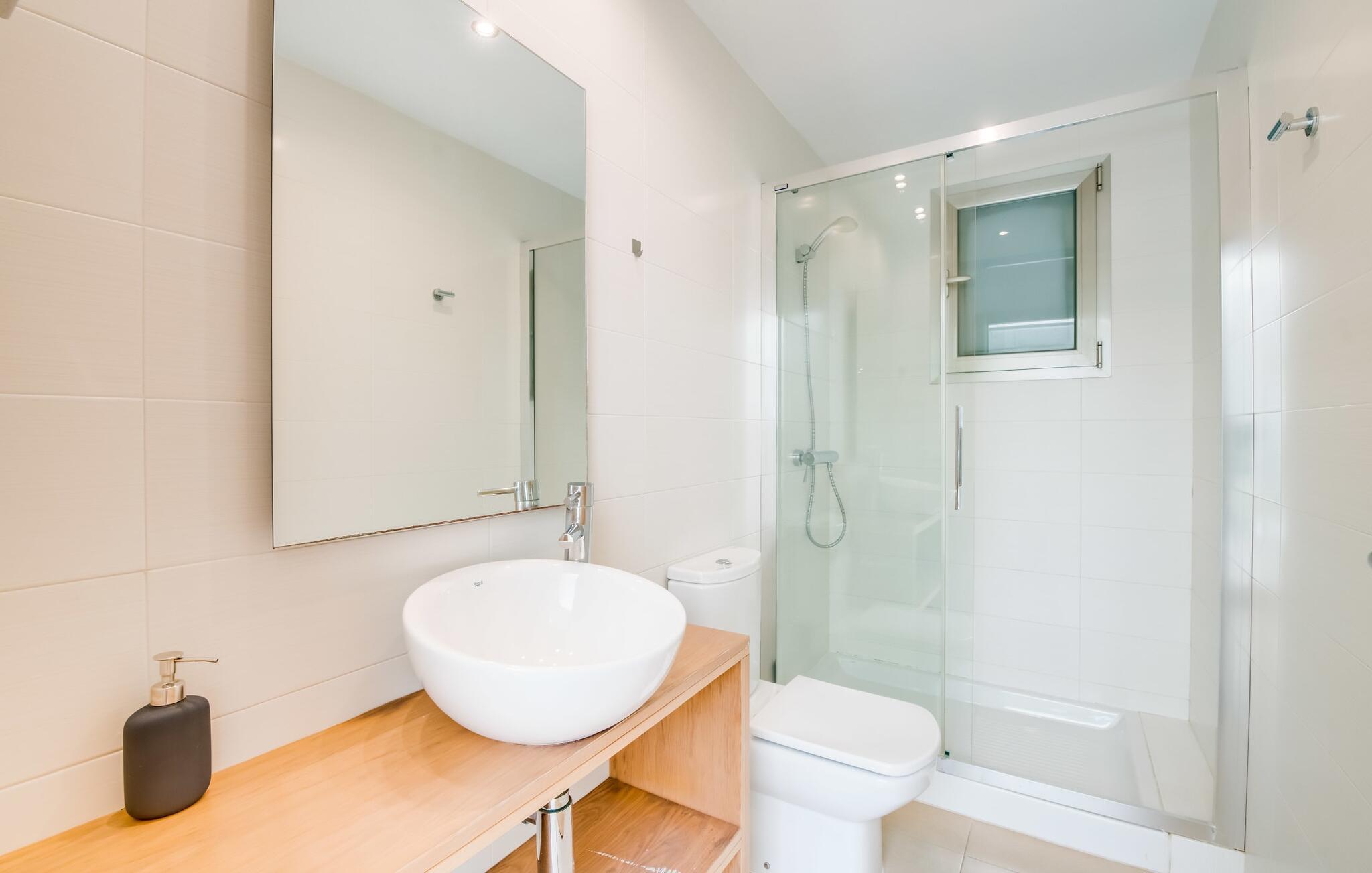 Der Innenraum ist weiterhin traumhaft lichtdurchflutet. Gerade Linien, leuchtende und harmonische Farben und Formen sind hier an der Tagesordnung. Neben dem Eingangsbereich gibt es im Erdgeschoss ein schönes Wohn-Esszimmer sowie eine Küche, die selbstverständlich komplett ausgestattet ist und im angesagten Weiß-Stil erstrahlt. Es gibt sogar Platz für einen weiteren Esstisch. Drei ästhetisch gestaltete Doppelschlafzimmer – eines davon mit Bad en Suite – sowie ein zweites Badezimmer befinden sich ebenfalls auf dieser Wohnebene, die durch den Glaskubus eine ganz besondere Wirkung entfaltet. Das vierte Schlafzimmer, ebenfalls mit eigenem Bad, befindet sich im Obergeschoss. Von hier aus haben Sie Zugang zur bereits erwähnten Terrasse, wo Sie auch morgens den ersten Kaffee zelebrieren können. Diese charmante Villa mit privatem Pool liegt im eher ruhigen Cielo de Bonaire. Nur 10 Gehminuten trennen Sie vom Meer. Die Gegend ist wenig touristisch und daher der ideale Rückzugsort für alle Mallorca-Urlauber, die die Ruhe der Insel suchen. Attraktive Sehenswürdigkeiten von Alcúdia und Pollensa sind 5-10 Autominuten entfernt und können bequem über die Straße erreicht werden. Im Umkreis von 2 bis 4 km gibt es mehrere attraktive Strände.