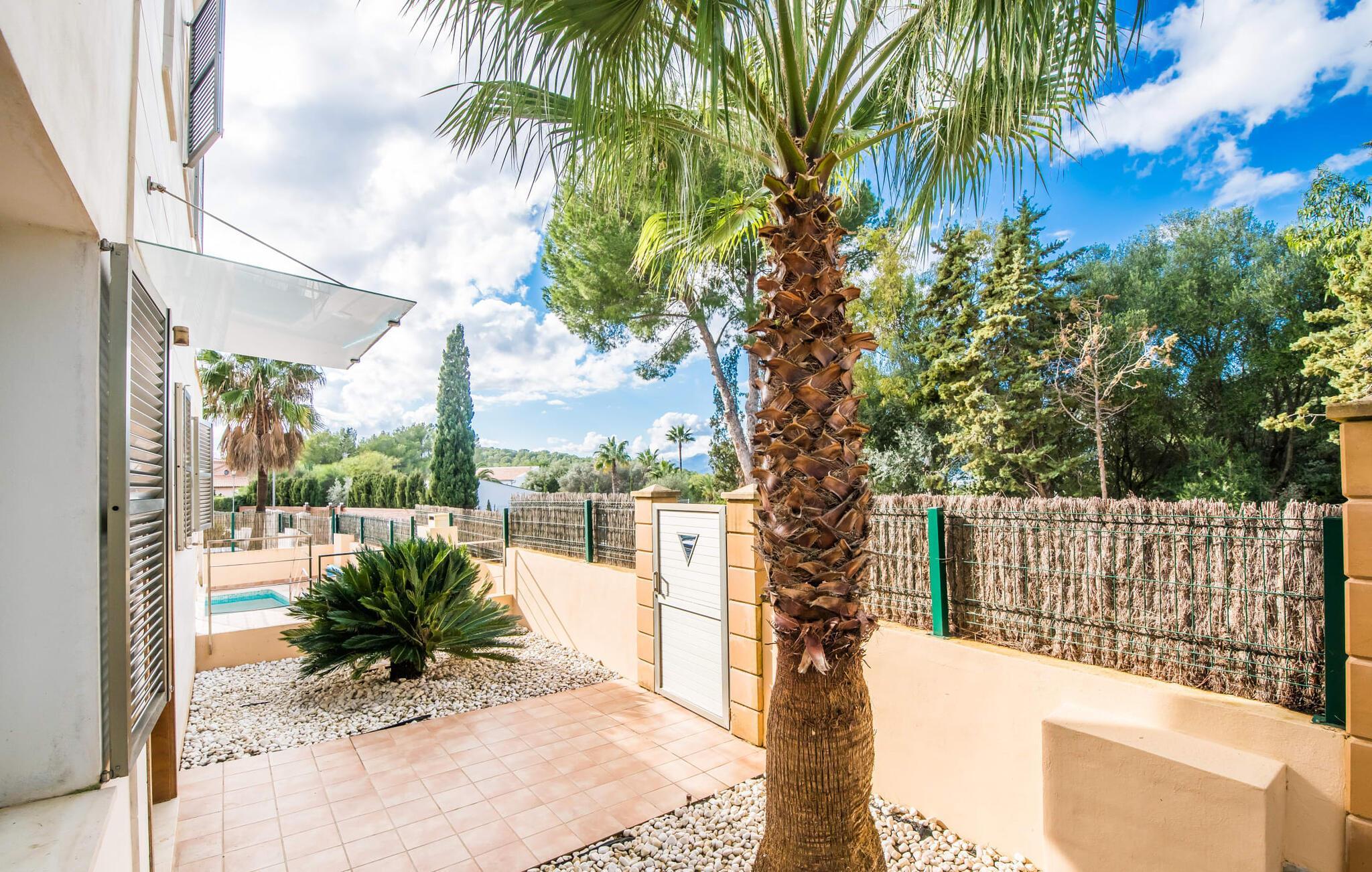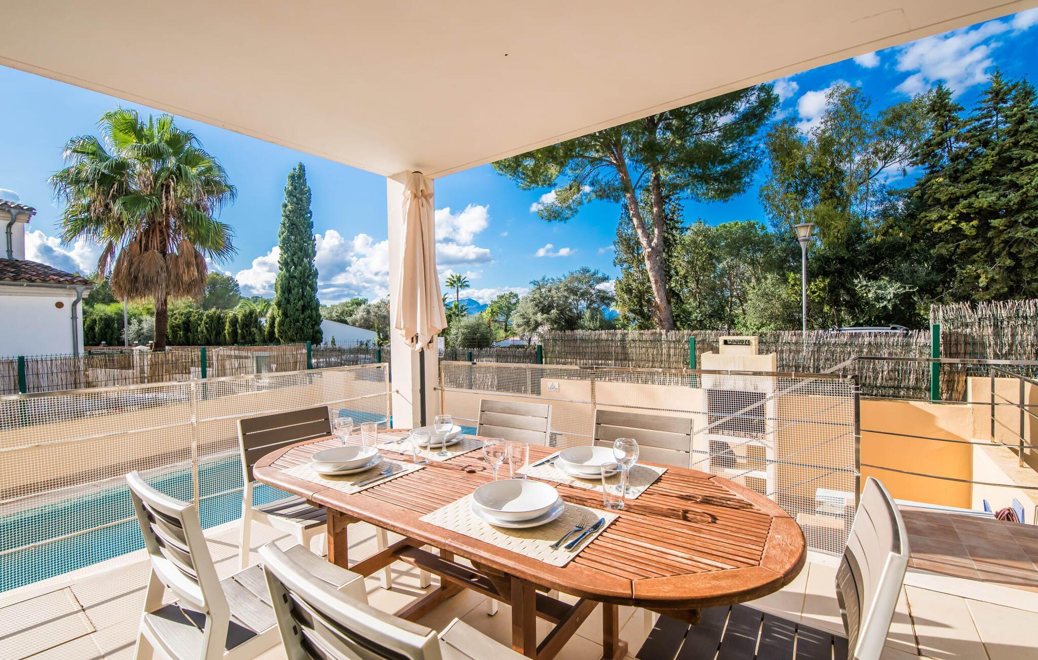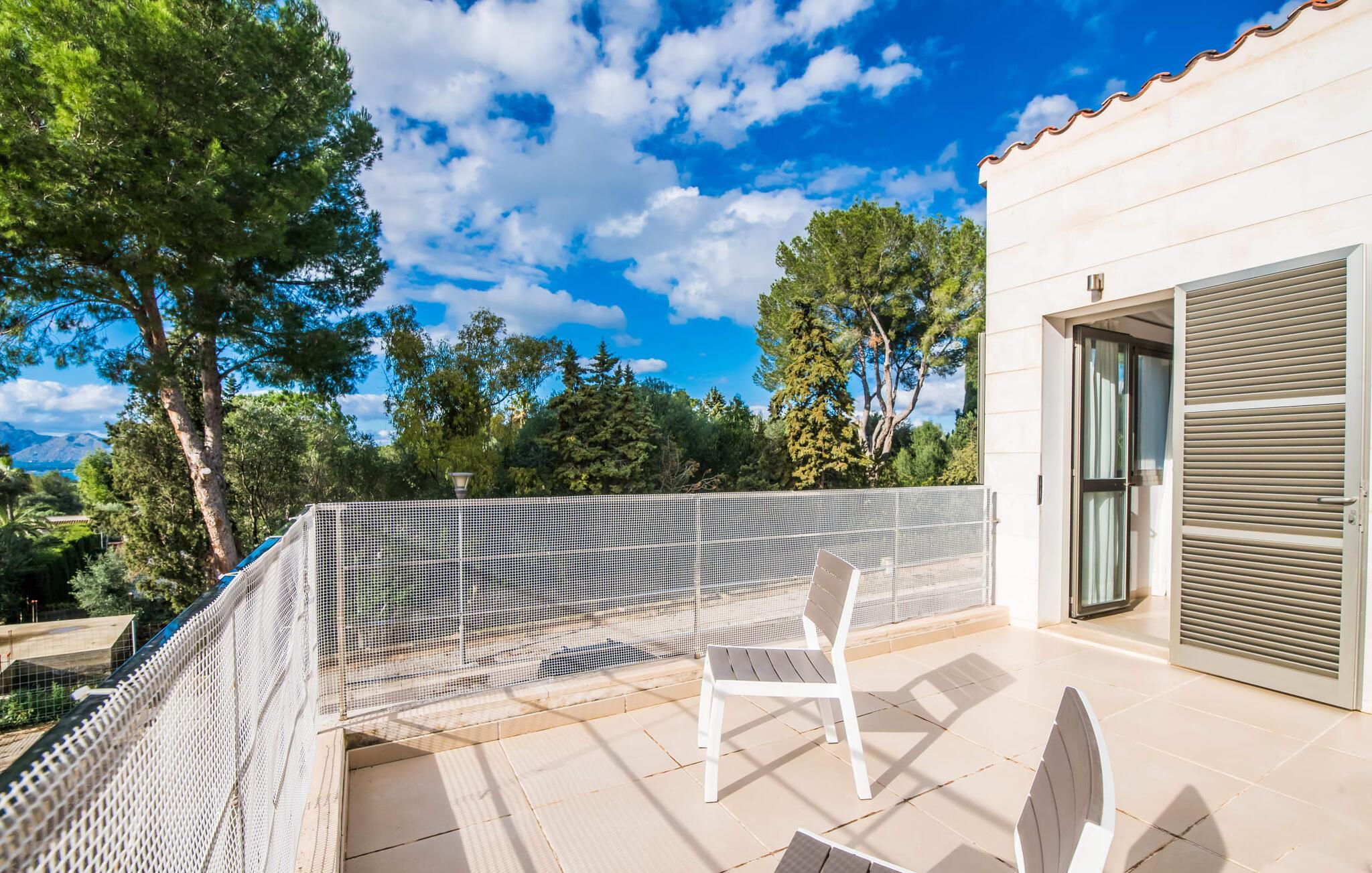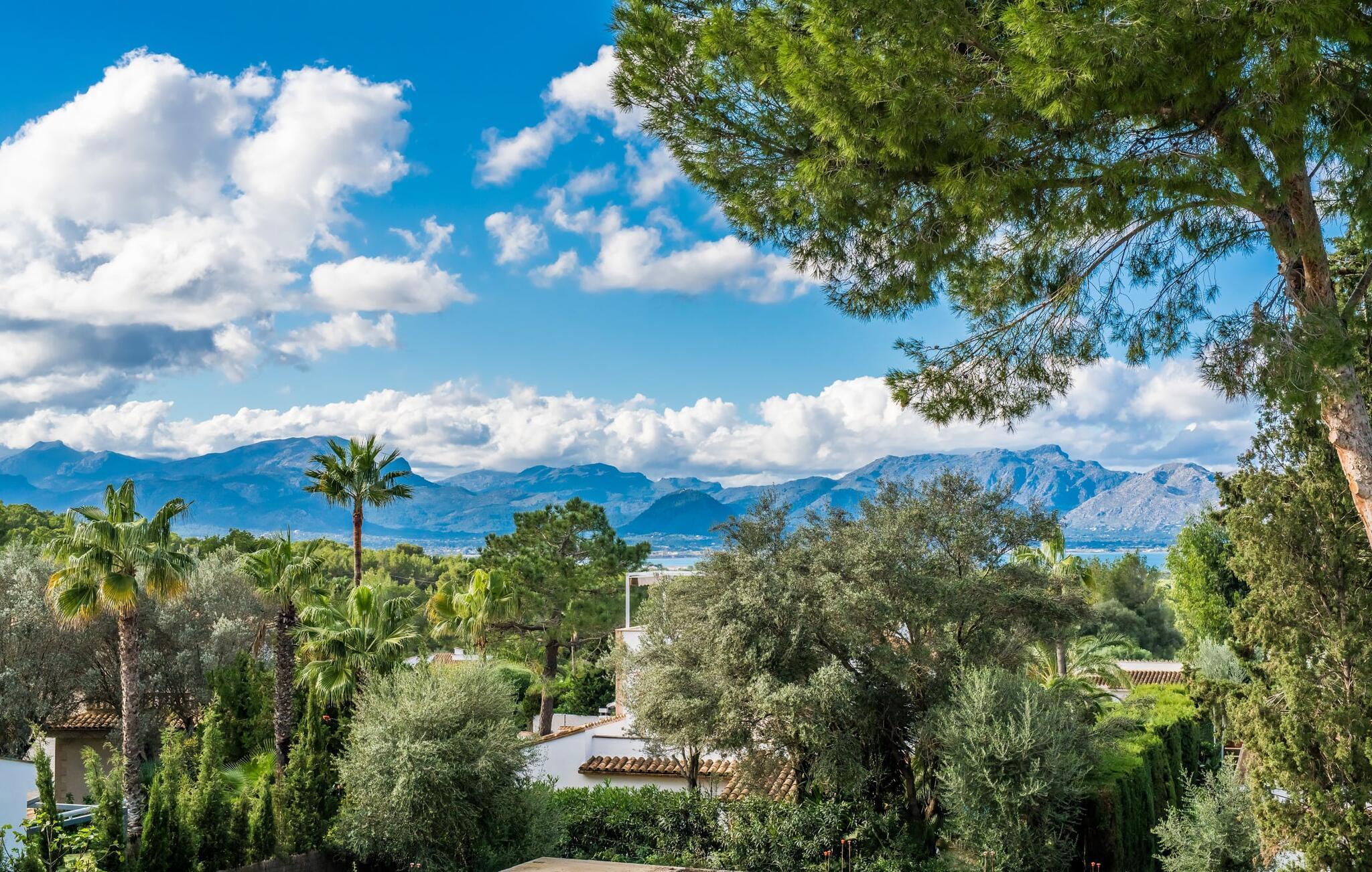 Die strahlend weiße Villa „Roure de Alcudia“ vereint unter ihrem Dach alles, was Sie für einen Traumurlaub auf Mallorca brauchen. Allein im Außenbereich kann dieses Ferienhaus für acht Gäste deutlich punkten: Ein privater Pool – innerhalb einer Siedlung keine Selbstverständlichkeit – gehört ebenso zum paradiesischen Ambiente wie eine einladende Sonnenterrasse mit bequemen Liegen. Der knorrige alte Olivenbaum ein paar Stufen höher sorgt für eine klassisch mediterrane Atmosphäre. Auch der Esstisch steht erhöht, direkt am Haus, von wo aus man einen hervorragenden Blick auf den Pool hat und gleichzeitig einen angenehm kurzen Weg ins Haus hat. Abends haben Sie bestimmt Lust, den gemauerten Grill anzufeuern und über der Glut kulinarische Köstlichkeiten zuzubereiten. Eine Terrasse im Obergeschoss rundet das Angebot an Outdoor-Plätzen ab und bietet einen wunderbaren Ausblick bis hin zum Meer.