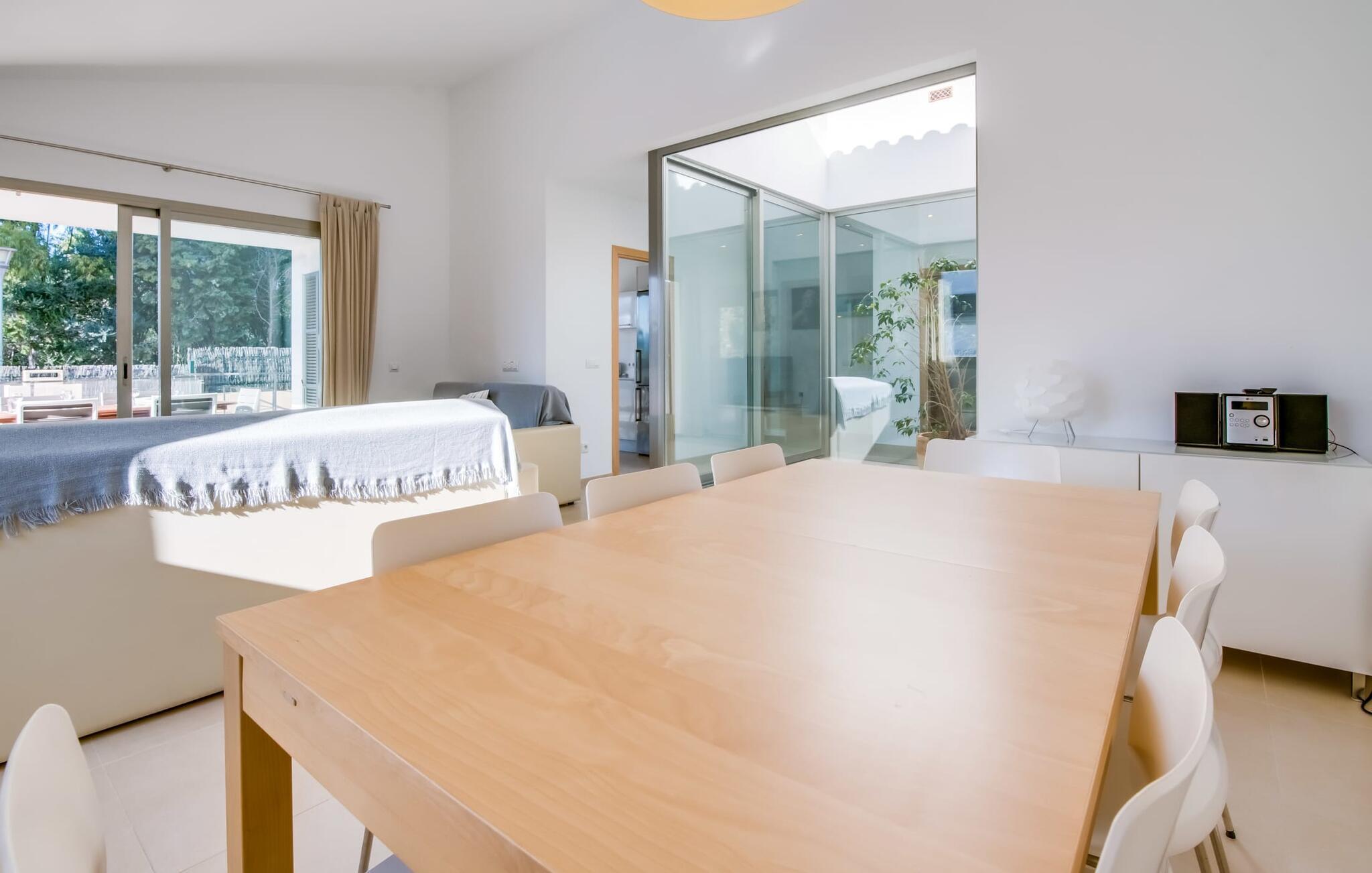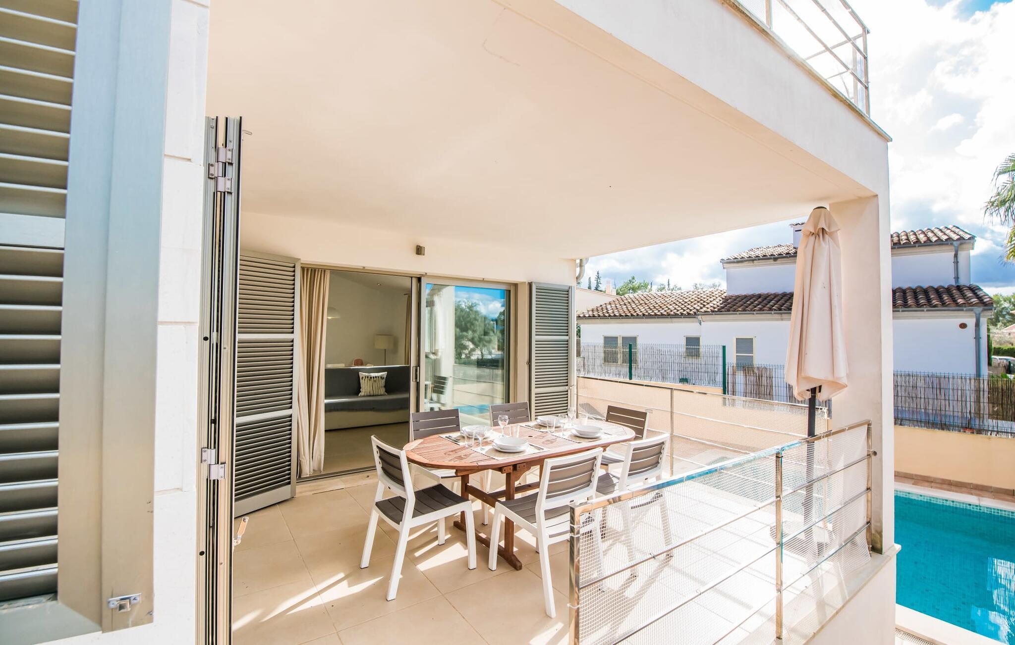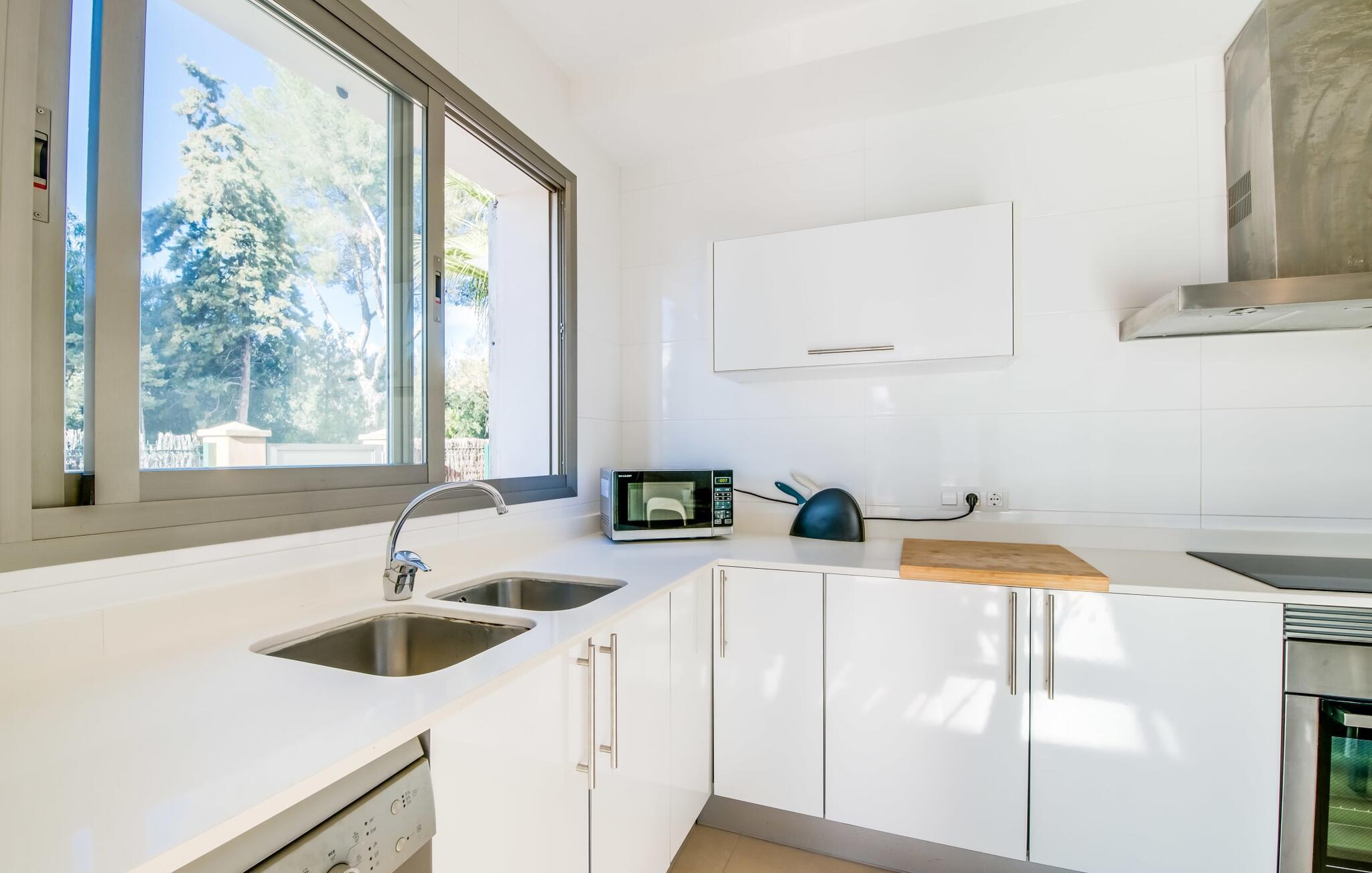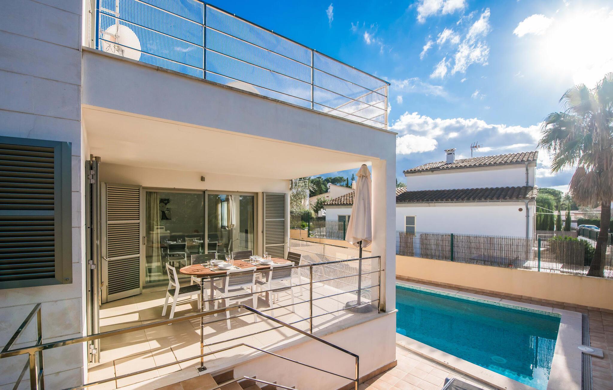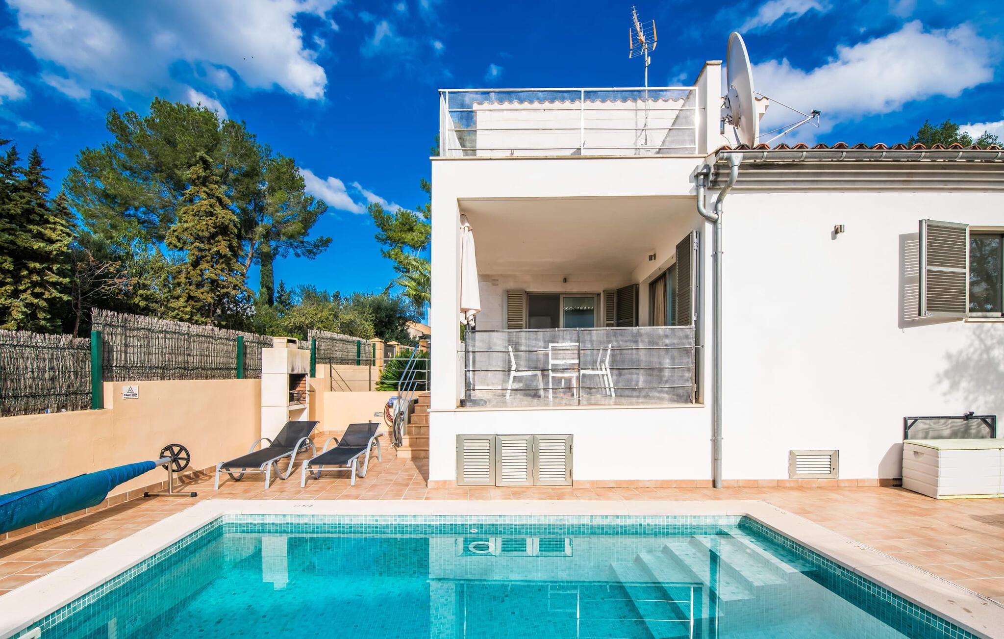 Die strahlend weiße Villa „Roure de Alcudia“ vereint unter ihrem Dach alles, was Sie für einen Traumurlaub auf Mallorca brauchen. Allein im Außenbereich kann dieses Ferienhaus für acht Gäste deutlich punkten: Ein privater Pool – innerhalb einer Siedlung keine Selbstverständlichkeit – gehört ebenso zum paradiesischen Ambiente wie eine einladende Sonnenterrasse mit bequemen Liegen. Der knorrige alte Olivenbaum ein paar Stufen höher sorgt für eine klassisch mediterrane Atmosphäre. Auch der Esstisch steht erhöht, direkt am Haus, von wo aus man einen hervorragenden Blick auf den Pool hat und gleichzeitig einen angenehm kurzen Weg ins Haus hat. Abends haben Sie bestimmt Lust, den gemauerten Grill anzufeuern und über der Glut kulinarische Köstlichkeiten zuzubereiten. Eine Terrasse im Obergeschoss rundet das Angebot an Outdoor-Plätzen ab und bietet einen wunderbaren Ausblick bis hin zum Meer.