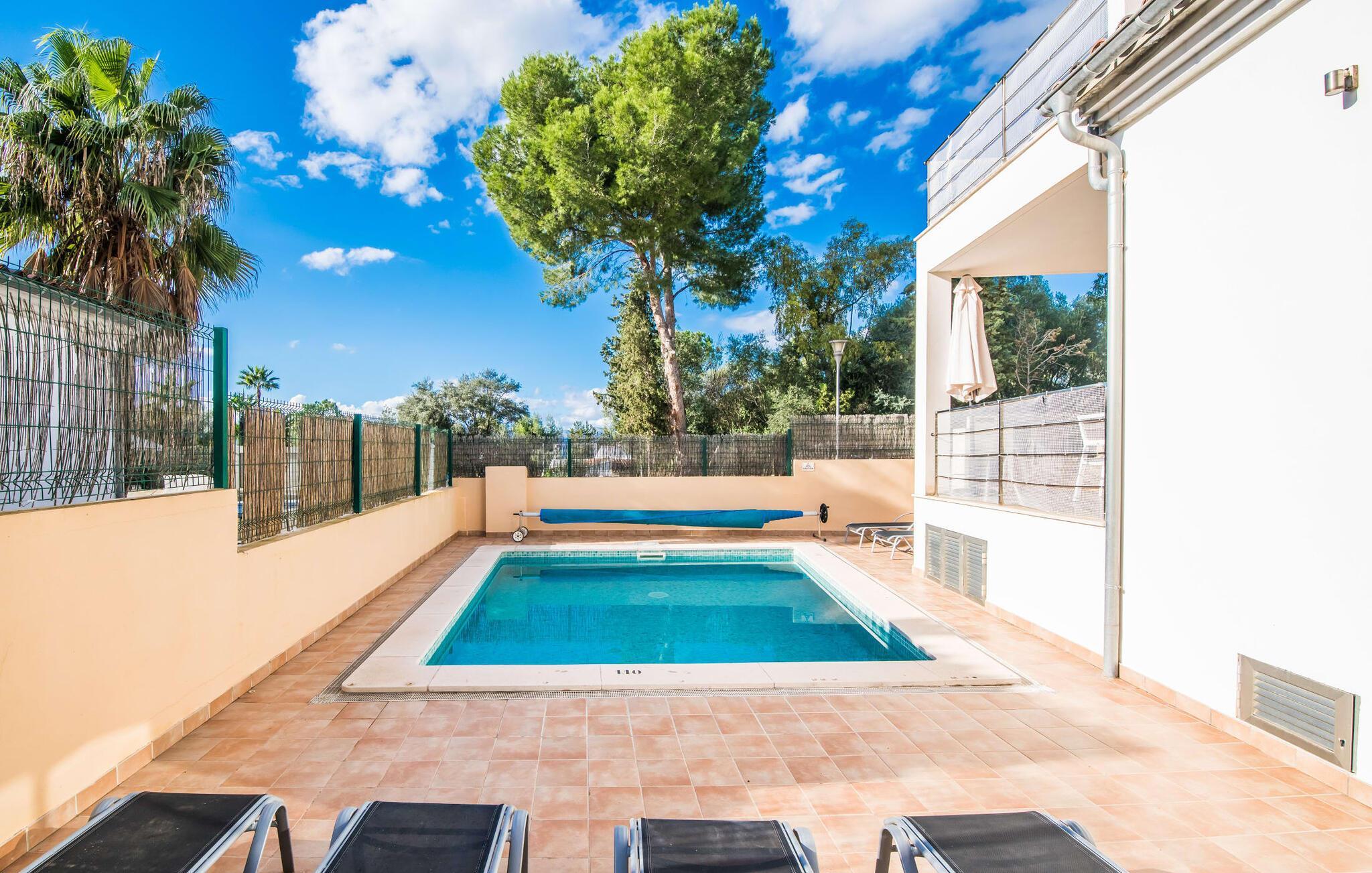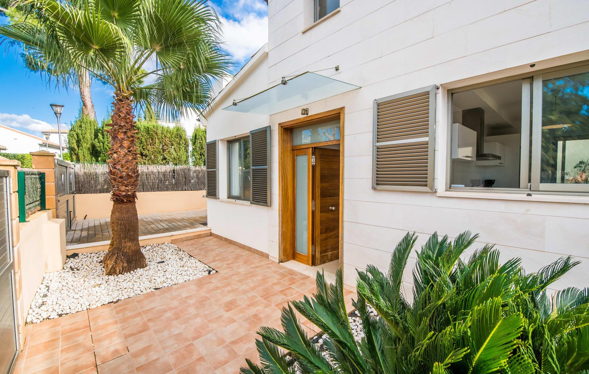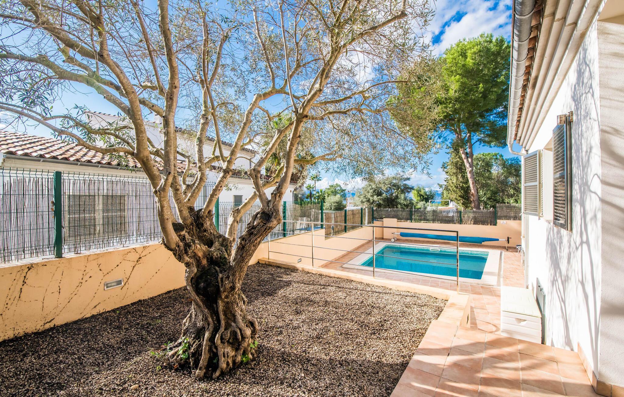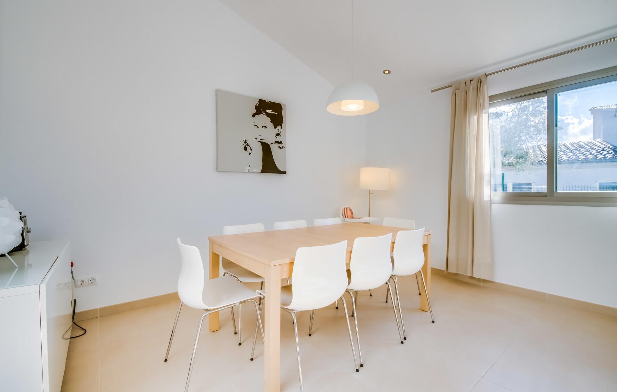 Die strahlend weiße Villa „Roure de Alcudia“ vereint unter ihrem Dach alles, was Sie für einen Traumurlaub auf Mallorca brauchen. Allein im Außenbereich kann dieses Ferienhaus für acht Gäste deutlich punkten: Ein privater Pool – innerhalb einer Siedlung keine Selbstverständlichkeit – gehört ebenso zum paradiesischen Ambiente wie eine einladende Sonnenterrasse mit bequemen Liegen. Der knorrige alte Olivenbaum ein paar Stufen höher sorgt für eine klassisch mediterrane Atmosphäre. Auch der Esstisch steht erhöht, direkt am Haus, von wo aus man einen hervorragenden Blick auf den Pool hat und gleichzeitig einen angenehm kurzen Weg ins Haus hat. Abends haben Sie bestimmt Lust, den gemauerten Grill anzufeuern und über der Glut kulinarische Köstlichkeiten zuzubereiten. Eine Terrasse im Obergeschoss rundet das Angebot an Outdoor-Plätzen ab und bietet einen wunderbaren Ausblick bis hin zum Meer.