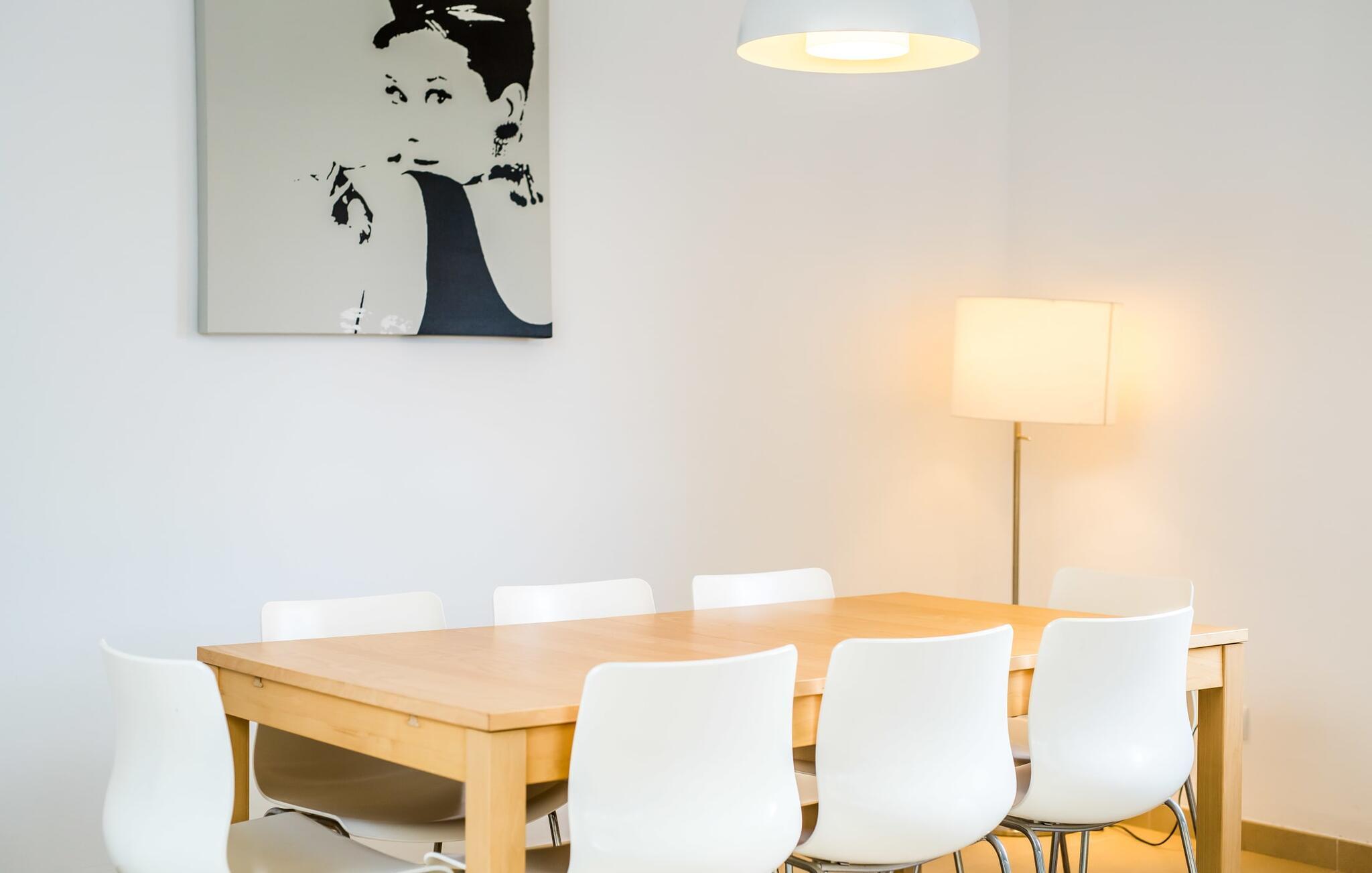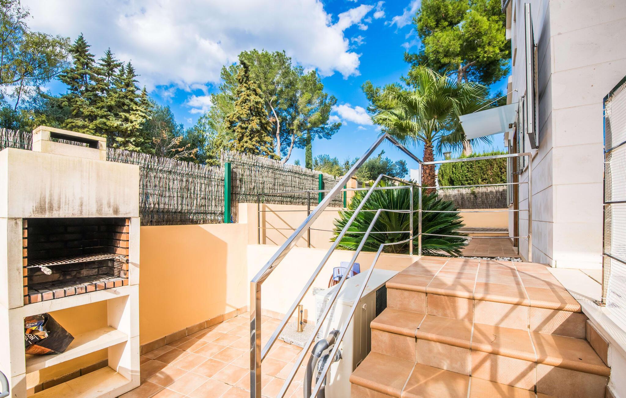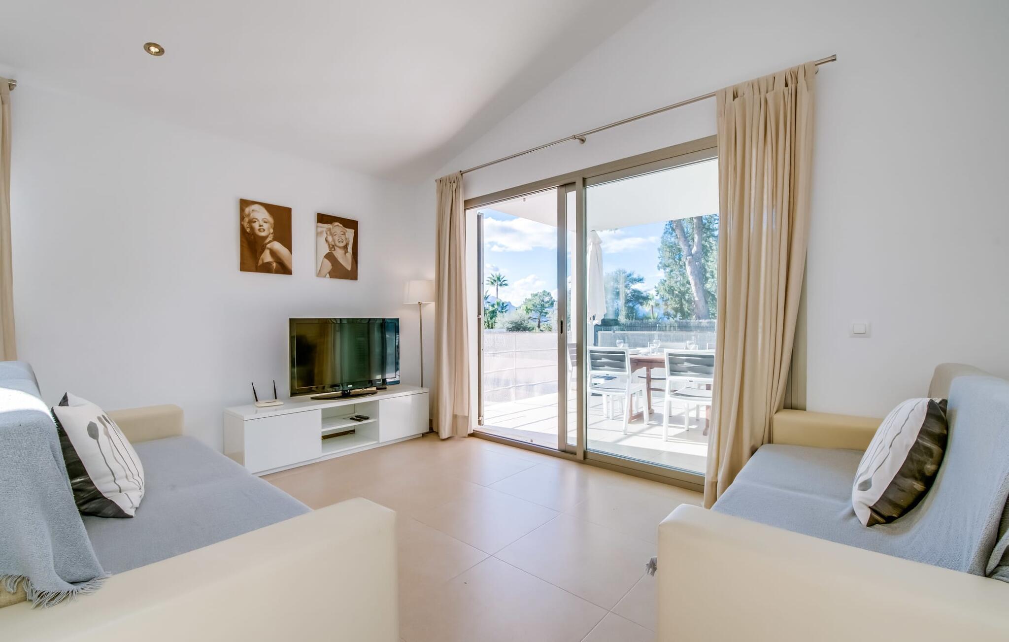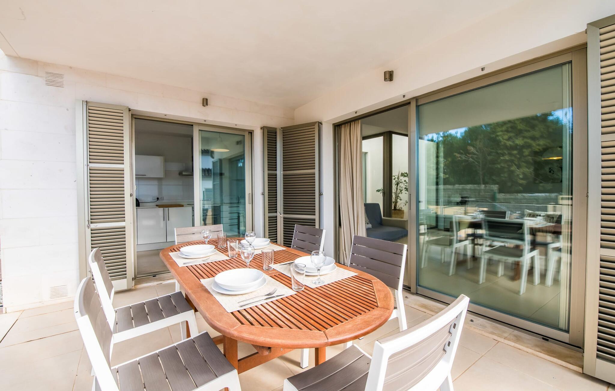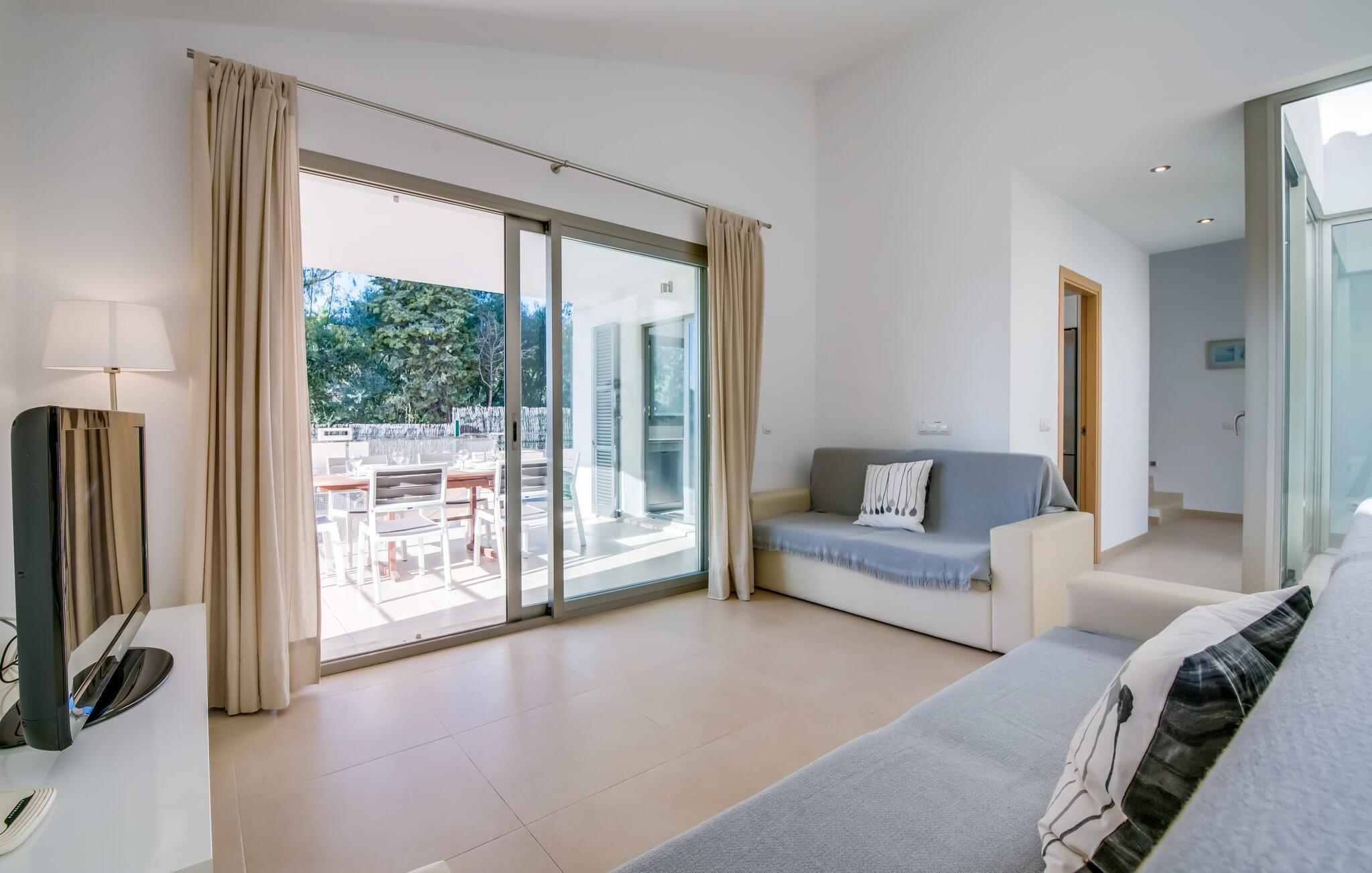 Die strahlend weiße Villa „Roure de Alcudia“ vereint unter ihrem Dach alles, was Sie für einen Traumurlaub auf Mallorca brauchen. Allein im Außenbereich kann dieses Ferienhaus für acht Gäste deutlich punkten: Ein privater Pool – innerhalb einer Siedlung keine Selbstverständlichkeit – gehört ebenso zum paradiesischen Ambiente wie eine einladende Sonnenterrasse mit bequemen Liegen. Der knorrige alte Olivenbaum ein paar Stufen höher sorgt für eine klassisch mediterrane Atmosphäre. Auch der Esstisch steht erhöht, direkt am Haus, von wo aus man einen hervorragenden Blick auf den Pool hat und gleichzeitig einen angenehm kurzen Weg ins Haus hat. Abends haben Sie bestimmt Lust, den gemauerten Grill anzufeuern und über der Glut kulinarische Köstlichkeiten zuzubereiten. Eine Terrasse im Obergeschoss rundet das Angebot an Outdoor-Plätzen ab und bietet einen wunderbaren Ausblick bis hin zum Meer.