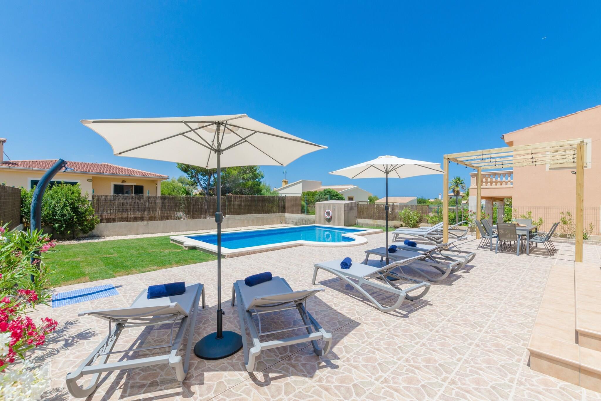 Die beeindruckende Finca hat einen traumhaften Außenbereich, in dem, ohne Zweifel, der 10 x 5m große Süßwasserpool mit einer Wassertiefe von 1,6 bis 1,8m der Protagonist ist. Er wird mit Chlor gereinigt und ist umgeben von einer Poolterrasse, mit bis zu 8 Sonnenliegen und Rasen, zum Spielen für die Kinder. Unter dem Holzpavillon können Sie den Tisch für die Mahlzeiten im Freien decken und auch einem Grillabend steht nichts im Wege. Gemütliche Gartensofas laden zum Relaxen oder Lesen ein. Das Haus hat 3 Etagen. Der moderne Wohnbereich teilt sich den Platz im Erdgeschoss mit dem Essbereich und der Küche. Praktisch, um viel gemeinsame Zeit zu verbringen und Ihre Lieblingsgerichte auf dem Ceranfeld der Küche zu kochen. Alle wichtigen Geräte und Utensilien stehen dafür zur Verfügung. Dieser Raum und die 4 Schlafzimmer sind klimatisiert. Im Erdgeschoss finden Sie eins der Schlafzimmer mit Doppelbett und en-Suite -Bad mit Wanne . In der ersten Etage befinden sich 2 Schlafzimmer, eins mit Doppelbett, das andere mit 2 Einzelbetten. Beide haben je ein Duschbad en-Suite. Das 4te Schlafzimmer liegt in der 2ten Etage und ist mit 2 Einzelbetten und einem en-Suite Bad mit Wanne versehen. Es gibt ein Gäste WC für alle Bewohner im Erdgeschoss. Die Waschküche ist mit Waschmaschine, Trockner, Bügelbrett und Bügeleisen gut ausgestattet und auch ein Babybett und Hochstuhl werden auf Anfrage gerne bereitgestellt. Die Lage des Hauses, nur 800m vom Strand von S'Estanyol und den Ort, mit all seinen Dienstleistungen, direkt beim Haus, ist ideal für einen perfekten Urlaub. Der beschauliche Ort gehört zur Gemeinde vom Colonia de Sant Pere und hat seinen Charme und Traditionen als kleines Fischerdorf bewahrt. Eventuelle Nebenkosten müssen beim Anbieter nachgefragt werden. Haustiere sind verboten. Partys oder ähnliche Veranstaltungen sind nicht gestattet. Es gibt Freiluftparkplätze für 3 Autos. Entfernungen Strand: 0.80 km - S'Estanyol Flughafen: 63.8 km - Son Sant Joan Golfplatz: 17.7 km - Capdepera Golf Ortsmitte: 0 km - Colònia de Sant Pere Bahnhof: 25 km - Manacor Bushaltestelle: 0.45 km - Colònia de Sant Pere Fähre: 32.8 km - Port d'Alcudia Krankenhaus: 23.5 km - Hospital de Manacor Touristen Lizenz: ETV/7975Einheitsregister: ESFCTU00000702300053236700000000000000000000ETV/79754