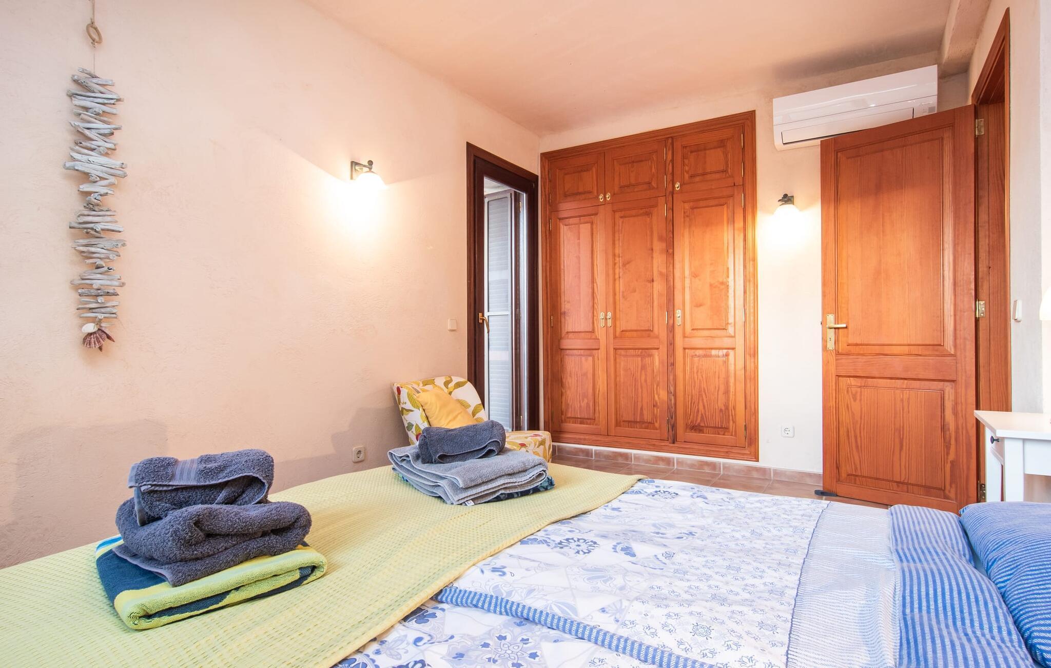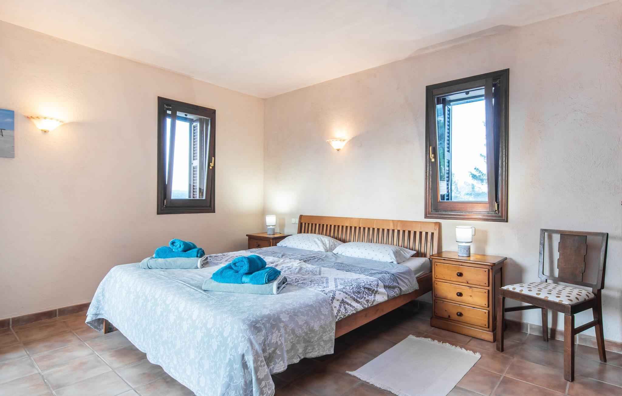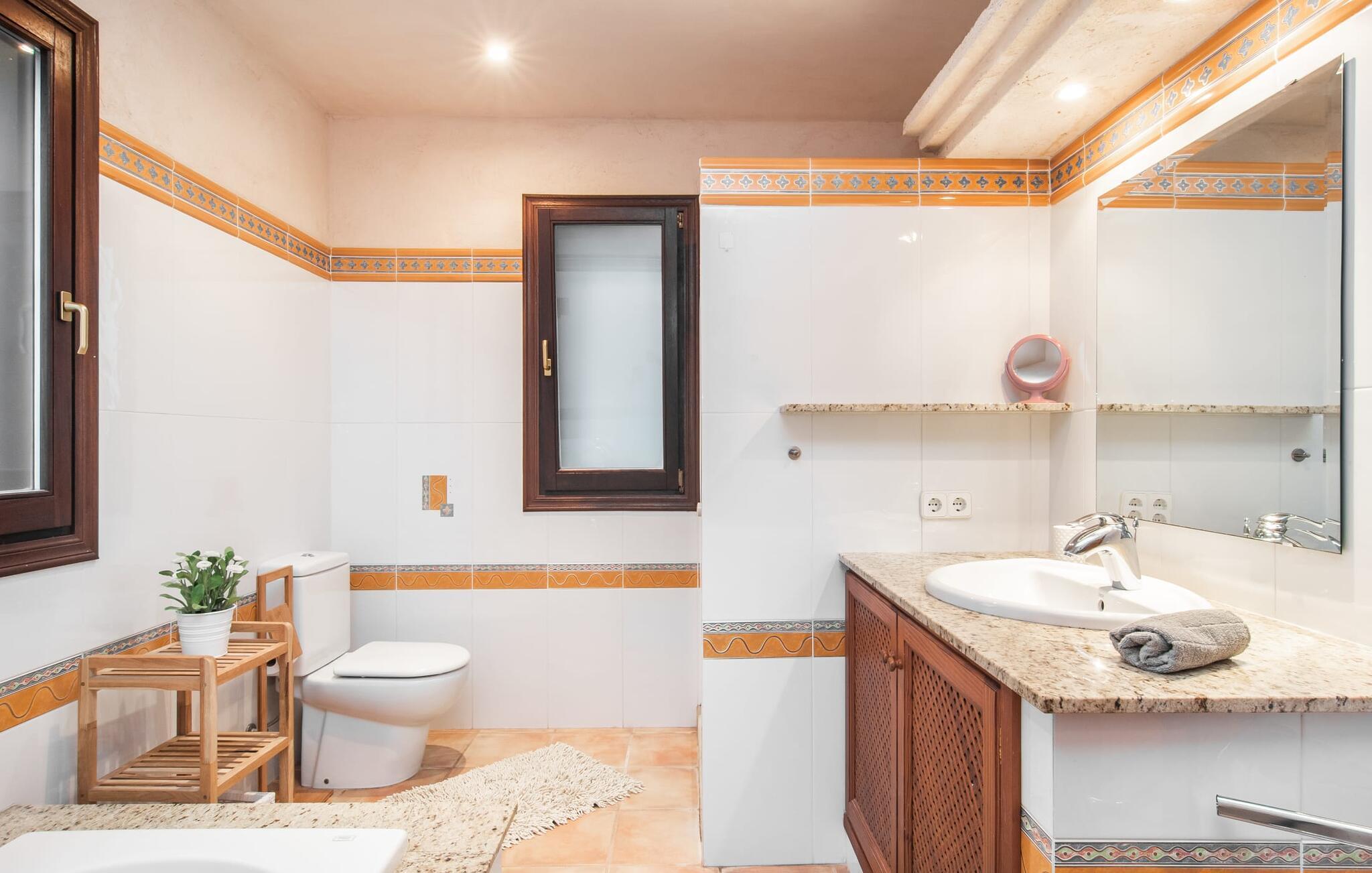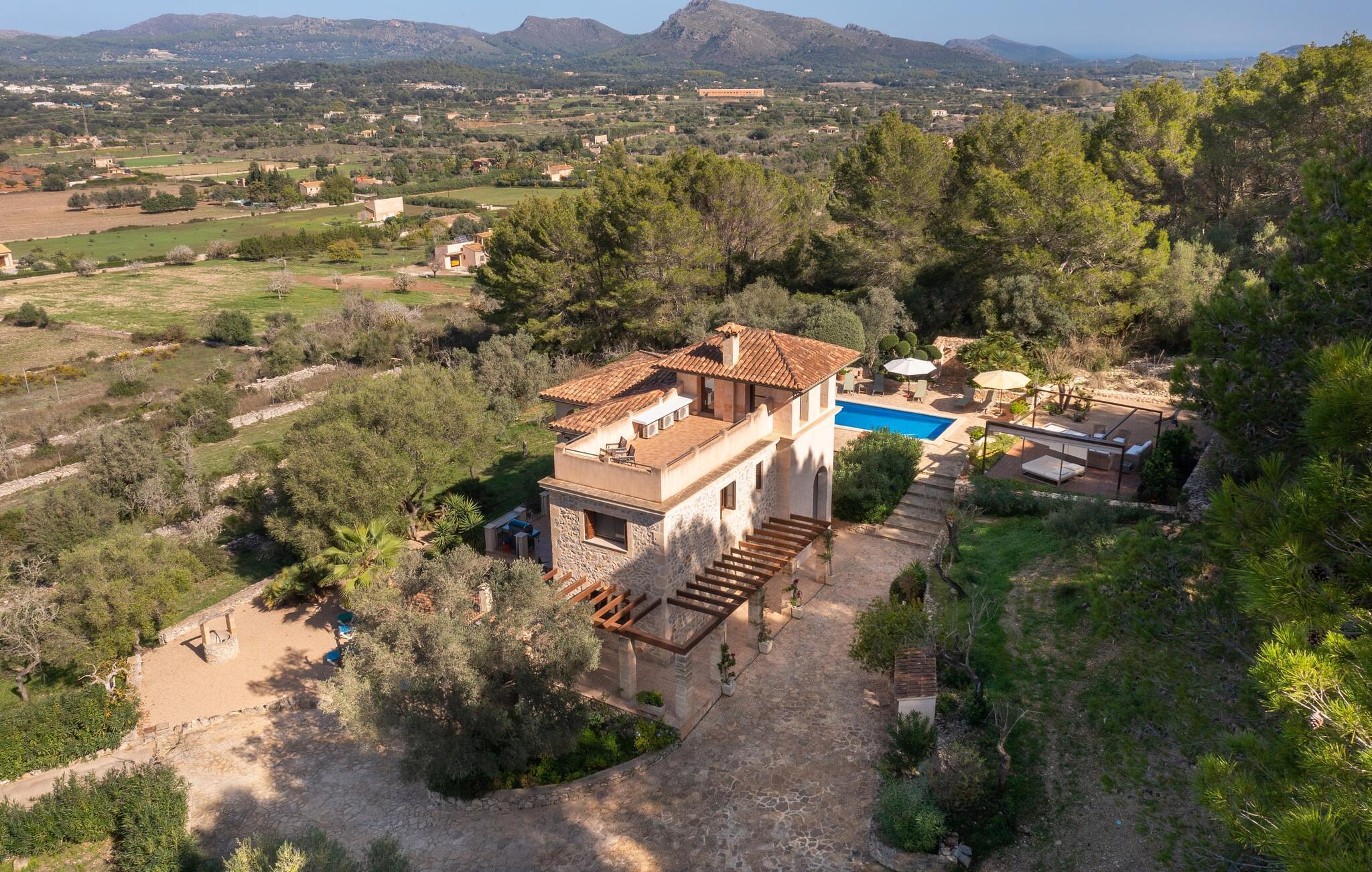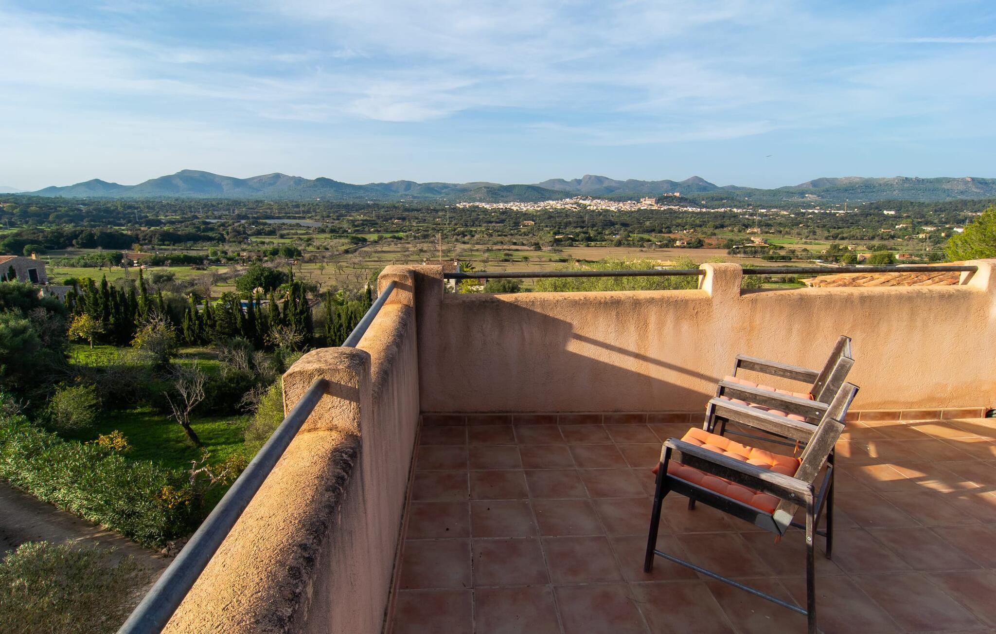 Eine freundliche Ausstattung erfreut den Betrachter beim Betreten des Haupthauses; die schönen Bodenfliesen und die hellen Wände schaffen ein gemütliches Ambiente. Vom Eingangsbereich aus gelangt man in das lichtdurchflutete Esszimmer mit vielen tiefen Fenstern und einer tollen Weitsicht – dies ist ein sehr schöner Ort für stilvolle Indoor-Mahlzeiten. Rechts liegt die offene, durch einen Tresen locker abgetrennte Küche, die mit einer hochwertigen Ausstattung überzeugt. Links vom Eingangsbereich befindet sich das Wohnzimmer, von dem aus man ebenfalls einen herrlichen Blick genießen kann. Im Erdgeschoss befindet sich außerdem das erste Duschbad. Vom Eingangsbereich aus führt eine schöne, typisch mallorquinisch geflieste Treppe in das Obergeschoss. Drei freundlich gestaltete Schlafräume – zwei davon mit Zugang zum Balkon – laden zu entspannter Ruhe ein. Helle Farben in Kombination mit formschönen Möbeln vermitteln eine behagliche Atmosphäre für einen erholsamen Schlaf. Die zwei Bäder auf dieser Etage – eines davon en suite – punkten mit Tageslicht und einem insgesamt hellen und sympathischen Flair. Vom ersten Stock aus gelangt man über eine kurze Treppe zur Dachterrasse. Dort kann man herrlich den Sonnenuntergang genießen und den Blick über die umgebende Landschaft und in Richtung Artà schweifen lassen.
