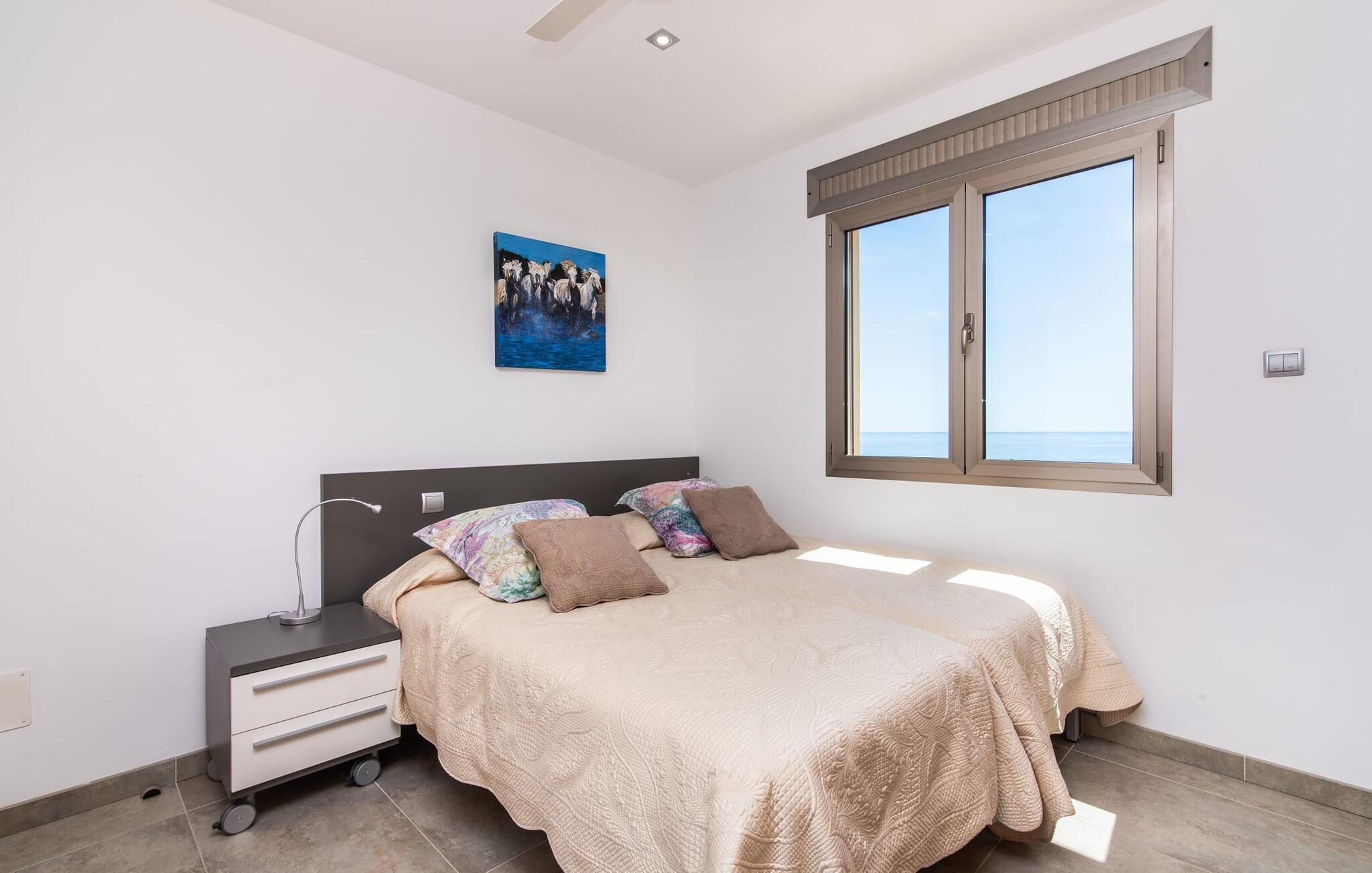 Das geräumige Wohnzimmer mit Essbereich liegt auf der gleichen Ebene wie die Sonnenterrasse. Große Fenster ermöglichen einen tollen Blick auf das Meer und versorgen den Raum mit viel natürlichem Tageslicht. Auf dieser Etage befinden sich auch die moderne, gut ausgestattete Küche und ein kleines Badezimmer. Vom Wohnzimmer aus haben Sie die Wahl zwischen einem Aufzug oder der Treppe, um zu den Schlafzimmern im Obergeschoss zu gelangen. Auch den atemberaubenden Meerblick werden Sie sich von hier aus nicht entgehen lassen. Auf dieser Ebene befinden sich außerdem ein separates Badezimmer und ein für zwei Personen ausgestattetes Büro. Lassen Sie sich vom türkis schimmernden Mittelmeer inspirieren, während Sie in diesem Raum bequem im Homeoffice arbeiten.