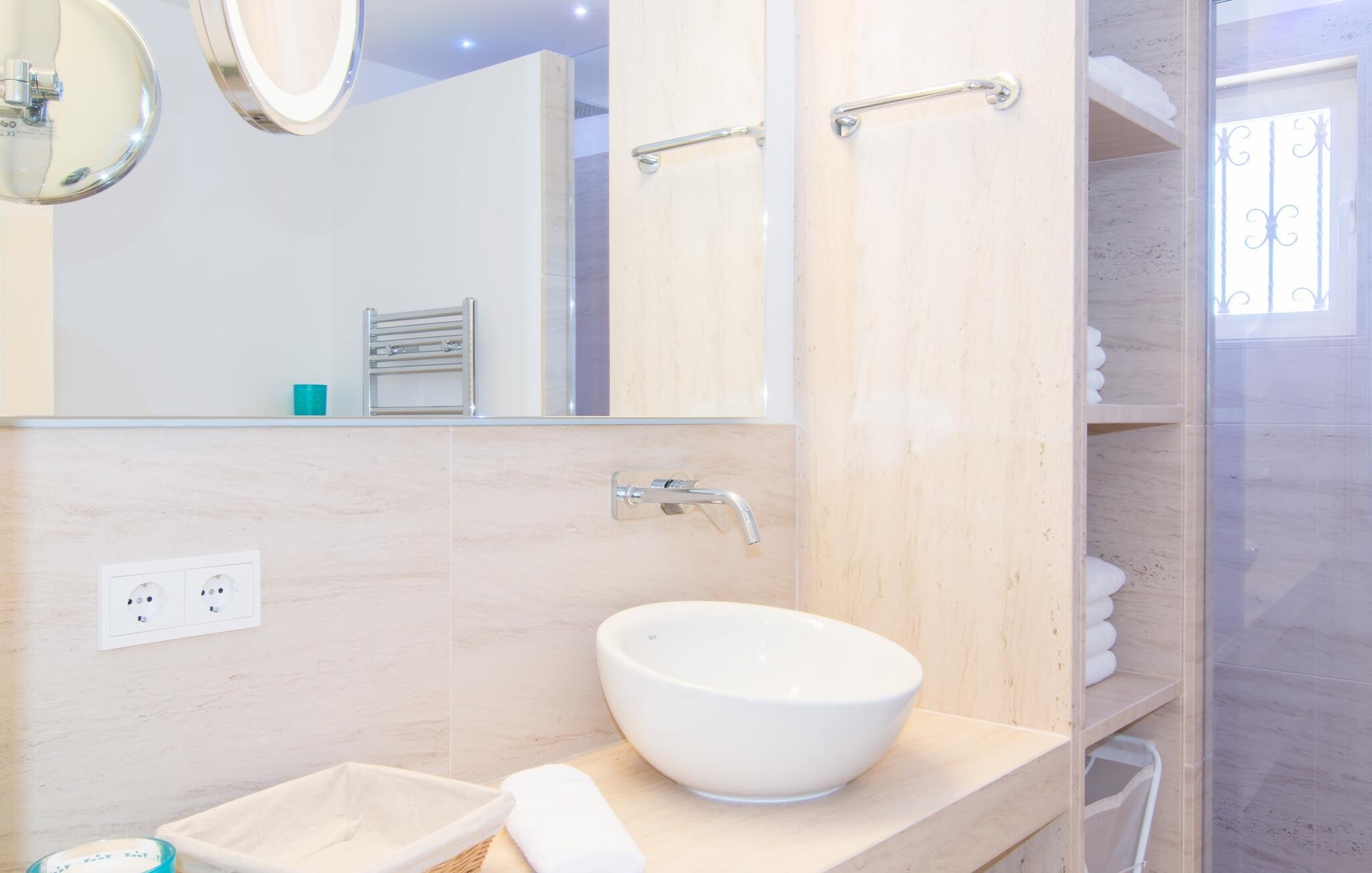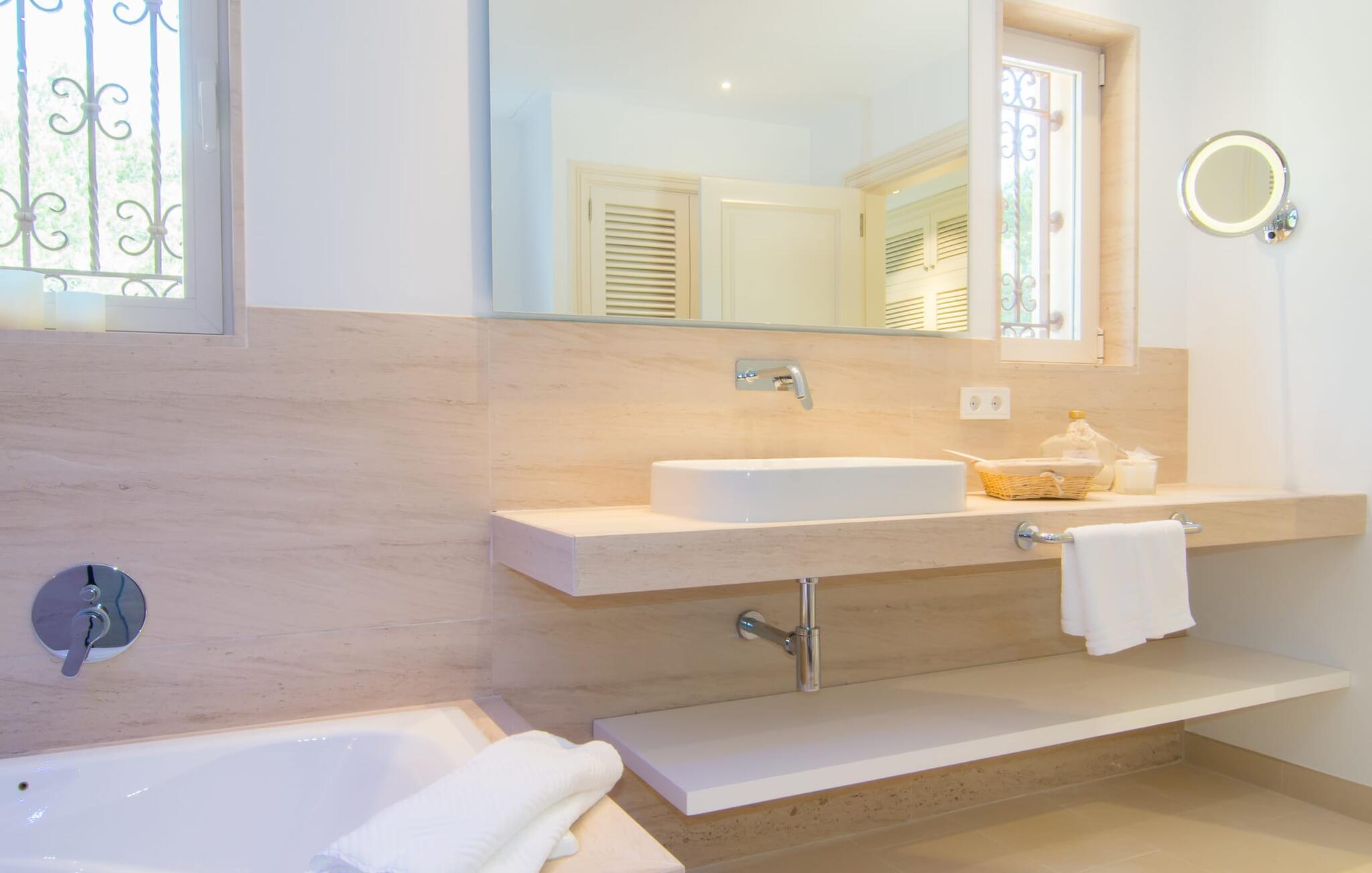 Wer die schönste Zeit des Jahres in einem ebenso trendigen wie vorbehaltlos erstklassigen Ambiente verbringen möchte, dem kann man diese Ferienvilla nur wärmstens empfehlen. Die Lage und Umgebung sind ein weiterer Pluspunkt. Font de Sa Cala ist der Name des örtlichen Sandstrandes im Gemeindegebiet von Capdepera. Nach diesem Strand ist die angrenzende kleine Touristensiedlung benannt. Die Bucht liegt rund 3 Kilometer südlich von Capdepera, weitere malerische Strände wie der Platja de Son Moll sind ebenfalls leicht zu erreichen. Cala Ratjada mit seiner wunderschönen Promenade und guten Einkaufsmöglichkeiten ist nur 10 Minuten mit dem Mietwagen entfernt. Die freistehende Meerblickvilla „S'Heretat“ ist ein riesiges und geradezu luxuriöses Anwesen in der Nähe von Font de Sa Cala. Dieses prestigeträchtige Anwesen ist von einem außergewöhnlich eleganten und gepflegten Außenbereich umgeben. Ein kleines Dorf liegt nur etwa 800 Meter entfernt.