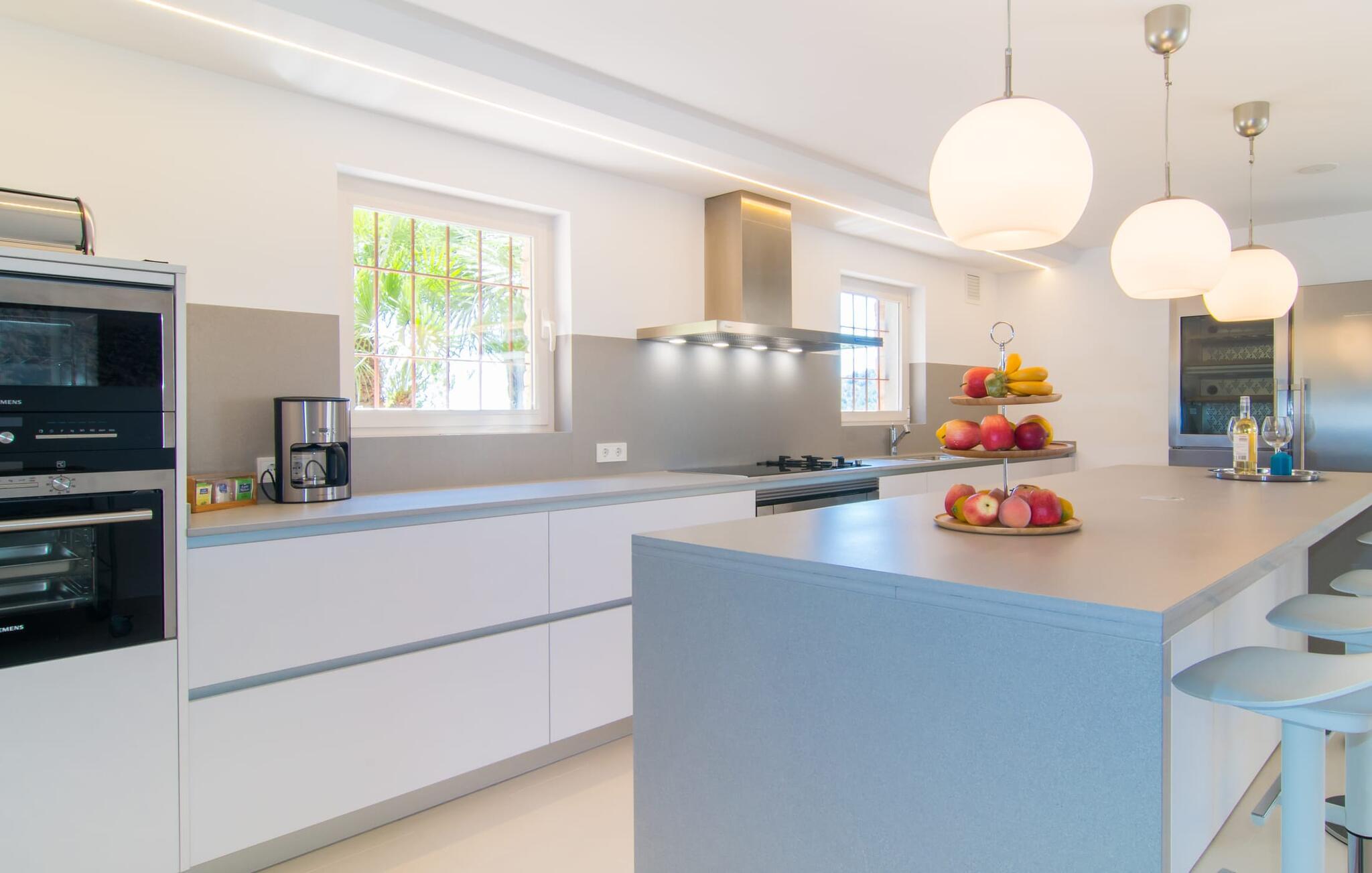 Die Villa selbst besticht durch ihre hohen technischen Spezifikationen und ein minimalistisches Design in Kombination mit genau der richtigen Menge an Farben und Accessoires. Auch aus den lichtdurchfluteten Räumen können Sie die bereits erwähnte Aussicht genießen und gleichzeitig den architektonischen Luxus im Inneren der Immobilie genießen. Ein offenes Wohn-/Esszimmer verfügt über eine sehr gemütliche Sofaecke und einen hübschen Esstisch, an dem Sie drinnen gemeinsam eine deftige Mahlzeit genießen können. Ein weiterer Wohnraum mit Sofa und Sessel bietet Ihnen die Möglichkeit, sich hier in kleiner Gruppe oder alleine zurückzuziehen, zum Beispiel für einen Plausch oder eine ruhige Lektüre. Und einem gemütlichen Abend vor dem Kaminfeuer steht nichts mehr im Wege. In der hellen, voll ausgestatteten Küche finden Sie in einem durch und durch stilvollen Erscheinungsbild alles, was Sie für den täglichen Bedarf benötigen, darunter einen Wasserkocher, eine Filterkaffeemaschine und eine Kapselkaffeemaschine. Die Schlafzimmer bestechen durch klare Linien und viel Weiß, ergänzt durch dezente Farbtupfer, ohne überflüssig zu wirken. Der morgendliche Blick aus dem Fenster wird Tag für Tag ein besonderer Anblick sein. Eines der Doppelzimmer ist mit einem 2 x 2 m großen Bett ausgestattet, die anderen fünf sind alle mit zwei kombinierten Betten von 1,05 x 2 m ausgestattet. Geradlinigkeit und ein schlichtes, aber elegantes Design zeigen sich auch in den sechs Badezimmern, davon vier komfortable En-Suite-Badezimmer. Den Gästen stehen ein Bügeleisen und fünf Haartrockner zur Verfügung, sodass Sie keinen Gepäckraum verschwenden müssen, indem Sie Ihr eigenes Gepäck von zu Hause mitbringen.