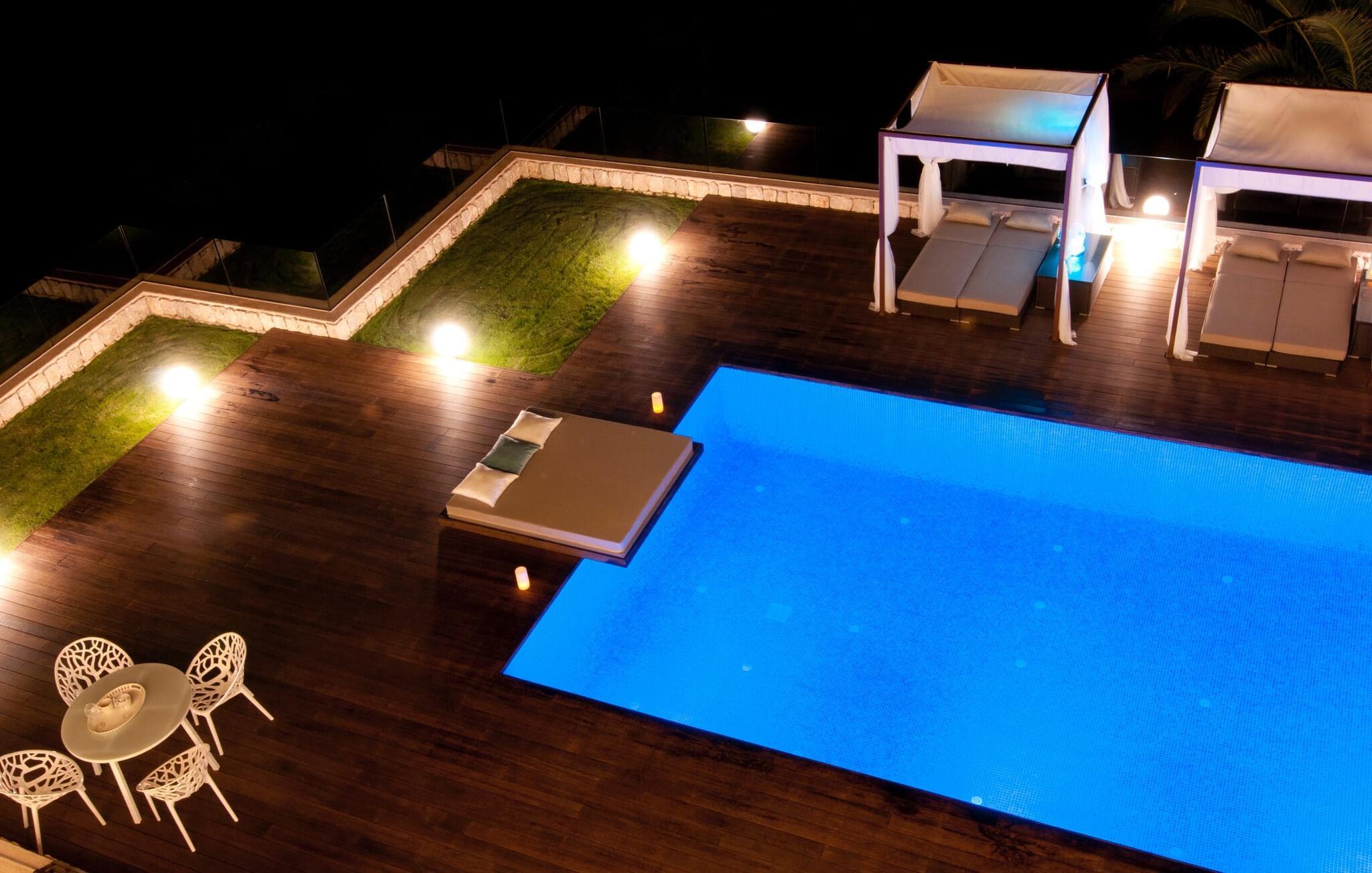 Wer sich für diese Immobilie interessiert, hat hohe Ansprüche an Luxus und Komfort sowie ein gutes Gespür für eine unvergleichliche Ästhetik. Schauen wir uns dieses erstklassige Ferienhaus also etwas genauer an. Das Anwesen liegt auf einem freistehenden, ländlichen Anwesen mit einer Fläche von rund 15.000 Quadratmetern. Die Villa ist über eine kleine, kurvenreiche Auffahrt erreichbar und beeindruckt schon auf den ersten Blick durch ihr imposantes Design und ihren Stil. Dabei handelt es sich um ein komplett renoviertes, ehemaliges Herrenhaus, das nun in seinem alten Glanz zu sehen ist. Der parkähnliche Garten ist im mediterranen Stil angelegt, liebevoll gepflegt und bildet den perfekten Außenbereich für einen rundum komfortablen Aufenthalt. Die große überdachte Terrasse spendet wohltuenden Schatten und lädt zum Verweilen in der herrlichen Idylle um Sie herum ein. Die Ihnen zur Verfügung stehenden Gartenmöbel sind hochwertig und komfortabel zugleich. Was gibt es Schöneres, als morgens einfach hier zu sitzen, den neuen Tag anzuschauen und gleichzeitig ein stärkendes Frühstück und die herrliche Aussicht zu genießen, die sich von der hügeligen Landschaft bis zum Meer erstreckt? Der eingebaute Grillplatz lädt Sie zu kulinarischen Abenden ein, vielleicht unter dem mediterranen Sternenhimmel, während Ihre gesamte Gruppe zusammenkommt und Ihren Gaumen mit frisch zubereiteten, regionalen Köstlichkeiten verwöhnt. Mit einer Größe von 15 x 5,20 m und einer Tiefe von bis zu 2 m ist der riesige Pool wirklich beeindruckend. Es ist zudem bequem begehbar und verfügt über einen schrägen Boden. Neben dem Pool befindet sich eine herrliche Holzterrasse, die mit bequemen Liegestühlen und mehreren herrlichen Sonnenliegen ausgestattet ist. Sonnenanbeter kommen hier gleich in mehrfacher Hinsicht auf ihre Kosten und können auch beim Entspannen unter der mediterranen Sonne die einfach grandiose Aussicht genießen. Wer sich vor starker UV-Strahlung schützen möchte, findet unter einem der verfügbaren Sonnenschirme Schutz. Auch der großzügige Balkon im ersten Stock bietet einen fantastischen Aussichtspunkt, um den Panoramablick zu genießen.