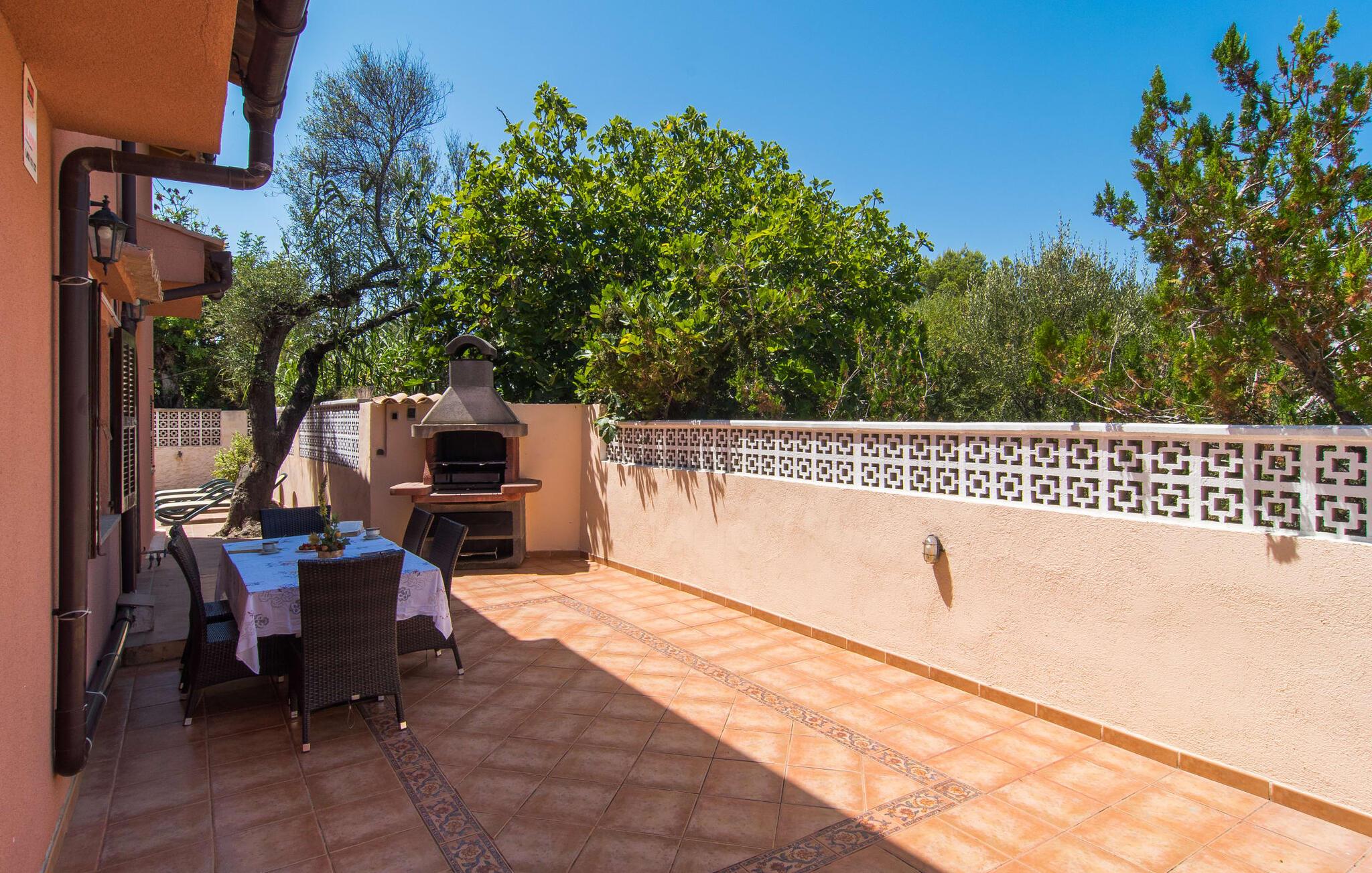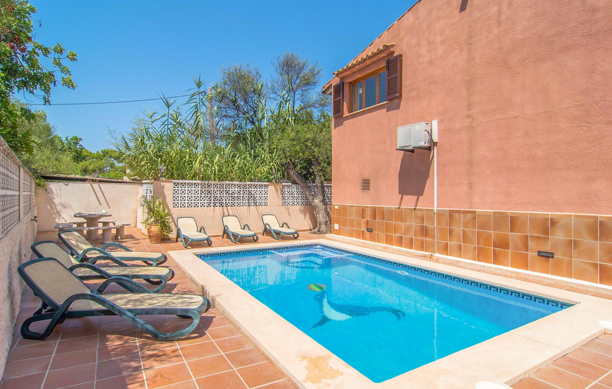 Sie suchen ein Ferienhaus auf Mallorca, von dem aus Sie fast alles bequem zu Fuß erledigen können? Was nicht mitten in der Stadt, aber auch nicht zu weit draußen auf dem Land liegt? In der Nähe von Meer und Strand? Dann haben Sie mit der Villa „S’Hort de Cal Rei“ die perfekte Ferienunterkunft für bis zu sieben Personen gefunden! Dieses hübsche terrakottafarbene Ferienhaus liegt am Rande des beliebten Ferienortes Cala Ratjada, in einer typischen Wohnstraße. Dennoch bietet das Anwesen viel Privatsphäre: Der Pool mit Whirlpool direkt am Haus ist von einer Mauer und Bäumen umgeben, die eine angenehme Privatsphäre bieten. So können Sie auf einer der Sonnenliegen ungestört in der Sonne entspannen. Ideal hierfür sind auch die verschiedenen Terrassenbereiche mit ihren Sitzgelegenheiten. Das Dorf und die Bucht mit dem Strand Platja de Son Moll sind fußläufig erreichbar – Ihren Mietwagen können Sie bequem in der Straße vor dem Haus parken.