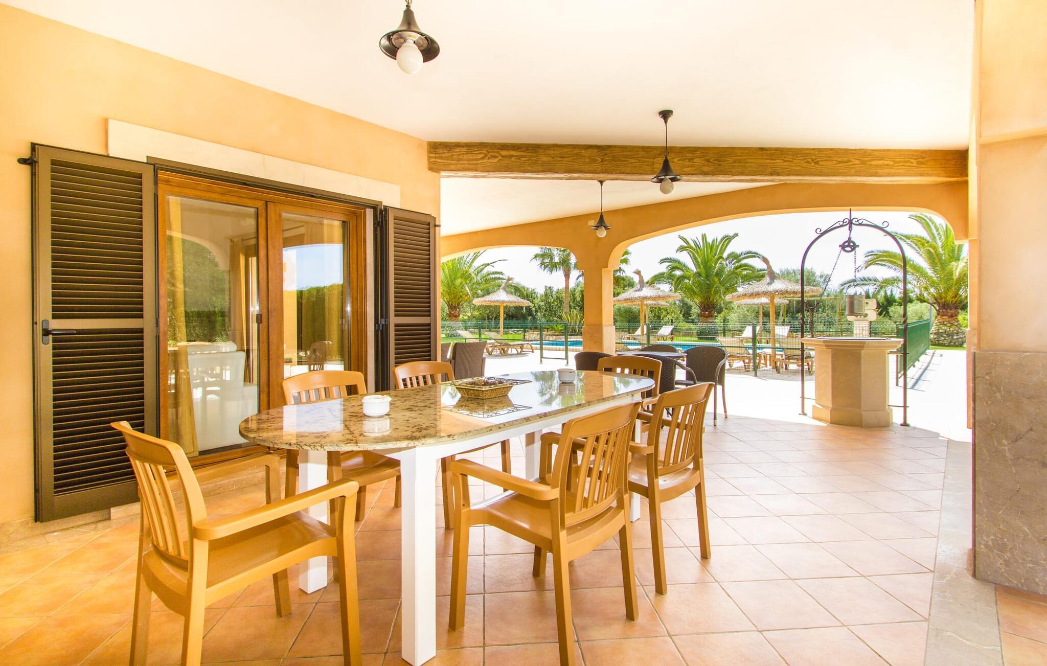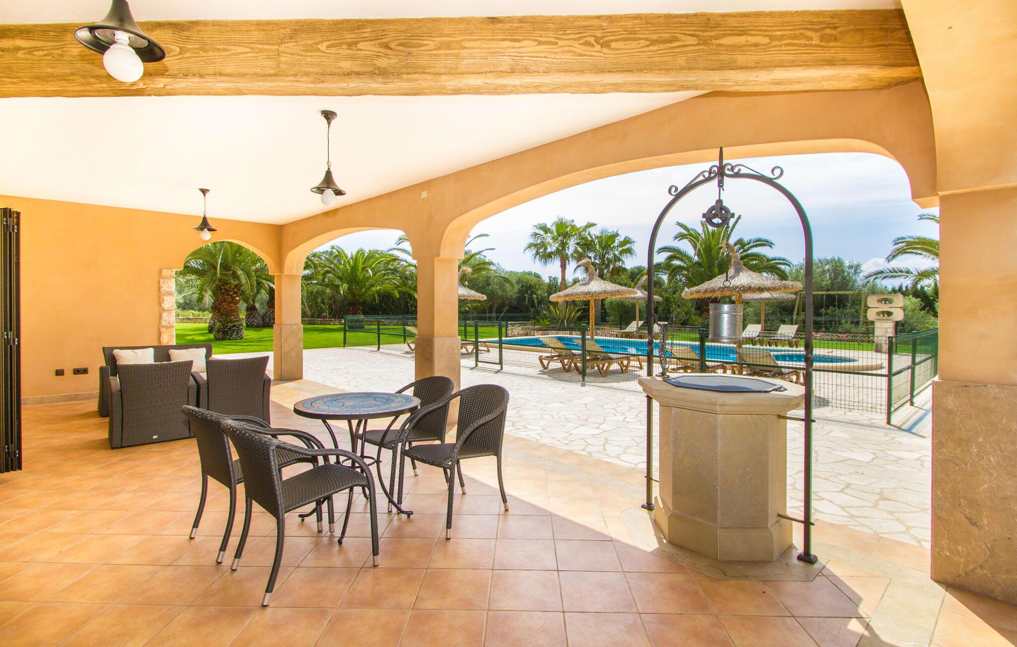 Wer sich mit dem Bootfahren auskennt, kann mit der Villa „S'Hort den Felip“ seinen Horizont erweitern. Wie die westlich von Ses Salines gelegene Schwestervilla stellt auch dieses Objekt höchste Ansprüche – und das zeigt sich bereits im Außenbereich. Ein Zaun umgibt den großzügigen Pool mit dem schimmernden Delphin auf dem Boden, sodass Sie im Urlaub mit Kindern so richtig entspannen können. Auf die Kleinen übt die Schaukel auf der Rasenfläche rund um den Pool und die Terrasse eine magnetische Anziehungskraft aus. Der Luxus eines Gartenhauses wirkt geradezu imposant, wo man nicht nur auf dem stattlichen Grill frische Köstlichkeiten zubereiten kann, sondern wo es auch ein gut ausgestattetes Außenbad gibt. Daneben lädt eine große Kiefer mit einem stabilen Steintisch im Schatten unter seinen Ästen zum Verweilen ein. Die warme Brise streicht durch das Grün und das nahe Meer macht ihre Präsenz spürbar. Direkt am Wasser gibt es zahlreiche Sonnenliegen, die dank der Strohschirme für eine entspannte Atmosphäre sorgen und sich perfekt für ein ausgedehntes Sonnenbad eignen. Die Veranda verläuft L-förmig um das Grundstück und Sie haben die Qual der Wahl zwischen verschiedenen Sitzgelegenheiten – inklusive bequemer Korbmöbel. Ein weiteres merkwürdiges Merkmal ist der noch erhaltene Brunnen, der daran erinnert, wie wichtig Wasser schon immer für Villen war, die ursprünglich für landwirtschaftliche Zwecke genutzt wurden.