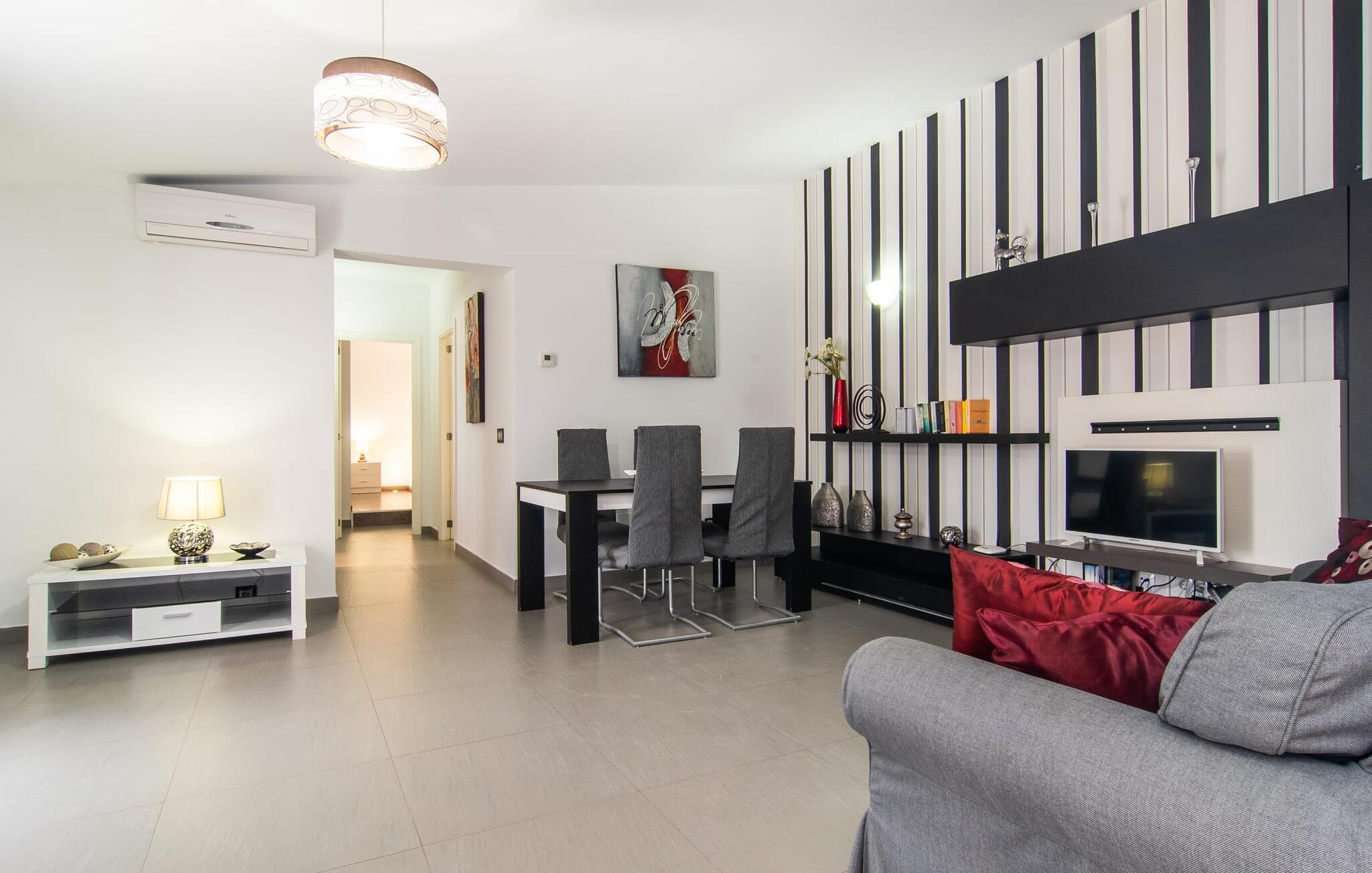 Im Inneren der Villa befindet sich ein hochmodernes Apartment, das sich durch ein elegantes Schwarz-Weiß-Design auszeichnet. Die offene Küche und der Wohnbereich schaffen eine einladende Atmosphäre, ideal zum Entspannen auf der Couch oder zur Planung Ihres nächsten Abenteuers. Mit zwei Schlafzimmern und einem Badezimmer ist die Villa für jeden Geschmack geeignet. Auf der anderen Seite der Terrasse finden Sie die weiteren Schlafzimmer. Hier dominieren die natürlichen Holztöne das helle und freundliche Ambiente und sorgen für einen komfortablen und stilvollen Aufenthalt.