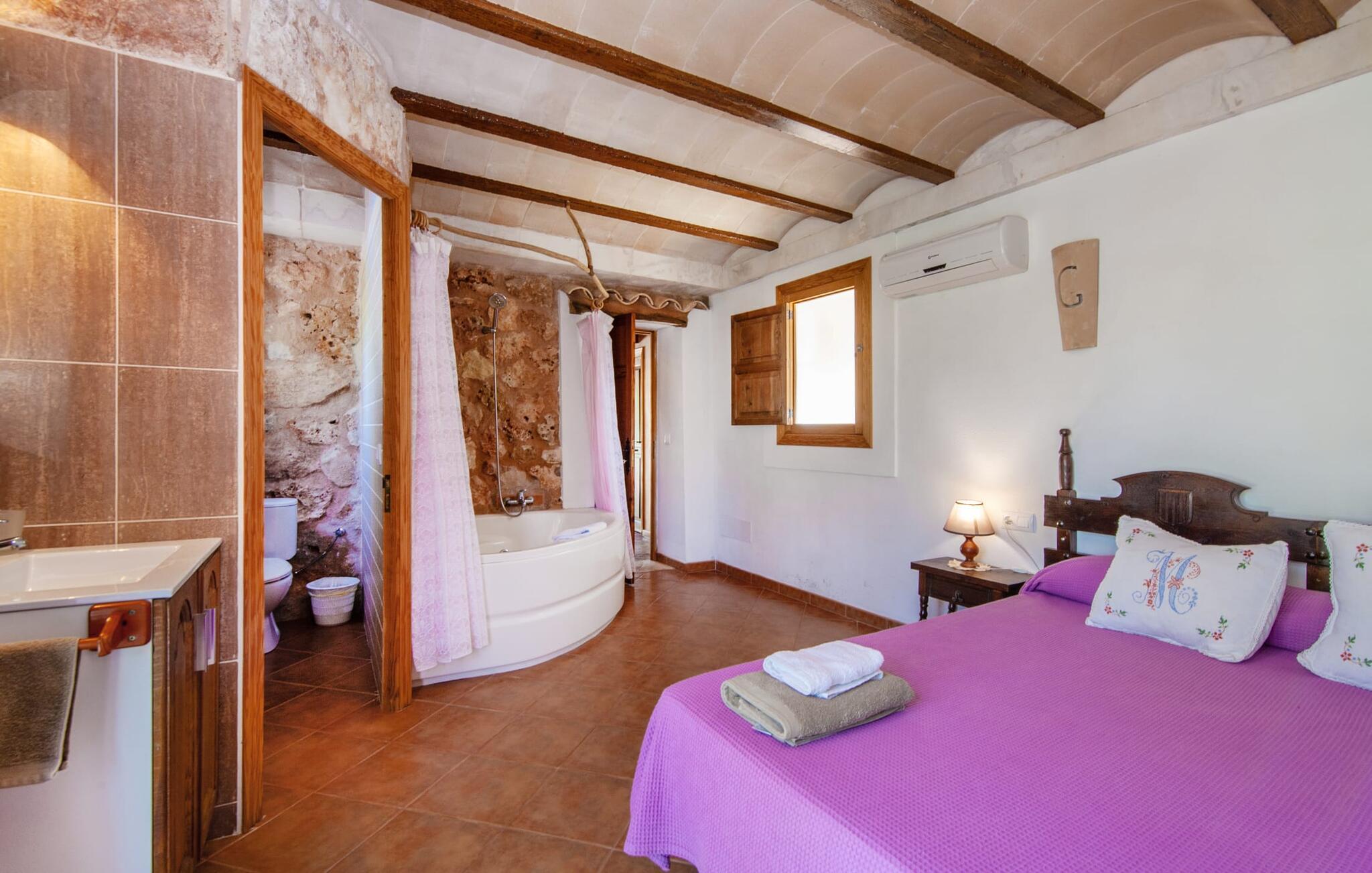 Den Außenbereich möchte man eigentlich gar nicht verlassen, doch das Innere des Hauses steht den Außenbereichen in nichts nach. Mehr noch: Die Originalität der Inneneinrichtung ist einfach ein Traum! Was hier groß geschrieben wird: Holz. Neben der Verwendung dieses Naturmaterials in Form von Fenstern, Türen und Möbeln findet man hier auch absolut außergewöhnliche Umsetzungen, wie das Geländer aus verschiedenen Olivenzweigen oder den in der Mitte der Küche emporragenden Baumstamm. Der Aufenthalt hier ist wunderbar gemütlich und urig. Neben der offenen Wohnküche befindet sich im Erdgeschoss dieser Finca auf Mallorca ein Badezimmer mit Naturstein sowie ein Doppelschlafzimmer mit integriertem Whirlpool und Bad en suite. Über die offene Treppe gelangt man in den oberen (offenen) Schlafbereich mit zwei Einzelbetten (eines davon ist ein Ausziehbett). Die Finca „Sa Barraqueta des Cazadors“ ist ein echtes Unikat auf Mallorca. Es liegt in einer wunderbar ruhigen Gegend zwischen Campos (ca. 6 km), wo Sie Ihre täglichen Einkäufe erledigen können, und Santanyí (ca. 8 km). Richtung Süden können Sie wunderschöne Küstendörfer besuchen. Tolle Strände wie Cala Santanyí und natürlich der Traumstrand schlechthin – Es Trenc – sind bequem mit dem Mietwagen erreichbar.
