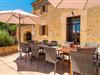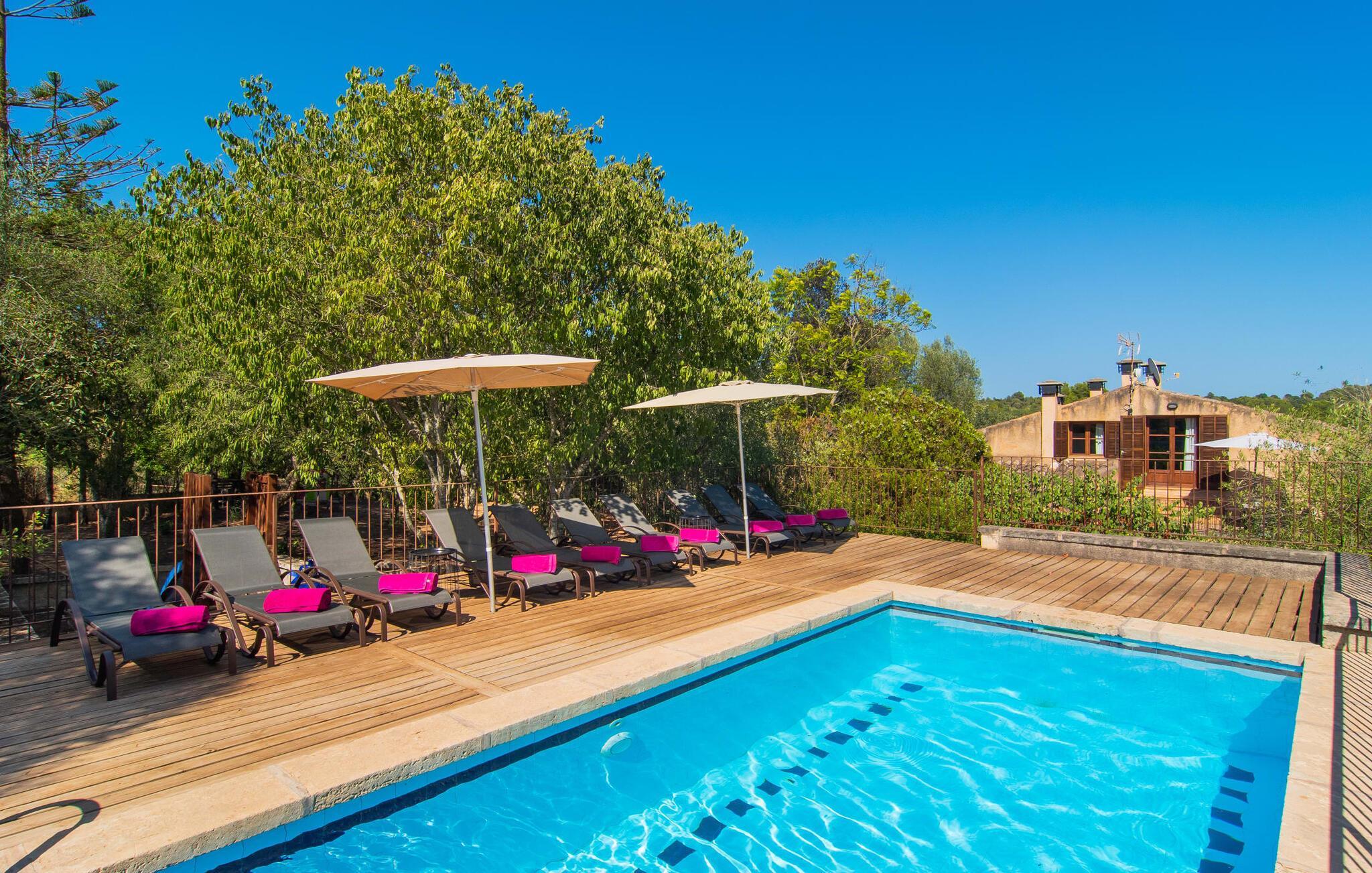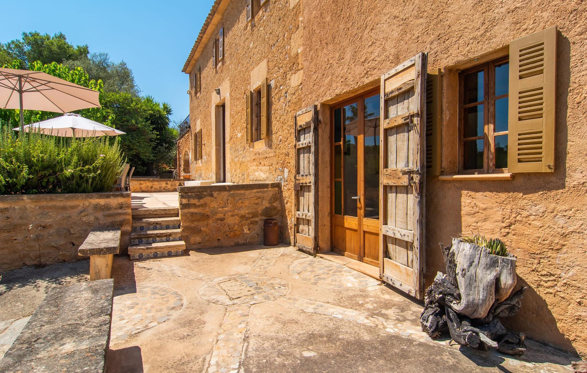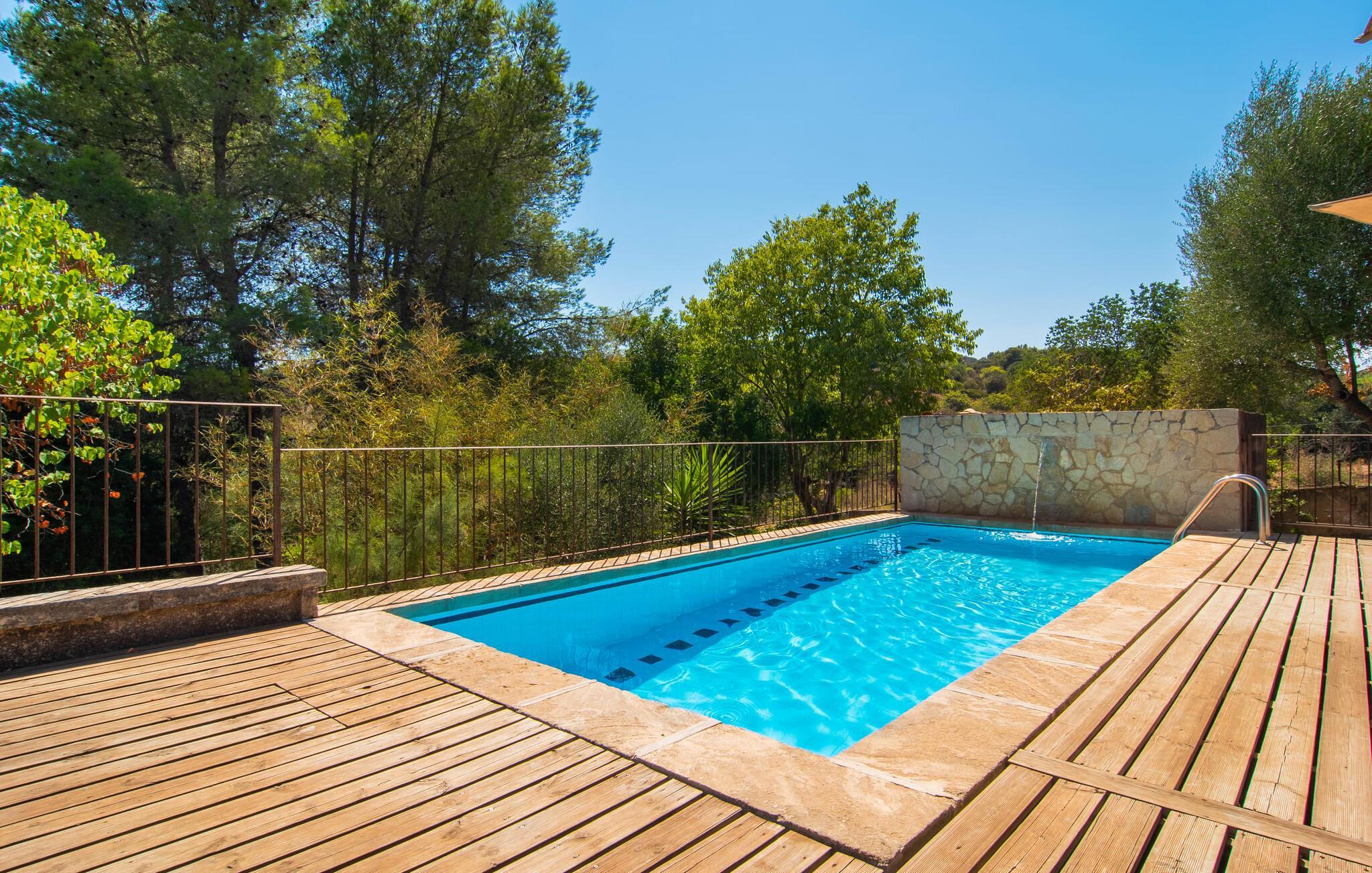 In der ruhigen und abgelegenen Umgebung der Villa „Sa Bogura“ können Sie eine bezaubernde Umgebung genießen und sich im wahrsten Sinne des Wortes zurückziehen. Eine kleine Straße zur Villa führt Sie zu diesem großzügigen Anwesen, dessen rustikales Ambiente besonders bei unseren Gästen beliebt ist. Schon bald nach Ihrer Ankunft werden Sie feststellen, dass dies ein Ort ist, der rundum Entspannung bietet. Hier können Sie Ihren Urlaub in typisch mallorquinischer Atmosphäre genießen. Der Außenbereich ist geprägt von großzügigen Terrassen, urigen Treppen, Nischen und Mäuerchen sowie allerlei mediterranen Pflanzen. Für die Kinder gibt es sogar eine Rutsche und eine tolle Baumschaukel. Der etwas abseits gelegene und über Stufen erreichbare Pool bietet einen traumhaften Aufenthaltsort. Der Pool ist zwischen 1,20 m und 1,80 m tief und über eine Leiter erreichbar. Liegestühle und Sonnenschirme auf der Holzterrasse sind perfekt für Sonnenanbeter, die hier am Mittelmeer nach Herzenslust entspannen und den Alltag weit hinter sich lassen können. Und das praktische Außenbad macht es einfach, den ganzen Tag im Freien zu verbringen. Auf einer der hausnahen Terrassen mit großem Esstisch können Sie entspannt sitzen und entweder ein erfrischendes Getränk genießen oder in geselliger Runde Mahlzeiten feiern. An lauen Abenden haben Sie die Möglichkeit zu einem deftigen BBQ, bei dem Sie kochen und anschließend leckere mallorquinische Zutaten probieren können. Dafür eignet sich der überdachte Grillplatz auf der linken Seite des Hauses perfekt, der ideale kleine Ort, um den Tag gemütlich ausklingen zu lassen. Weitere einladende Sitzecken auf dem Grundstück bieten die Möglichkeit, immer wieder neue Lieblingssitzplätze zu finden und sich nach Lust und Laune auch für einen Moment zurückzuziehen. Die vielen Bäume rund um das Haus bieten tolle natürliche Schattenplätze, an denen Sie angenehm und luftig sitzen können.
