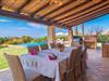 Die beiden hohen Palmen, die den Pool elegant säumen, sind nur eines der markanten Merkmale, die dieses einladende Ferienobjekt auszeichnen. Eine lockere und dekorativ bepflanzte Fläche prägt den angenehmen Eindruck von außen. Rasen- und Kiesflächen prägen die Atmosphäre, die diese Villa umgibt, ebenso wie die Terrassenflächen aus Naturstein. Der extrem lange Infinity-Pool mit 14-Meter-Bahnen ermöglicht Ihnen das besondere Erlebnis, beim Gleiten durch das Wasser den Blick uneingeschränkt in die Ferne schweifen zu lassen. Das Poolbecken ist mit hübschen, leuchtend blauen Mosaiksteinen gefliest und sehr bequem über eine Treppe erreichbar. Zum gemütlichen Sonnenbaden stehen ausreichend bequeme Liegen zur Verfügung. Für den Fall, dass die UV-Strahlung zu stark wird, stehen drei Sonnenschirme in der Nähe. Auch die überdachte Terrasse direkt am Haus lädt zum Verweilen ein. Vielfältig platzierte bequeme Sitzmöbel werden stimmungsvoll umrahmt von Naturstein, einer rustikalen Sichtbalkendecke und opulenten Säulen. Am großen Esstisch können Sie Ihren Morgen mit Blick auf die beeindruckende Weite beginnen und gleichzeitig ein stärkendes Frühstück genießen. Abends lädt der Grill zum Zubereiten eines kulinarischen Abendessens ein.