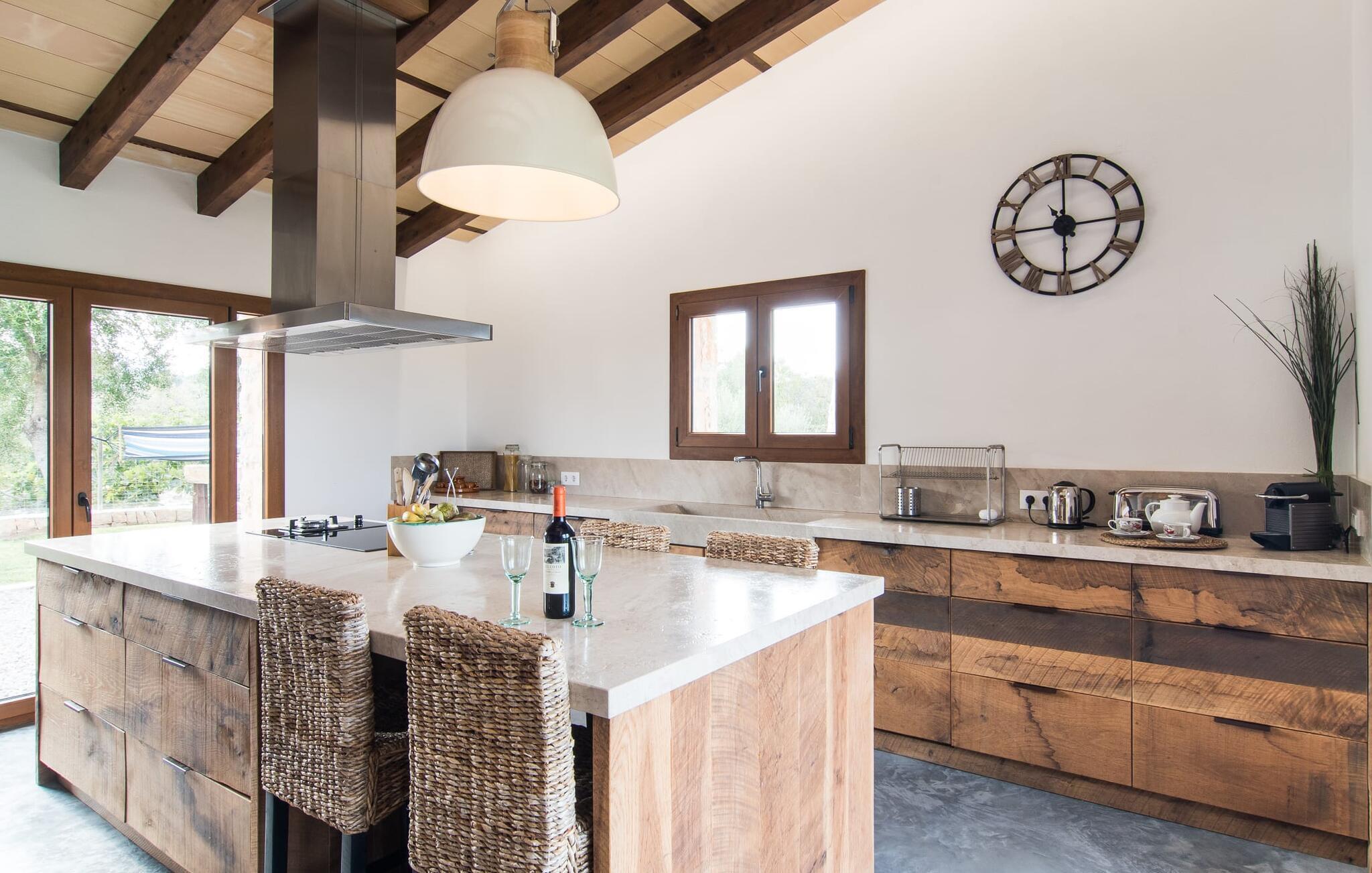 Ein Blick ins Innere der Natursteinvilla ist ein Hochgenuss: Die vielen originellen Details machen das moderne Haus zu einem Ort mit echtem Wohlfühlcharakter. Eine Lampe in Form eines Holzrads erhellt das geräumige Wohnzimmer, und der Tierfellteppich passt ebenso gut dazu wie die groben Deckenbalken und der solide, raue graue Boden. Der Kamin wärmt Ihre Füße an kälteren Abenden und sorgt in Kombination mit der hellen Couch und den Lichtvorhängen für eine besonders heimelige Atmosphäre. Dieser Raum verfügt außerdem über einen Esstisch und einen großen, offenen Durchgang zur Küche direkt dahinter. Charmante Optik, stilvolle Kochinsel mit Barhockern, direkter Zugang zum Garten – diese Küche macht jeden gemeinsamen Tapas-Tag zu einem besonderen Erlebnis. Hier finden Sie alles, was Sie brauchen: einen modernen Kühlschrank, eine Mikrowelle, einen Wasserkocher, einen Toaster und mehr. Das Haus beherbergt insgesamt drei helle, ansprechend gestaltete Doppelzimmer und zwei Badezimmer. Praktisch: Die Villa wurde komplett ebenerdig gebaut und ist daher frei von stolpernden Treppen.