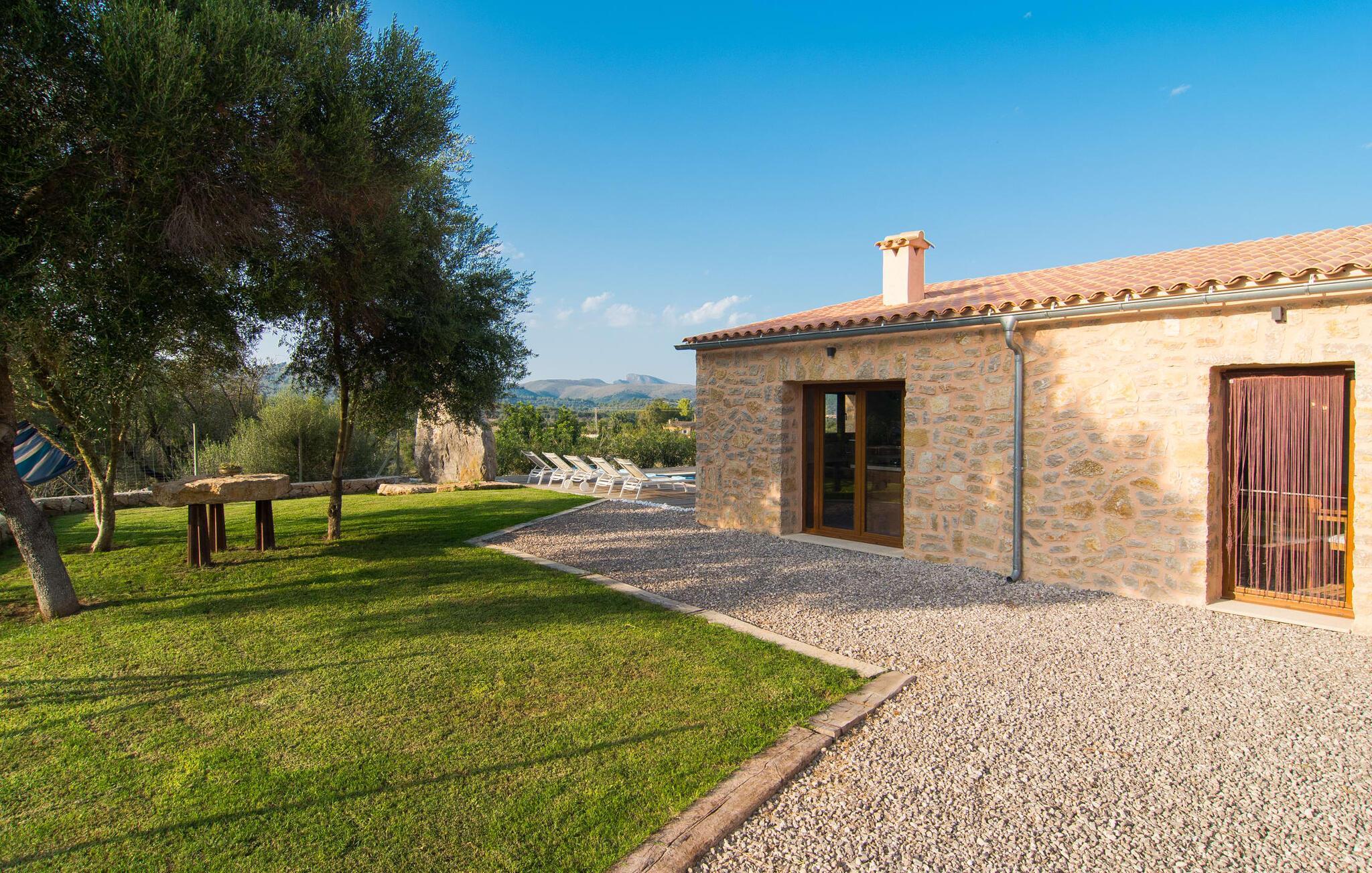 Stellen Sie Ihren Mietwagen schnell auf dem Schotterparkplatz ab und steigen Sie dann ein paar Stufen hinauf zur Villa – und schon kann der Urlaubsspaß im neuen Traumhaus beginnen. Bei Ihrer Ankunft im „Sa Carbona“ fällt Ihnen sofort der hervorragend gepflegte, schnörkellose Stil auf. Ein Blick hinter die Kulissen wird diesen Eindruck schnell bestätigen. Im 11 m langen Becken können Sie nach Herzenslust planschen, aber auch ein paar Bahnen schwimmen. Von der Liege direkt ins kühle Nass und dann wieder in die Sonne – was für eine tolle Möglichkeit, hier ganze Tage zu verbringen. Charmante Holzpaletten umrahmen die Oase der Erfrischung und niedrige Büsche geben den Blick auf die wunderbare Umgebung frei: Hier genießt man einen fantastischen Blick über die flachen Berge bis hin zur Burg von Artà. Die mit Bast bedeckte Terrasse bietet Schatten und Platz für einen Tisch mit Bänken – schlicht, minimalistisch, schön. Um die Ecke sorgt die Hängematte unter den Bäumen für erholsame Pausen. Und während die Tiere im umzäunten Bereich friedlich grasen, können Sie hier auch den Grill anfeuern.
