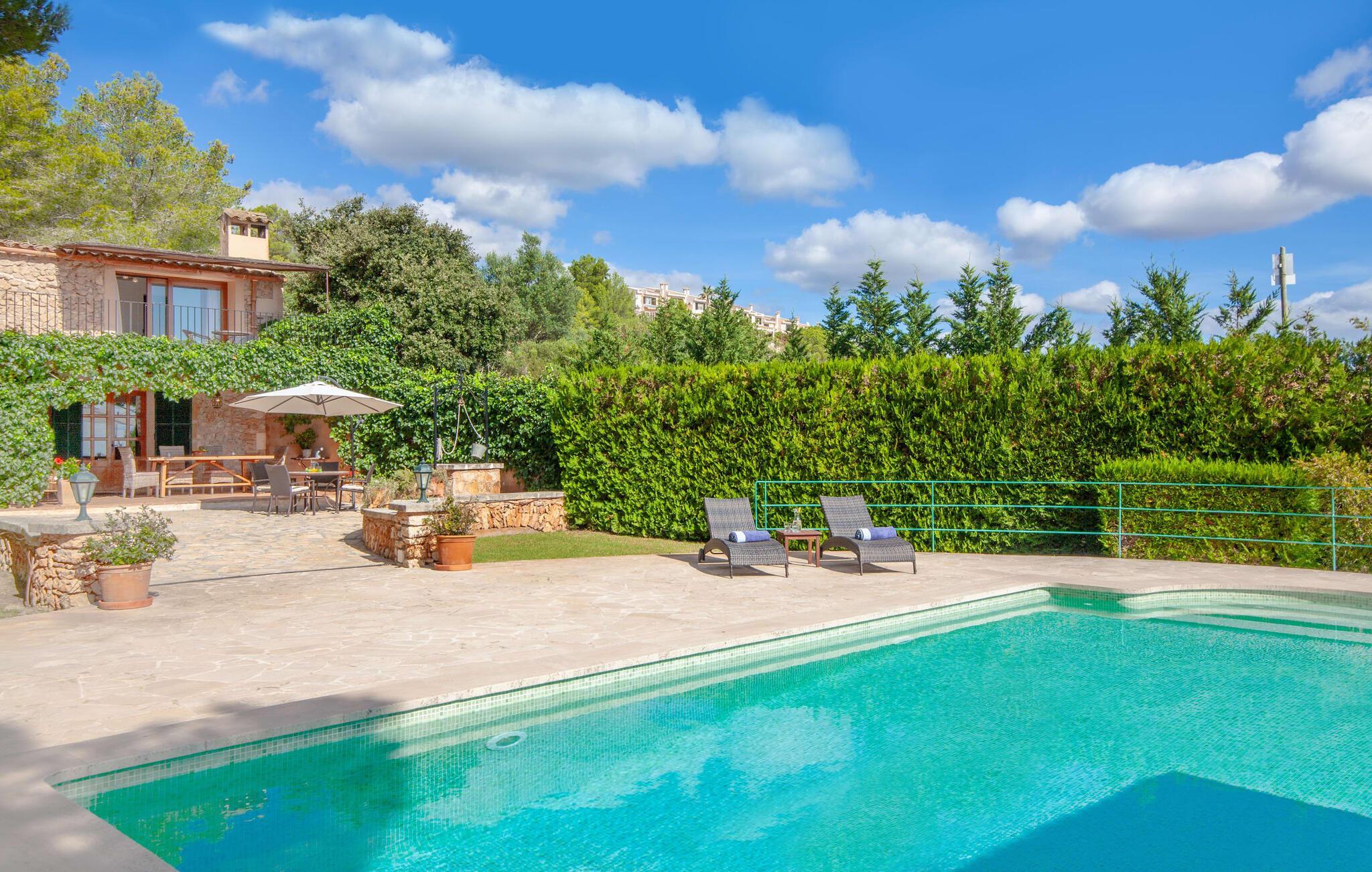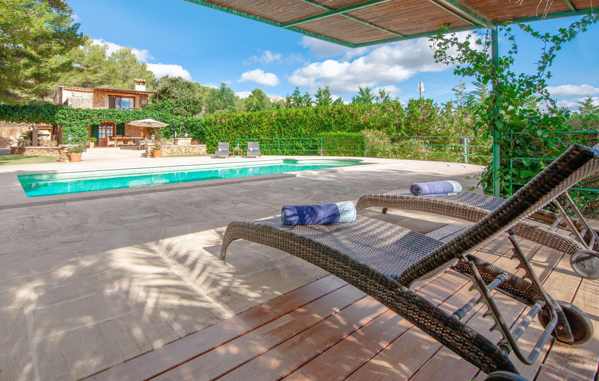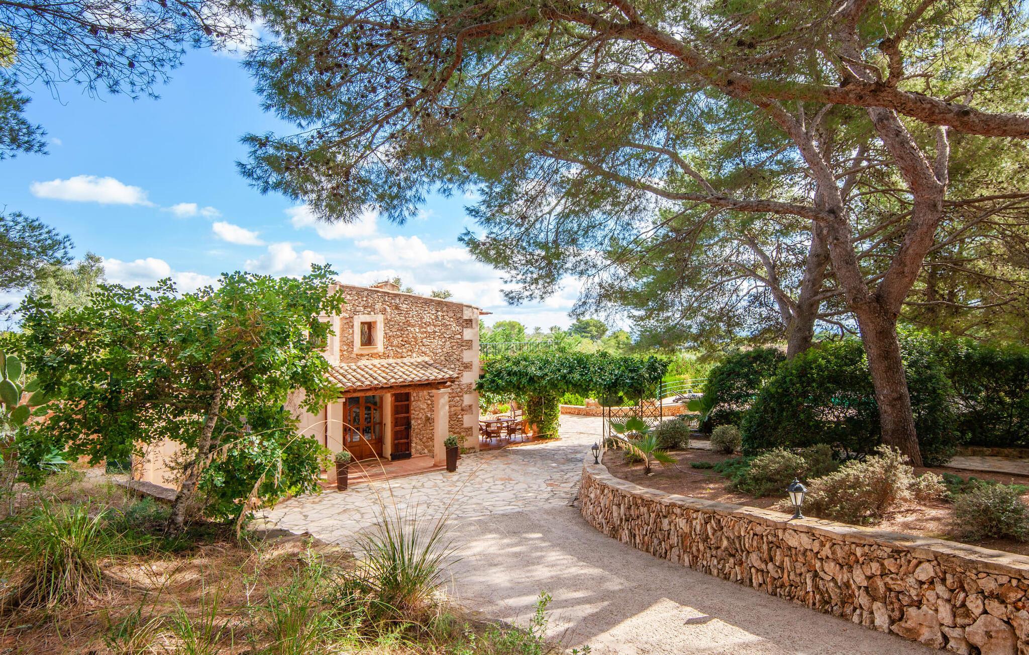 Die wunderschön gelegene Finca „Sa Caseta d’Or“ liegt vor der fast märchenhaften Kulisse aus Pinienwäldern, die dem Anwesen seinen Charakter verleihen. Wo auch immer Sie sind und schauen – hier sind Sie absolut privat und allein. Zunächst ahnt man nicht, in was für einer prädestinierten Lage man sich befindet. Doch wenn man um das Grundstück herum in Richtung Pooloval mit Sonnenterrasse oder auf die Dachterrasse im Obergeschoss geht, eröffnet sich ein zauberhafter Ausblick auf den kleinen Küstenort Portocolom Mallorcas größter Naturhafen raubt einem fast den Atem. Es ist einfach großartig! Der gesamte Außenbereich mit Rasen, Hangsicherung aus Natursteinmauern und den sehr schön angelegten Terrassenflächen überzeugt. Sitzplätze unter Bäumen und Sonnenliegen, die auch unter dem Toldo direkt am Poolrondell beschattet werden können, strukturieren den märchenhaften Garten. Die geschützte Außenküche mit gemauertem Grill und die überdachte Sitzgelegenheit direkt am Haus runden das Bild eines einzigartigen mallorquinischen Ferienhauses ab.