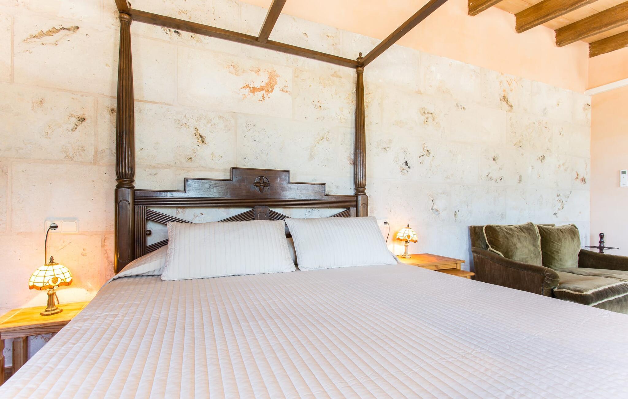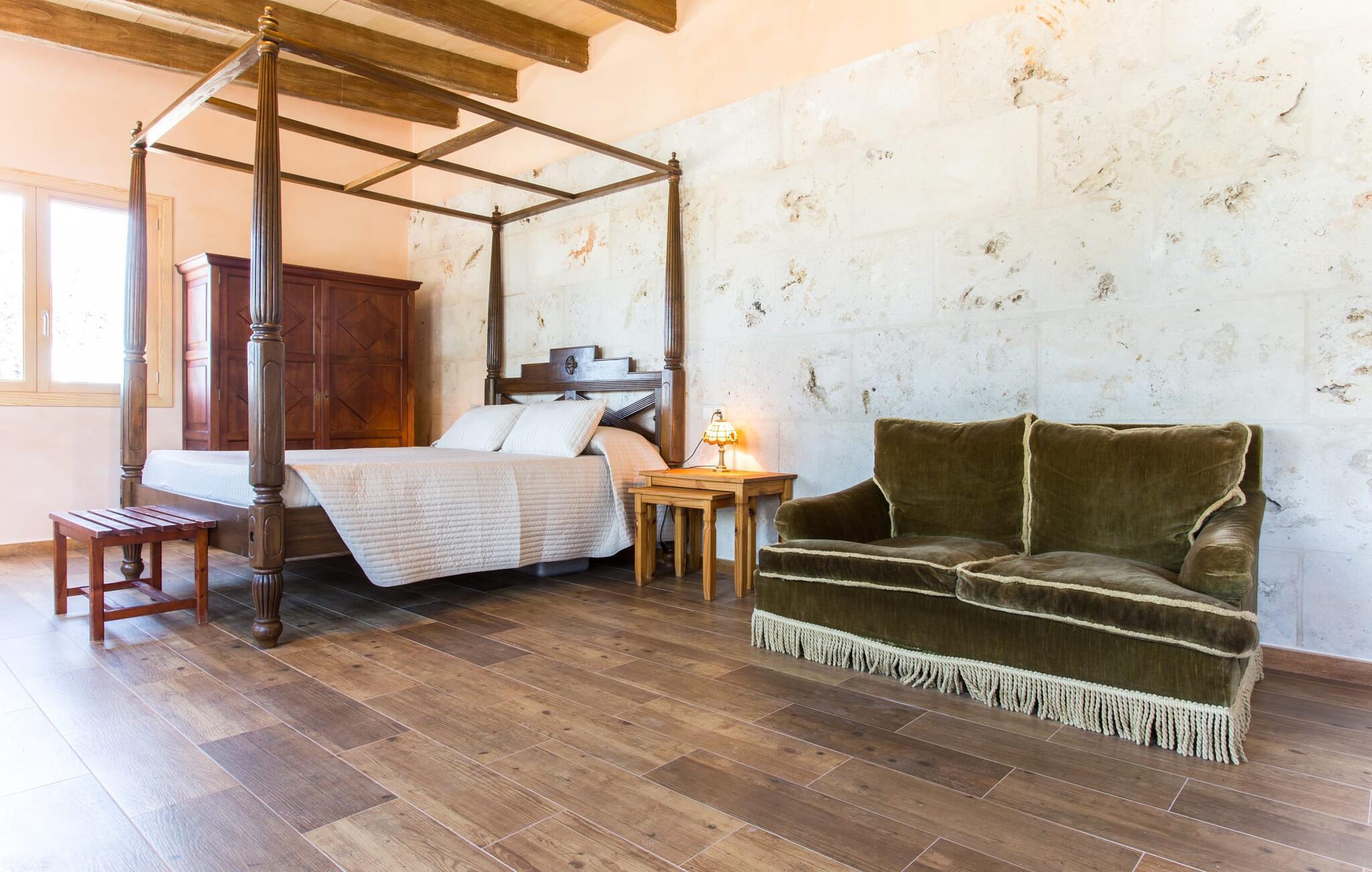 Der rustikale Charme des Ferienhauses zeigt sich in den Natursteinmauern, Holzbalken und sanften, erdigen Farben, während das Licht durch die vielen Fenster hereinfällt. Das schicke Schlafzimmer verfügt über ein Himmelbett und eine gemütliche Sitzecke mit TV und Sofa. Das eigene Bad verfügt über eine begehbare Glasdusche mit malerischer Aussicht. Die Gemeinschaftsräume der Villa bieten einen perfekten Rahmen für geselliges Beisammensein, aber die ruhige Umgebung sorgt dafür, dass Sie diesen perfekten Rückzugsort problemlos genießen können.