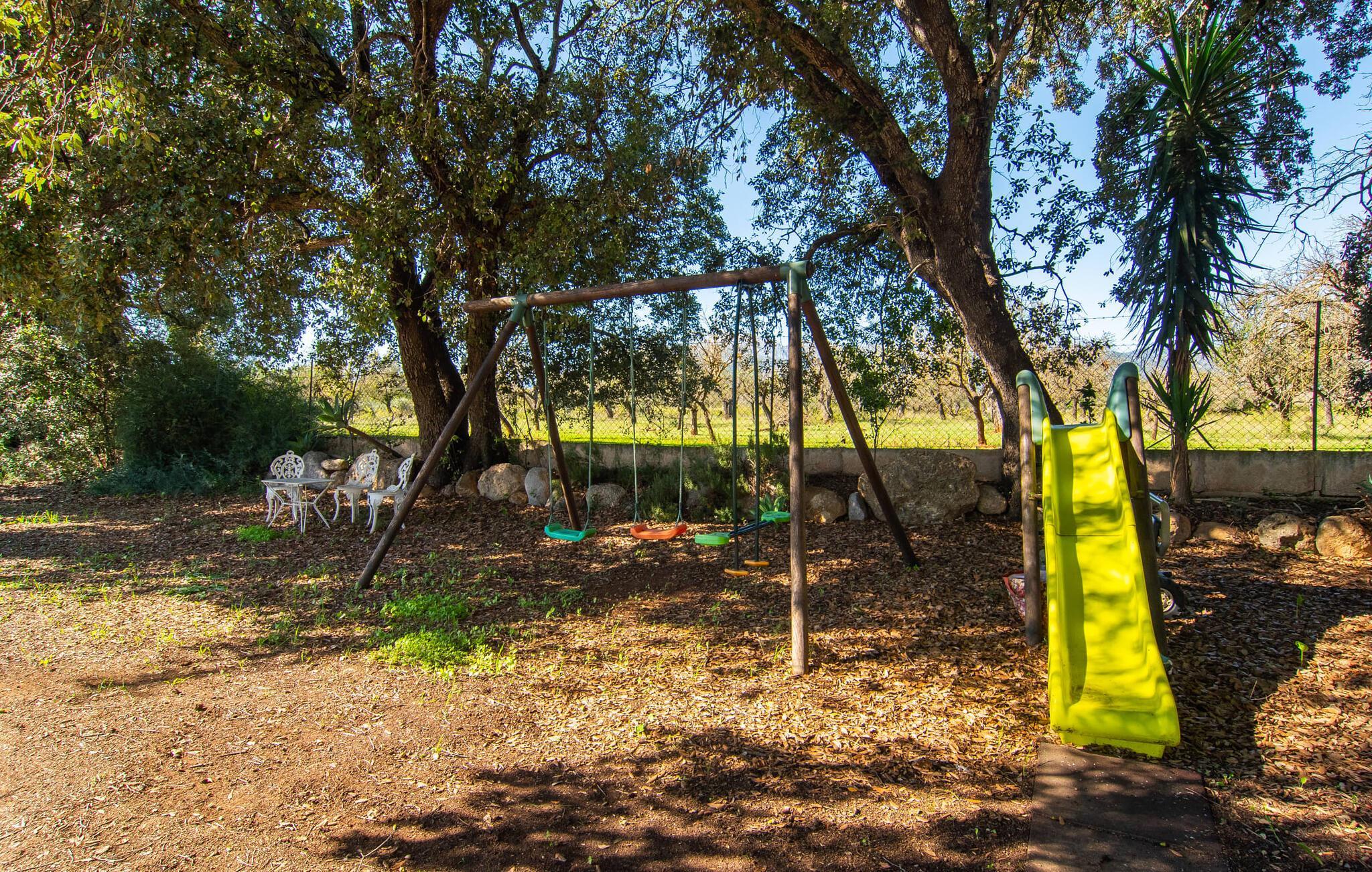 Die Umgebung dieses Bauernhauses auf Mallorca wirkt durch die üppige mediterrane Vegetation besonders einladend und gemütlich. Alte Bäume unterstreichen dieses Flair. Der Poolbereich ist von Oleandern und grünen Hecken umgeben, sodass Sie sich hier besonders privat fühlen können. Über eine römische Treppe gelangt man sehr bequem in den 8 m langen Pool. Bequem sind auch die Sonnenliegen auf der umlaufenden Terrasse. Sie können sie direkt unter dem mediterranen Himmel oder unter einem Sonnenschirm platzieren und von dort aus entspannen. Außerdem gibt es eine Sitzecke und eine praktische Außendusche. Für diejenigen, die im Schatten entspannen möchten, gibt es auf der Terrasse direkt neben dem Haus verschiedene Möglichkeiten: die Hollywoodschaukel, die Lounge, den Esstisch. Dieser hübsch dekorierte Bereich kann an warmen Tagen als Wohnzimmer im Freien genutzt werden. Für herzhafte Grillabende steht ein gemauerter Holzkohlegrill zur Verfügung. Auf dem Gelände finden die kleinen Mitreisenden nicht nur viel Platz zum Herumtollen, sondern auch einen kleinen Spielplatz.