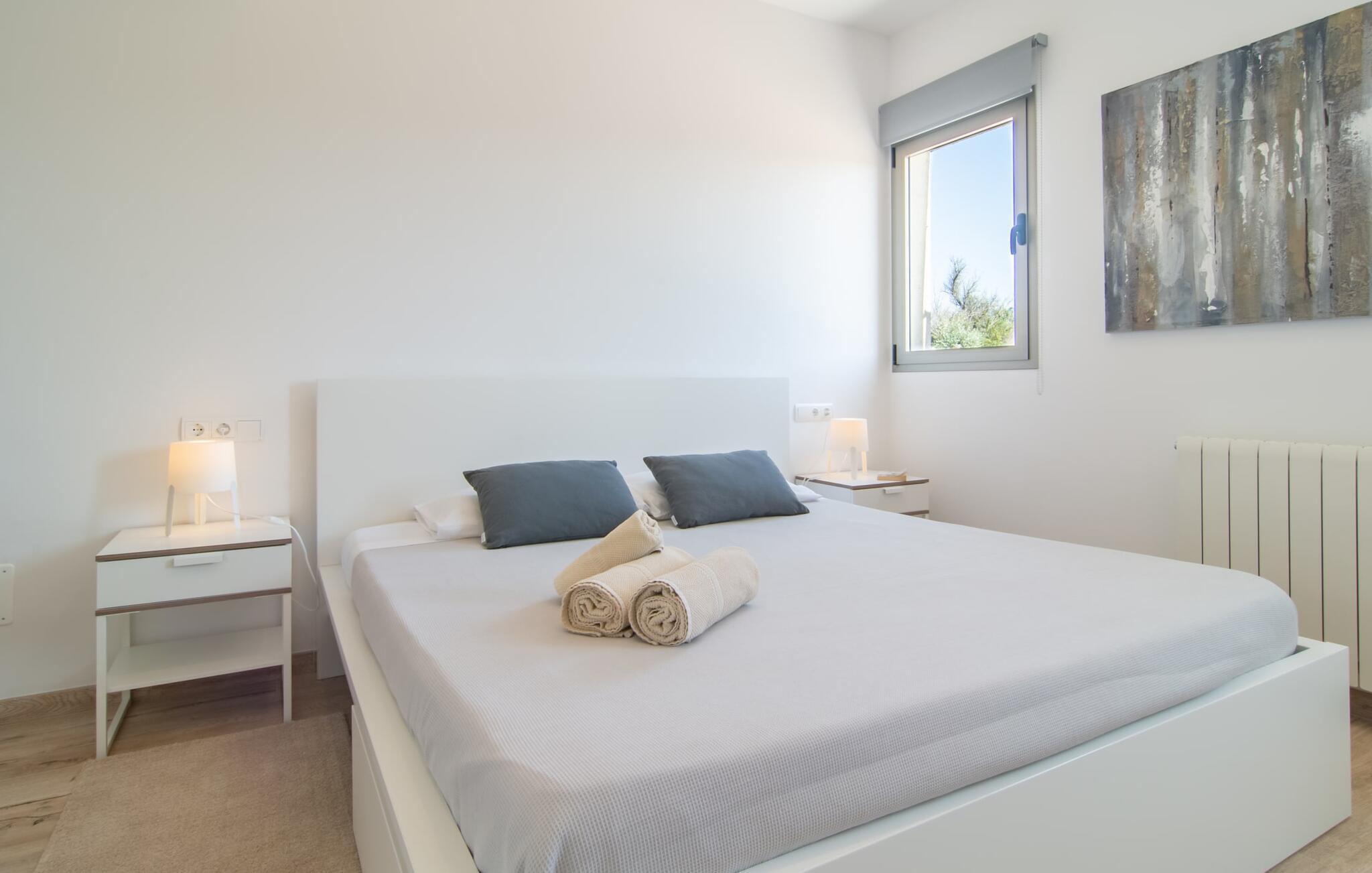 Der Innenbereich von „Sa Finca“ ist hell und offen. Besonders praktisch ist die Tatsache, dass alle Zimmer auf einer Ebene liegen: Sie müssen sich nicht an das Auf- und Absteigen von Treppen gewöhnen, was besonders praktisch ist, wenn Sie mit kleinen Kindern reisen. Die Einrichtung ist gleichermaßen schick, modern und hochwertig, dabei aber so geschickt und liebevoll ausgewählt, dass sie gleichzeitig entspannt wirkt und ein sofortiges Wohlfühlgefühl vermittelt. Weiße Wände und helle Böden im Wohn-Essbereich, der sich in die stilvoll-schicke Küche mit hochwertiger Ausstattung öffnet, sorgen für eine leichte, sommerliche Atmosphäre. Im Wohnzimmer gibt es ein herrlich gemütliches Sofa, auf dem man sich einen spannenden TV-Krimi anschauen kann. Anschließend haben Sie die Wahl zwischen drei geschmackvoll und dezent eingerichteten Schlafzimmern, die über bequeme Doppelbetten und große Schränke für Ihre Urlaubsgarderobe verfügen. Die Badezimmer sind vollständig im Einklang mit dem Rest des Hauses: neu, sehr sauber und gepflegt, mit begehbarer Dusche, großen Fenstern und schicken Waschbecken.