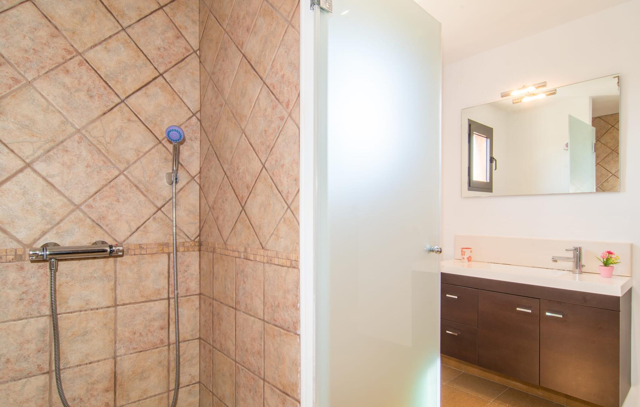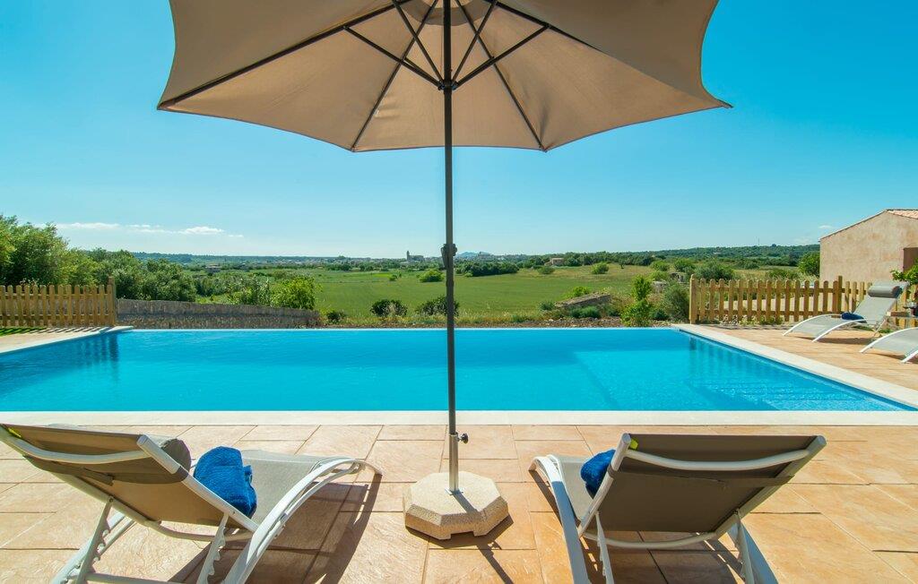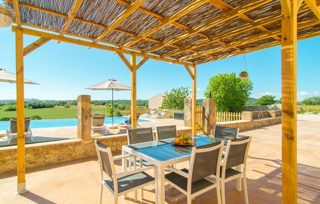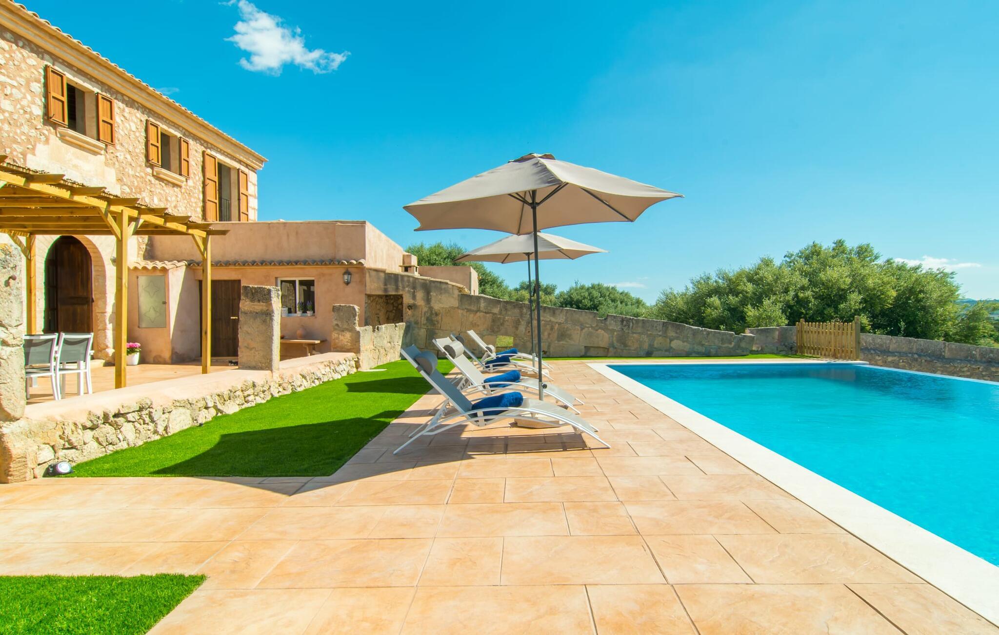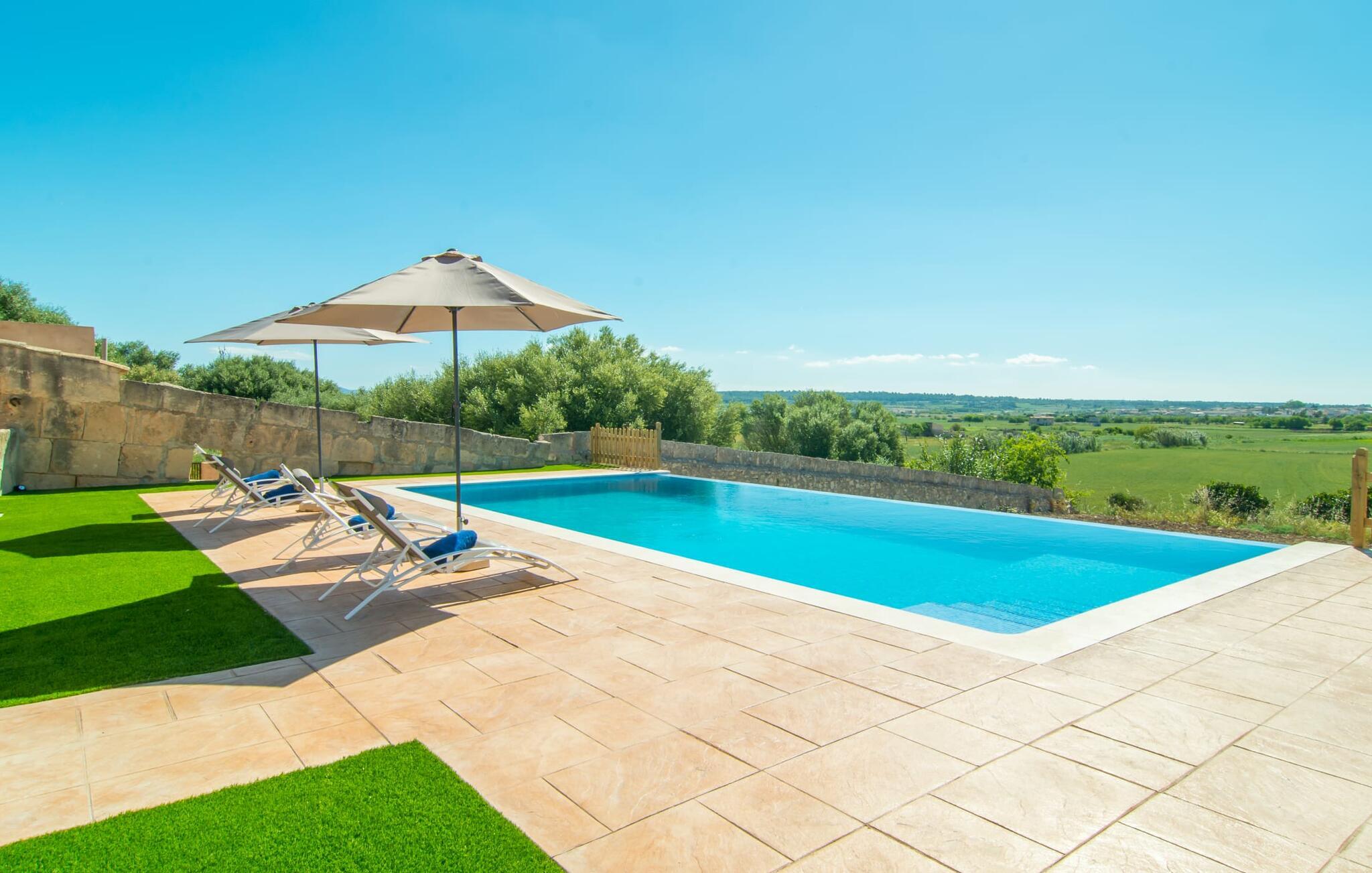 Wie aus einem Bilderbuch erhebt sich „Sa Font Authentic“ über der Ebene im Dreieck zwischen Ariany, Petra und Sineu. Es bietet atemberaubende Ausblicke auf die umliegende Landschaft – Ihr Urlaub beginnt in dem Moment, in dem Sie ankommen und einen ersten Blick auf die fantastische Naturkulisse werfen, die Sie umgibt. Das Anwesen ist herrlich weitläufig, bietet aber gleichzeitig idyllische Bereiche direkt am Haus, die einfach ein Gefühl der Behaglichkeit ausstrahlen, sodass alle, die viel Platz um sich herum mögen, genauso zufrieden sind wie diejenigen, die ein gemütliches Nest lieben Atmosphäre. Der 10 Meter lange Infinity-Pool ist die größte Attraktion im Außenbereich. Es wurde 2017 erbaut, ist mit blauen Mosaiksteinen verziert und verfügt über einen gestuften Eingang und ein tiefes Ende. Während Sie mühelos über das Becken gleiten, genießen Sie gleichzeitig eine atemberaubende Aussicht, die Sie beim Schwimmen normalerweise nicht haben. Ähnliche Panoramaerlebnisse können von der Außendusche und auf den Terrassenflächen auf beiden Etagen genossen werden. Ob Sie die Aussicht von der Liege oder dem Esstisch aus genießen, direkt unter der mallorquinischen Sonne oder unter einer Markise – Sie entscheiden!