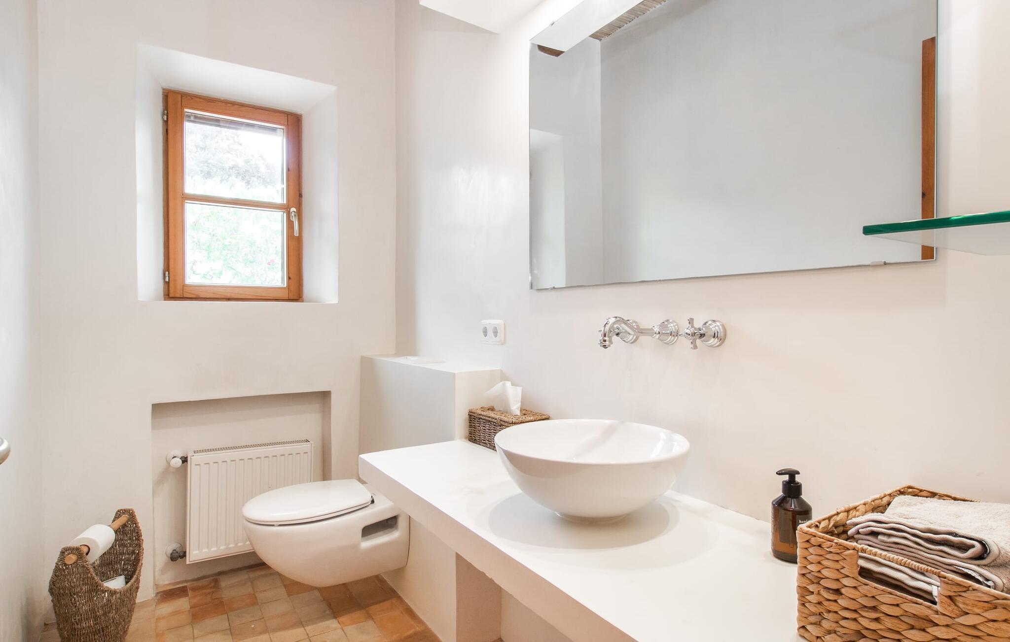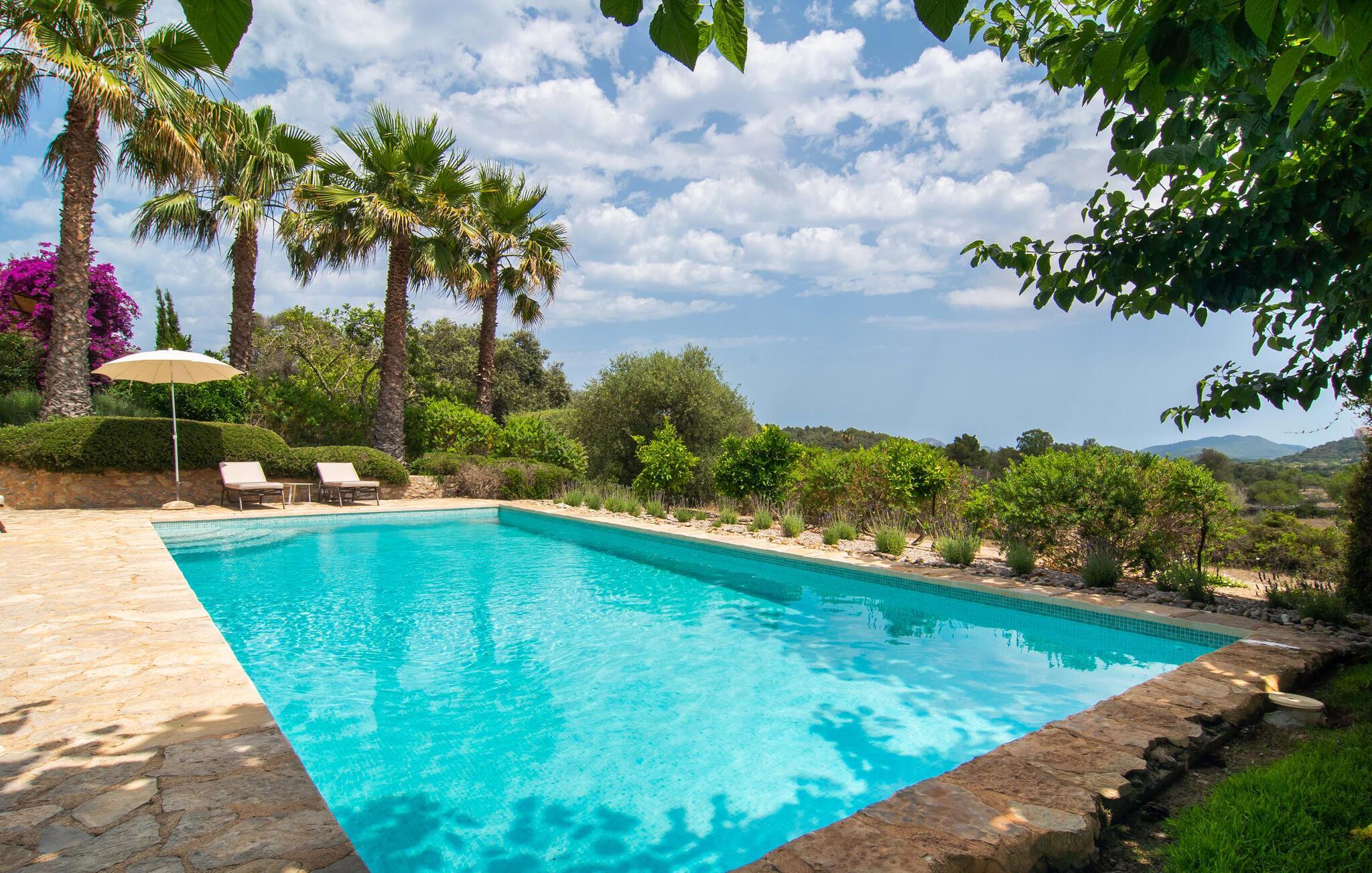 Das wunderschöne Natursteinhaus „Sa Font Calenta Fonteta“ liegt auf einem kleinen Hügel inmitten der sanften Hügellandschaft nördlich von Artá. Umgeben von einem wunderschön angelegten Garten bietet das Ferienhaus einen herrlichen Blick auf die idyllische Landschaft im Osten Mallorcas. Angrenzend an das Haus gibt es eine große überdachte Terrasse mit Essbereich im Freien und einer Sommerküche. Hier können Sie nach Lust und Laune mit Freunden oder der Familie grillen und unter freiem Himmel schlemmen. Eine weitere, halb überdachte Terrasse bietet einen zweiten, gemütlichen Essbereich umgeben von mediterranen Pflanzen. An beide Terrassen schließt sich eine gepflegte Rasenfläche an. Eine kurze Treppe führt hinunter zum Pool. Auch hier hat man einen fantastischen Ausblick auf die hügelige Landschaft. Der Poolbereich ist nach Südosten ausgerichtet und bietet viel Privatsphäre.